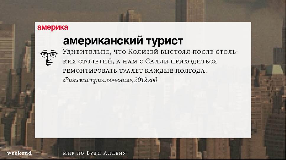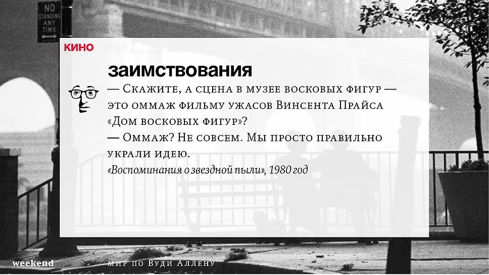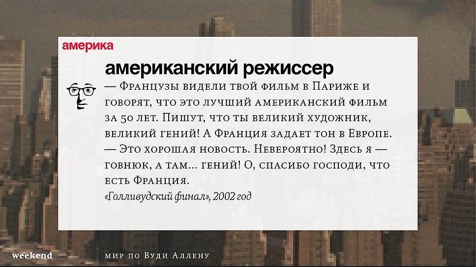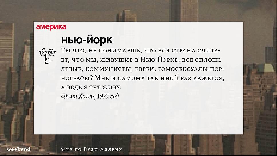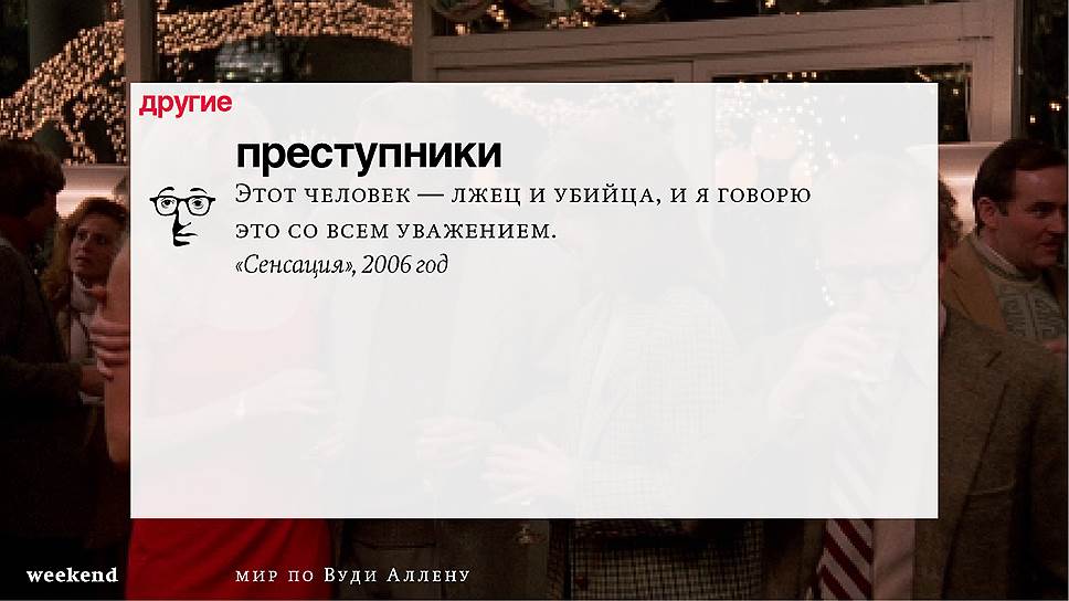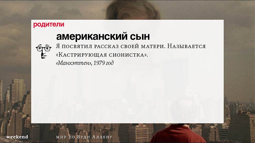 С тех пор он снял множество фильмов (среди которых несколько абсолютно прочно вошедших в списки киноклассики) и с невероятной тщательностью проработал свою территорию, занятую нью-йоркскими интеллектуалами и просто рефлексирующими евреями, их точно знающими как жить престарелыми родителями и недостижимыми, вечно ускользающими гойками. При этом в мире Аллена всегда возможны изменения и вариации — местом действия может оказаться не Нью-Йорк, а Барселона или Париж, временем — совсем не современность, главным героем — высокий блондин, в фильме даже может не случиться никаких шуток, но это всегда несомненно будет "кино Вуди Аллена".