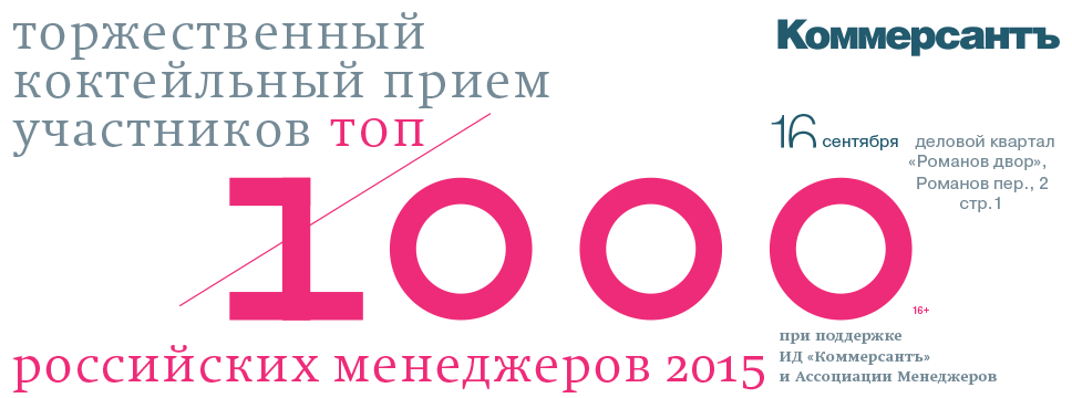 ИД «Коммерсантъ» и Ассоциация Менеджеров приглашают принять участие в торжественном коктейльном приеме для победителей Рейтинга Топ-1000 российских менеджеров 2015 года.