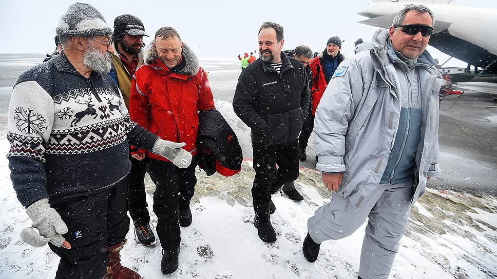 Слева направо: первый вице-президент Русского географического общества, президент Государственной полярной академии Артур Чилингаров, руководитель экспедиции Матвей Шпаро, министр образования и науки России Дмитрий Ливанов, министр природных ресурсов и экологии России Сергей Донской и заместитель председателя правительства России Дмитрий Рогозин