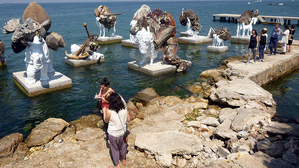 Орхан Памук, участвующий в биеннале и как художник — юношескими рисунками (он собирался стать живописцем) и тотальной инсталляцией Музея невинности, где выставлены картины армянского гения Аршила Горки,— привел куратора на остров своего детства Бююкада. Бююкада, застроенный особняками богатых греков, армян и евреев, теперь населяют призраки истории, и самый именитый из них — призрак Льва Троцкого, проведшего здесь первые четыре года изгнания. Призрака вызывают из небытия Уильям Кентридж и Адриан Вильяр Рохас. В самом роскошном отеле острова Splendid Palace показывают кентриджевскую видеоинсталляцию "О, сентиментальная машина", используя двери номеров как экраны: кадры кинохроники перемешиваются с водевилем в роомо-вертовской стилистике, где Кентридж предстает в образе пламенного трибуна перманентной революции, голова которого постепенно превращается в громкоговоритель, изрыгающий лозунги. Адриан Вильяр Рохас приводит нас в дом Троцкого: пройдя сквозь развалины виллы и дебри сада, мы спустимся к морю, чтобы увидеть химер — исполинские статуи белых, как фарфор, зверей выходят из волн, неся на спинах тела умерших собратьев вместе с грузом природного и культурного мусора. И море дарит естественный и вечный аккомпанемент этой роскошной, сюрреалистической и, увы, временной картине.