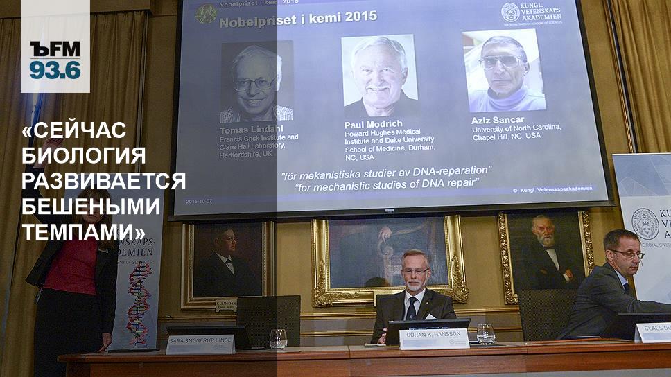 О сути открытия лауреатов Нобелевской премии по химии: «За что дали? За исследование механизма репарации или починки, ремонта ДНК. ДНК — это молекула, которая, как мы знаем, несет наследственную информацию в нашем организме, когда клетки делятся, они производят свои идентичные копии именно по лекалу, которым является ДНК. Когда от двух родителей, когда сливаются две клетки материнская и отцовская, возникает оплодотворенная яйцеклетка, из нее потом развивается целый человеческий организм опять же по лекалу, которым является ДНК, состоящая из одной спирали отцовской, одной материнской. И это лекало, эта молекула, очень длинная полимерная молекула ДНК как и, в общем, любая молекула, может повреждаться благодаря воздействию окружающей среды. Например, если излучение взаимодействует с этой молекулой, грубо говоря, рентгеновский квант попадает в эту молекулу, выбивает из нее какой-то атом. Химическое видоизменение ДНК — то что называется «мутация». Мутировавшая ДНК производит не совсем идентичные копии самой себя, а копии с несколько измененными свойствами. В большинстве случаев мутация — это изменение к худшему. В некоторых случаях это изменение к лучшему, но все же редко. В большинстве случаев мутация — это плохо.