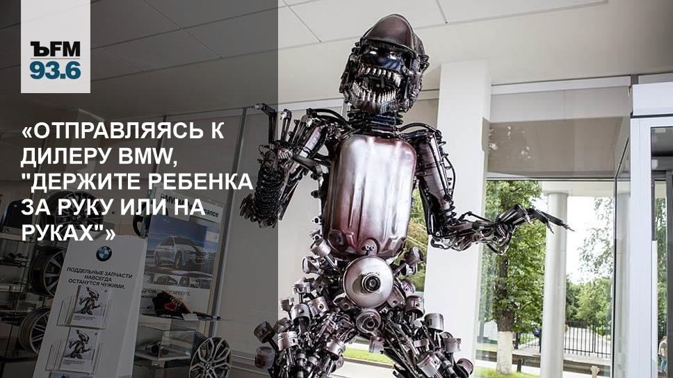 Если вы в ближайшее время планируете нанести визит в один из дилерских центров BMW и собираетесь взять с собой детей, то настоятельно рекомендуем «держать их за руки или на руках». Дело в том, что у них есть шанс не на шутку испугаться. Потому что у дилера их может встретить не только приветливый менеджер, но и весьма недружелюбная скульптура «Чужого», героя одноименного фильма Ридли Скотта. Металлическая фигура выполнена в полный рост. У нее есть угрожающая морда с зубами, хвост… Но если побороть страх, подойти и присмотреться, то можно увидеть, что зубы и когти существа сделаны из свечей зажигания, крестец позвоночника — из корзины сцепления, а из бедер торчат поршни двигателя.