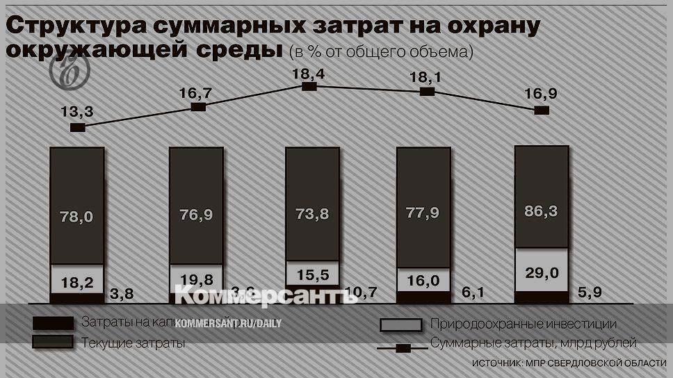 Согласно докладу свердловского минприродресурсов, металлургические производства в регионе в 2014 году направили на природоохранные мероприятия 4,94 млрд руб. (в 2013 году — 5,37 млрд руб.), производители транспорта — 408,2 млн руб. (в 2013 году — 648,2 млн руб.), горнодобывающие предприятия — 1,26 млрд руб. (в 2013 — 1,23 млрд руб.). Финансирование природоохранных мероприятий осуществляется из собственных средств, снижение произошло в связи с сокращением объемов производства: по данным Свердловскстата, на 5–17% по промышленным отраслям. Суммарно свердловские организации перечислили 944,5 млн руб. в бюджеты всех уровней за негативное воздействие на окружающую среду. Насколько вырастут инвестиции в экологию и объем выплат за ущерб окружающей среде после начала действия НДТ, пока неизвестно, так как пока что законопроект остается рамочным.