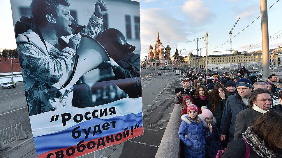 В субботу в Москве прошел марш памяти Бориса Немцова. Шествие, начавшееся на Страстном бульваре, завершилось на Большом Москворецком мосту, где год назад киллер застрелил политика. Фактически, таких массовых акций, способных объединить все оппозиционные силы, в Москве не было уже год. По оценкам МВД, шествие собрало около 7,5 тыс. человек, хотя сами организаторы говорят о 25 тыс. человек. За тем, как знакомые и соратники почтили память Бориса Немцова, наблюдал “Ъ”.