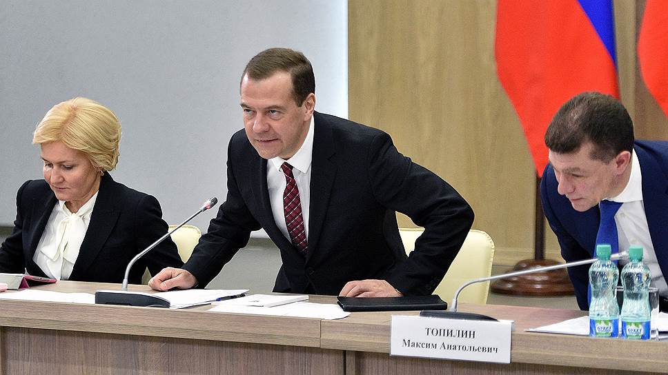 Заместитель председателя правительства России Ольга Голодец, председатель правительства России дмитрий Медведев и министр труда и социальной защиты России Максим Топилин
