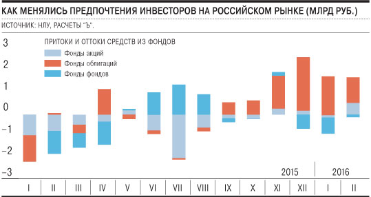 При этом на рынке сложилась редкая для последних месяцев ситуация: в числе наиболее популярных фондов оказались фонды акций. Объем вложенных средств в фонды данной категории превысил 550 млн руб. Участники рынка объясняют поведение пайщиков также достижением российскими фондовыми индексами локальных максимумов. Фондовый индекс ММВБ вырос за февраль на 3,2%, до 1840 пунктов — максимума с ноября прошлого года. По словам управляющего директора "Сбербанк Управление активами" Евгения Линчика, инвесторы склоняются к мнению, что дно по экономике уже пройдено и дальше начнется медленное восстановление. "Инвесторы постепенно начинают менять отношение к российским эмитентам, несмотря на то что экономическая конъюнктура остается слабой. Российские компании адаптировались к кризису, что видно из динамики корпоративных прибылей, которые в 2015 году выросли на 48% по сравнению с предыдущим годом",— отмечает директор департамента управления активами "Альфа Капитала" Виктор Барк. Восстановлению интереса инвесторов к фондам акций способствует и их высокая доходность. По данным НЛУ, доход крупных фондов акций в прошлом году составил 20-52% и уже 7-13% с начала 2016 года. "Российский рынок акций продолжает расти вслед за девальвацией, за восстановлением цен на нефть, а вместе с ним растет и доходность фондов. Инвесторы уже не могут игнорировать этот рост, жадность начинает постепенно побеждать осторожность",— отмечает начальник управления продаж и маркетинга "Райффайзен Капитала" Константин Кирпичев.