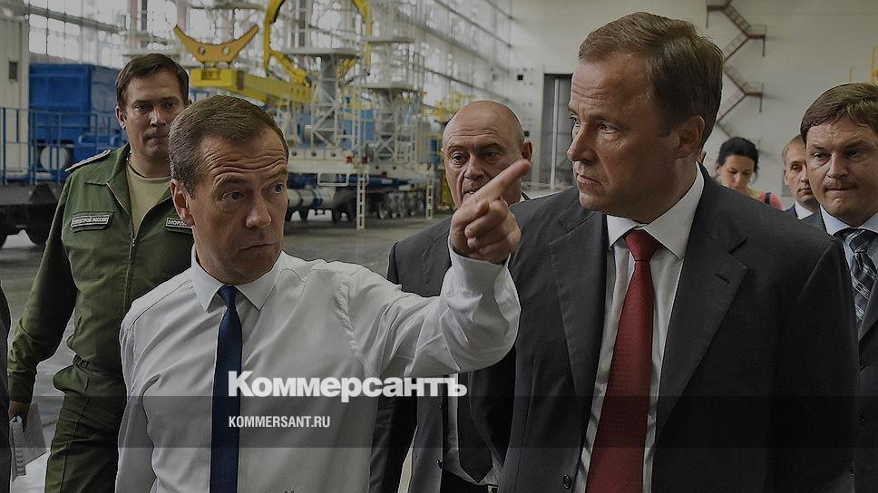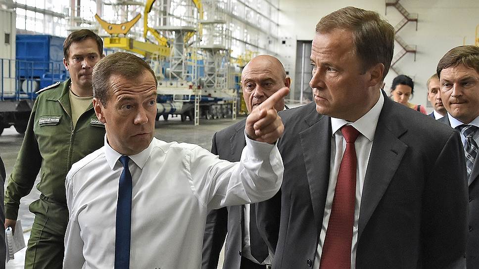 Председатель правительства России Дмитрий Медведев (слева) и директор "Роскосмоса" Игорь Комаров (справа)