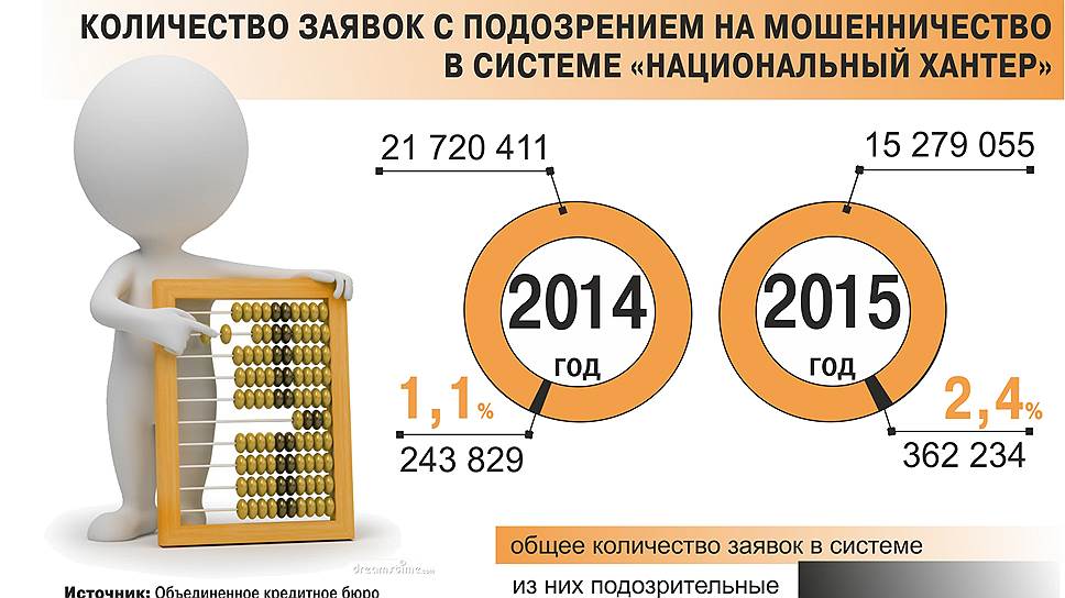 По данным исследования Объединенного кредитного бюро (ОКБ), в 2015 году на 50% выросло количество подозрительных заявок на получение кредитов, поданных в российские кредитные организации. «Наблюдался всплеск попыток мошенничества на кредитном рынке, что характерно для периодов экономической нестабильности», — отмечает генеральный директор ОКБ Даниэль Зеленский. Исследование основывается на анализе данных системы противодействия кредитному мошенничеству на межбанковском уровне «Национальный Хантер». По данным ОКБ, если в 2014 году было зафиксировано 244 тыс. заявок с признаками мошенничества, то в 2015 году их стало 362 тыс. При этом общий поток кредитных заявок, по данным ОКБ, сократился на 30%, что свидетельствует об активизации мошенников и общем ухудшении качества заемщиков.