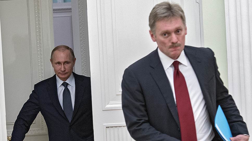 Президент России Владимир Путин (слева) и его пресс-секретарь Дмитрий Песков (справа)