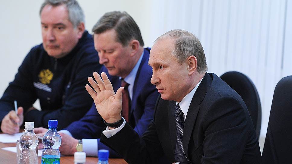 Курирующий строительство космодрома вице-премьер РФ Дмитрий Рогозин (слева), глава администрации президента Сергей Иванов (в центре) и президент России Владимир Путин