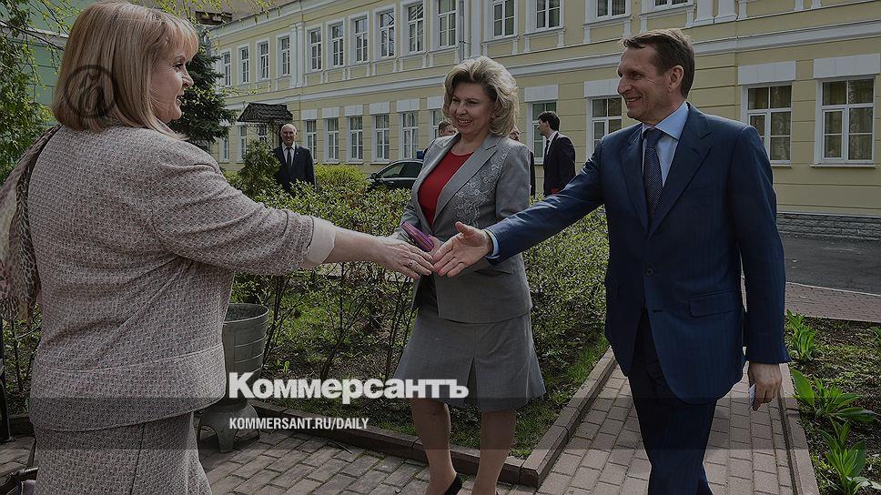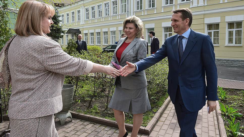 Председатель Центральной избирательной комиссии (ЦИК) России Элла Памфилова (слева), председатель Государственной думы России Сергей Нарышкин (справа) после представления в должности нового уполномоченного по правам человека в России Татьяны Москальковой (в центре)