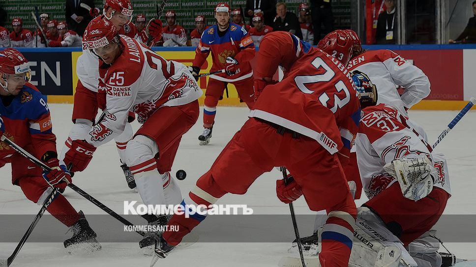 Игрок сборной России Александр Бурмистров (справа) в борьбе за шайбу с защитниками Дании