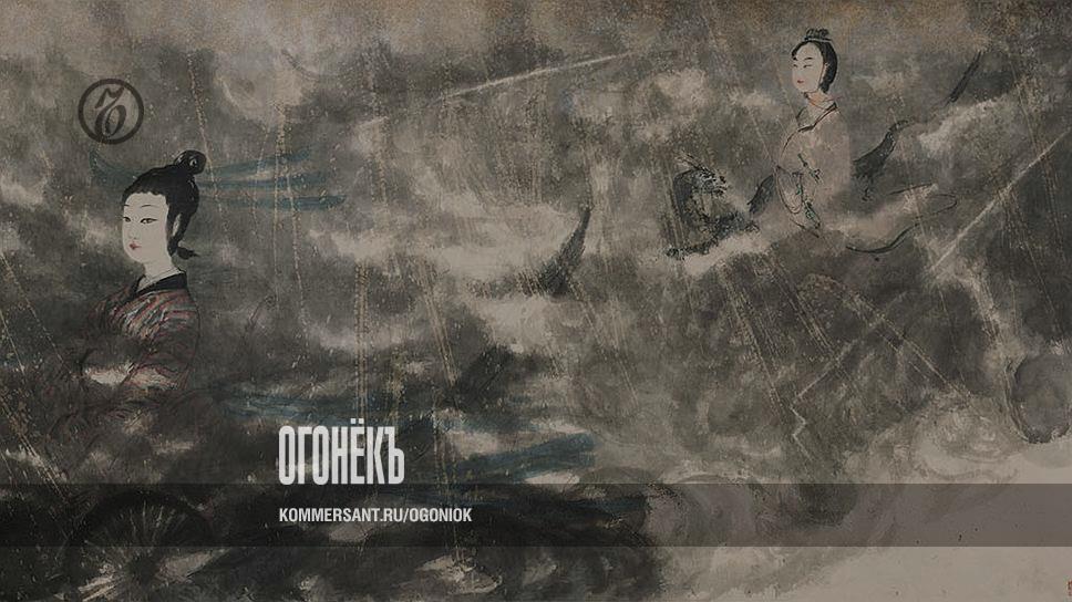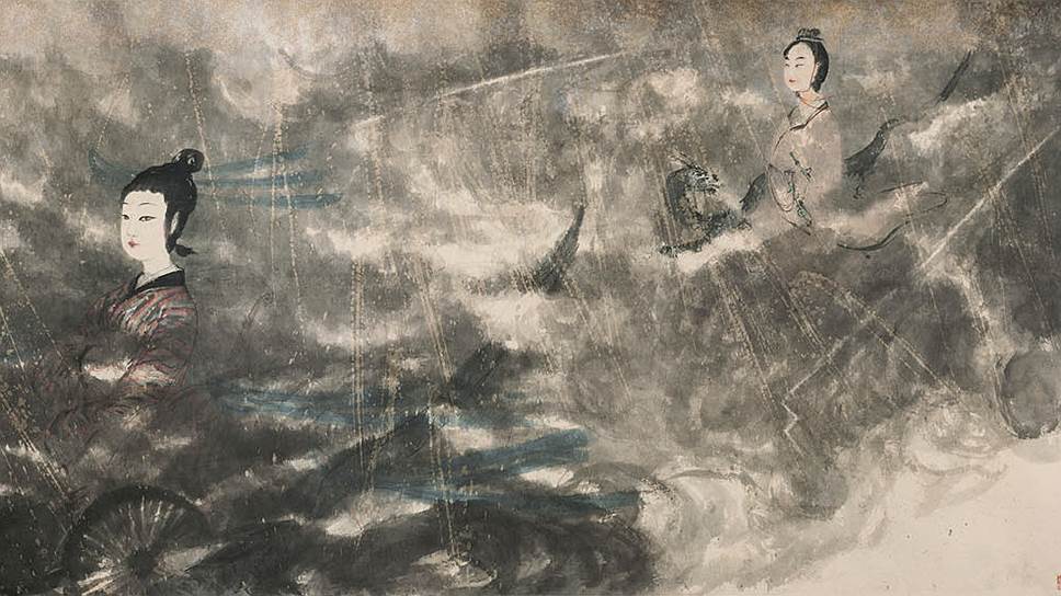 Картина называется "Бог дождя и великий бог судьбы". Если вам покажется, что бог дождя — женщина, не удивляйтесь, так и есть. Оба — герои "Чуских строф" первого из великих поэтов Китая, Цюй Юаня, и они то ли любят друг друга, то ли любят — и ссорятся; а что вы хотите, если одно божество задумчиво решает, сколько жить человеку, а другое тем временем насылает на человека облака и молнии...