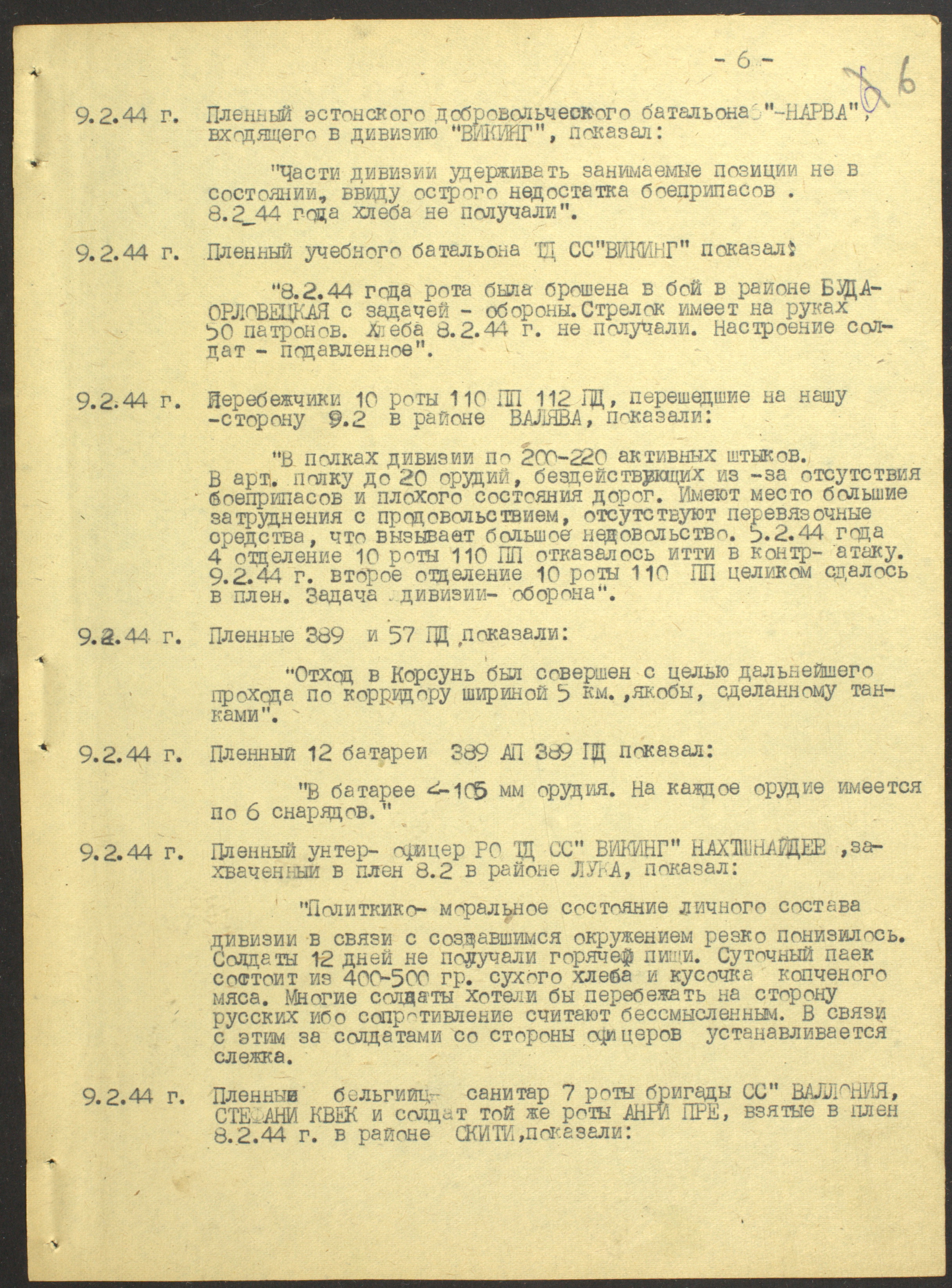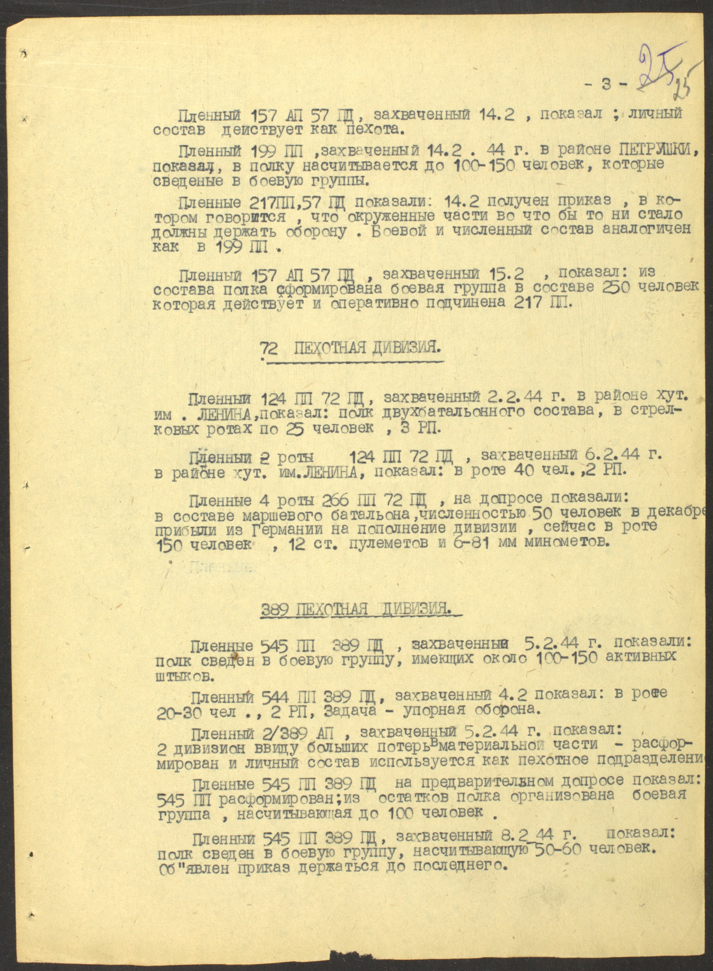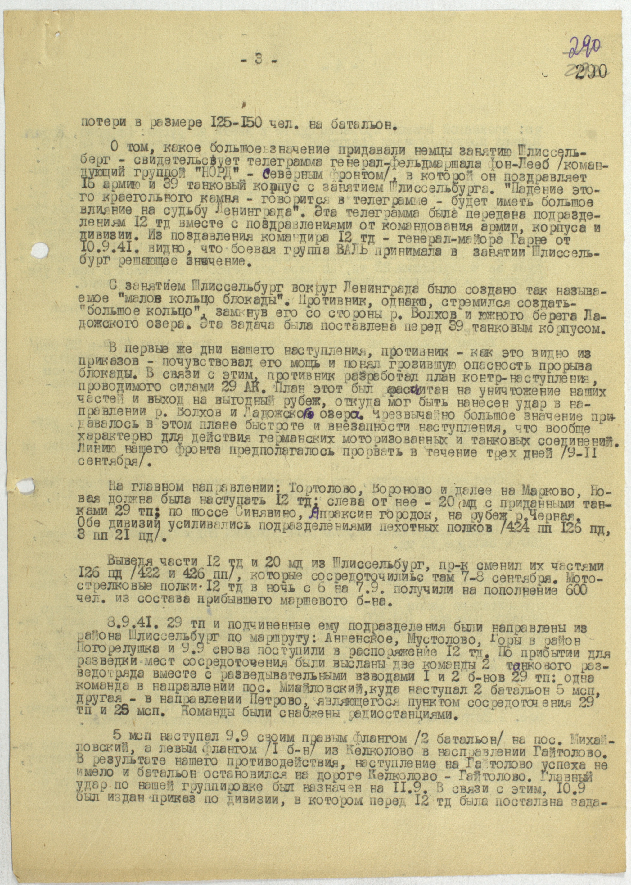 Сводка разведуправления о потерях дивизий 18-й армии (AOK 18) с 15 января по 10 февраля 1944 г.
