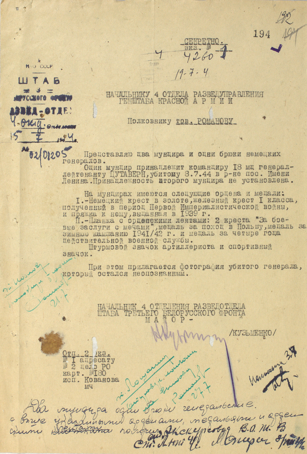 Фото неопознанного убитого немецкого генерал-лейтенанта 1944 г. и сопроводительная записка ГРУ.