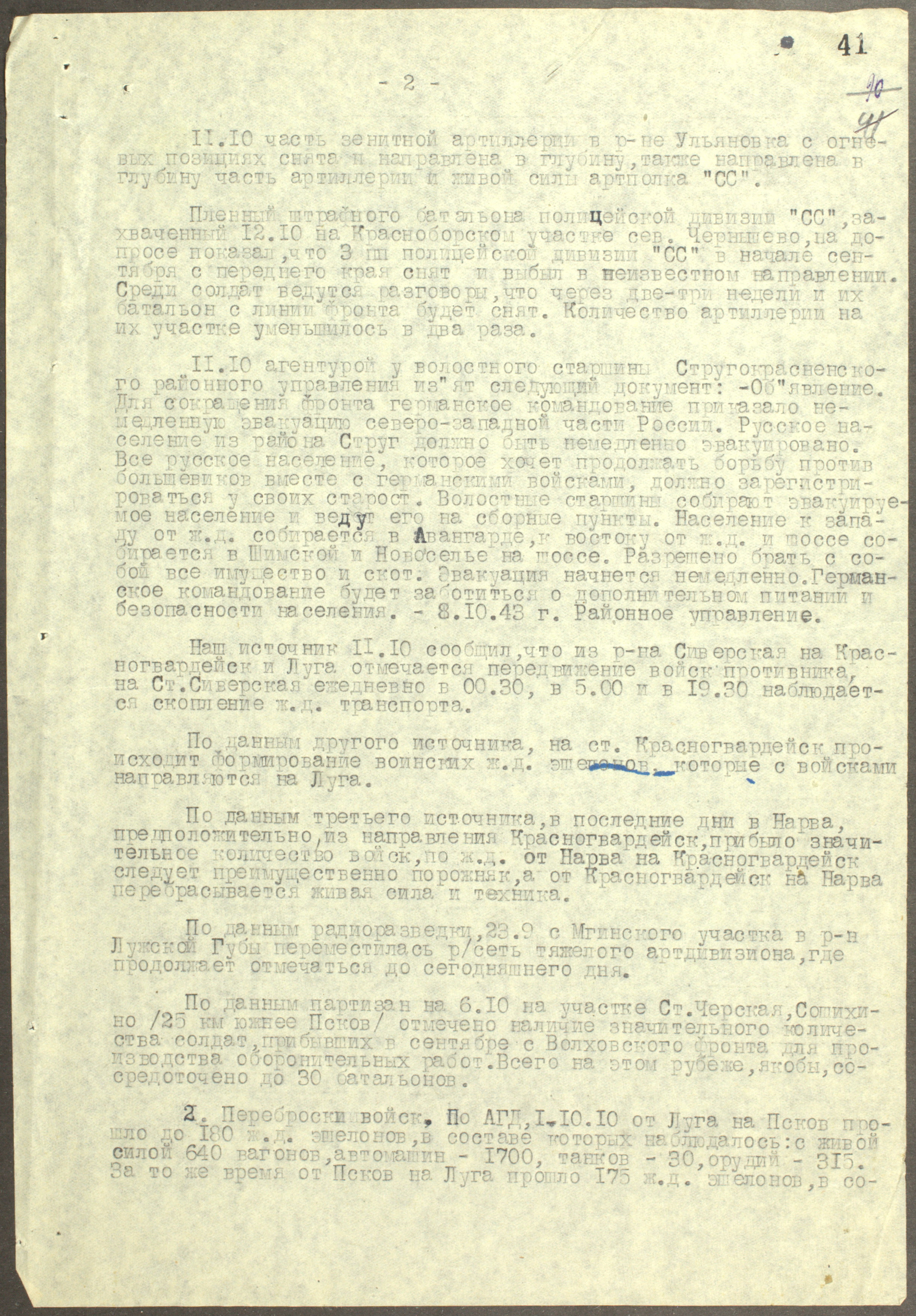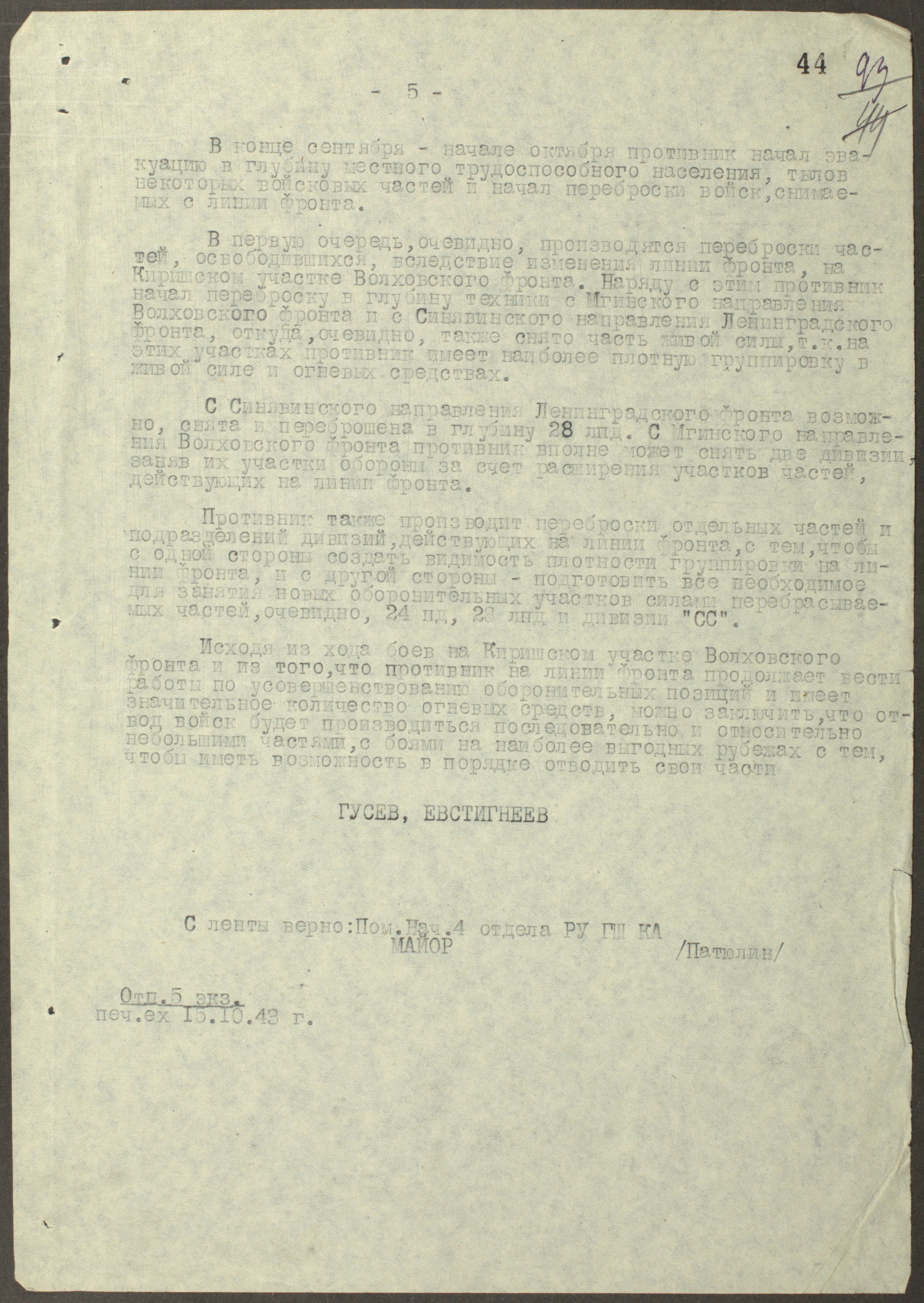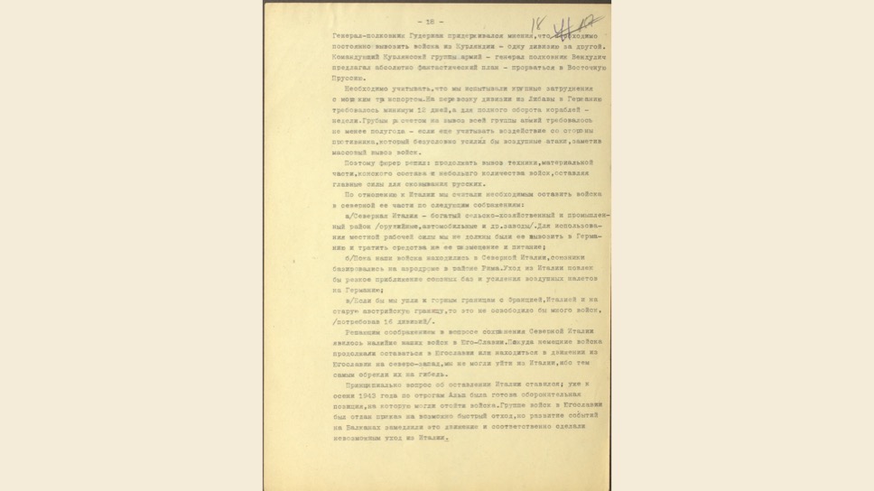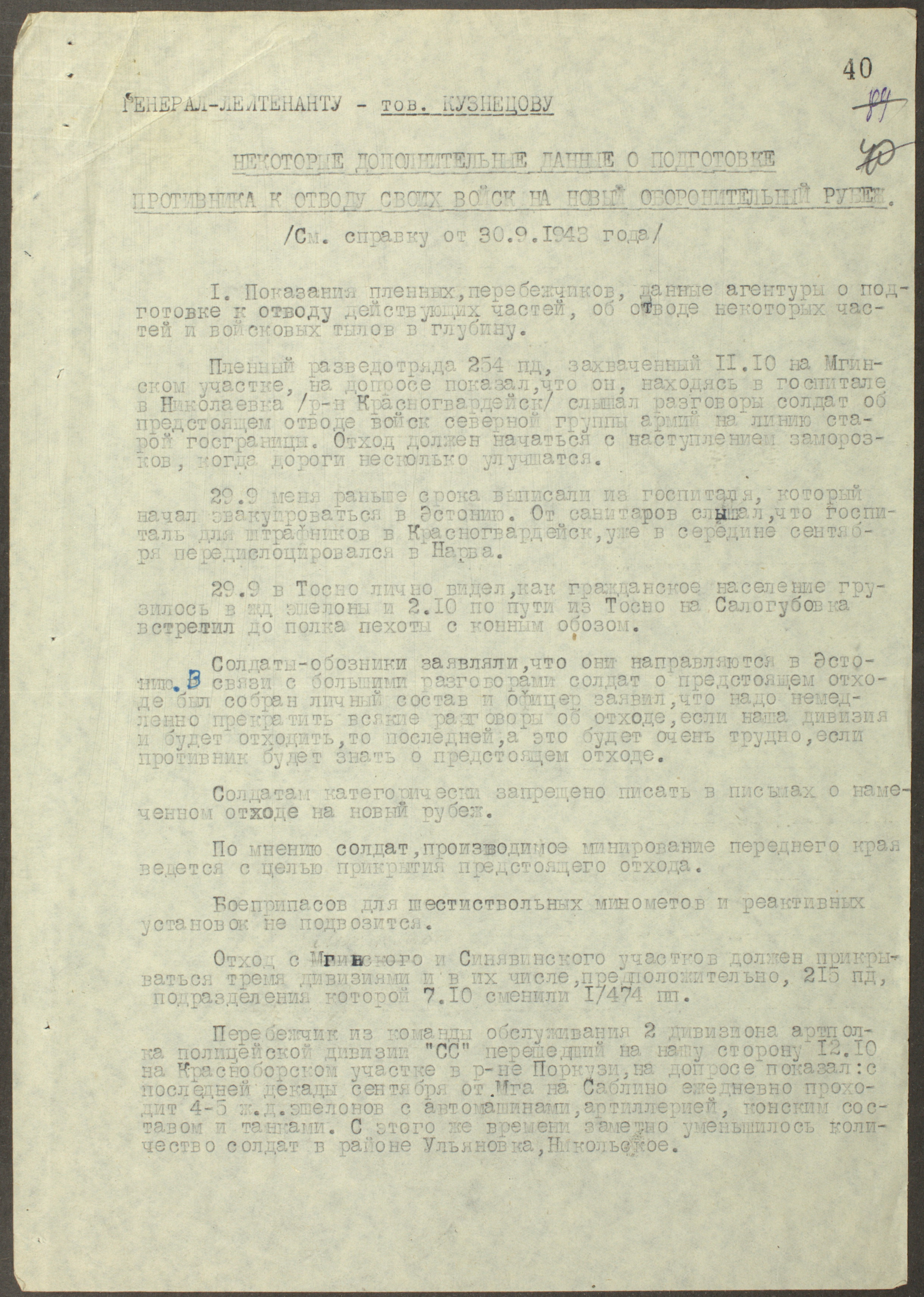 Донесение генерал-лейтенанту Кузнецову о подготовке немецких войск к отступлению — конец 1943 г.
