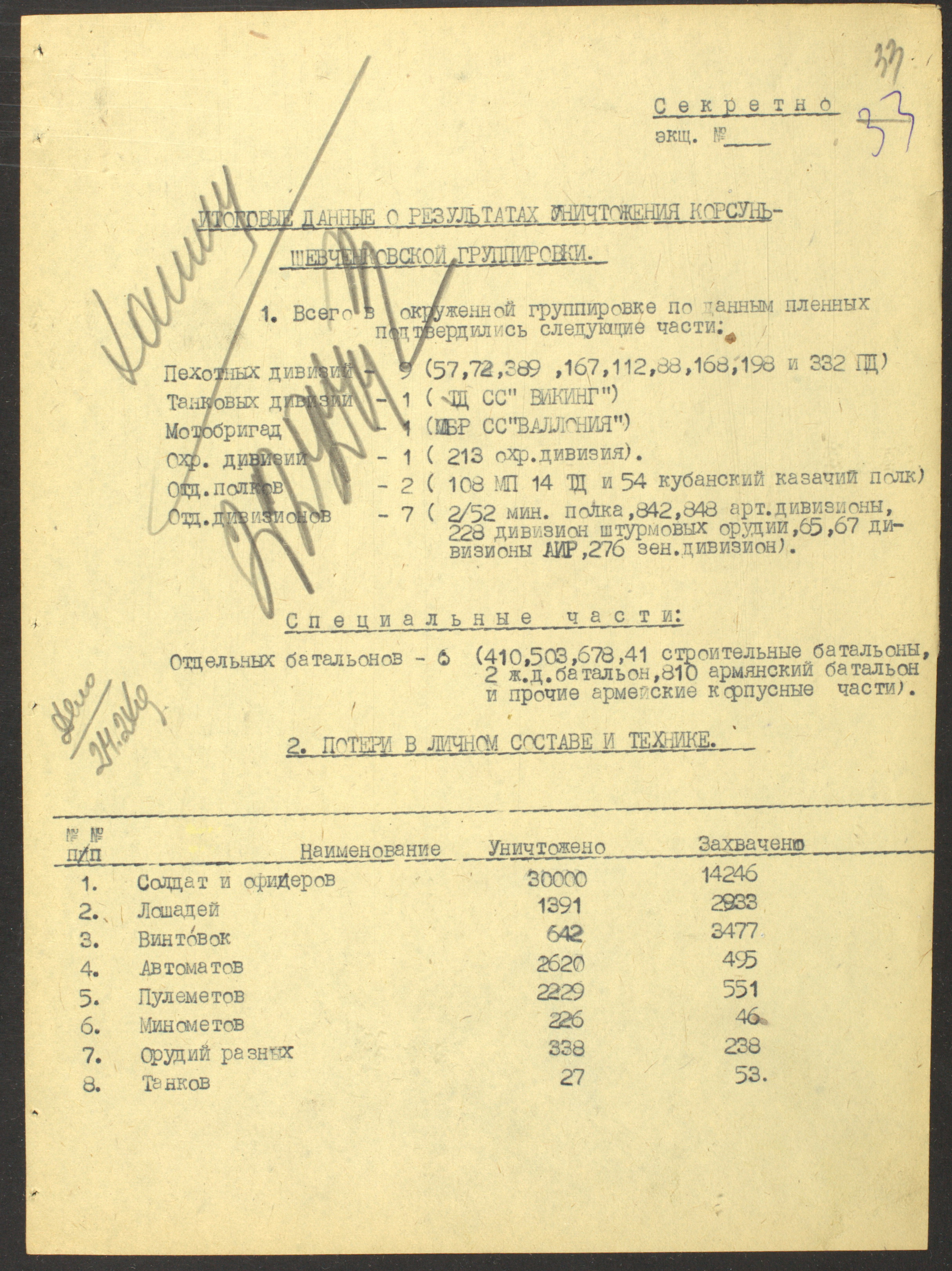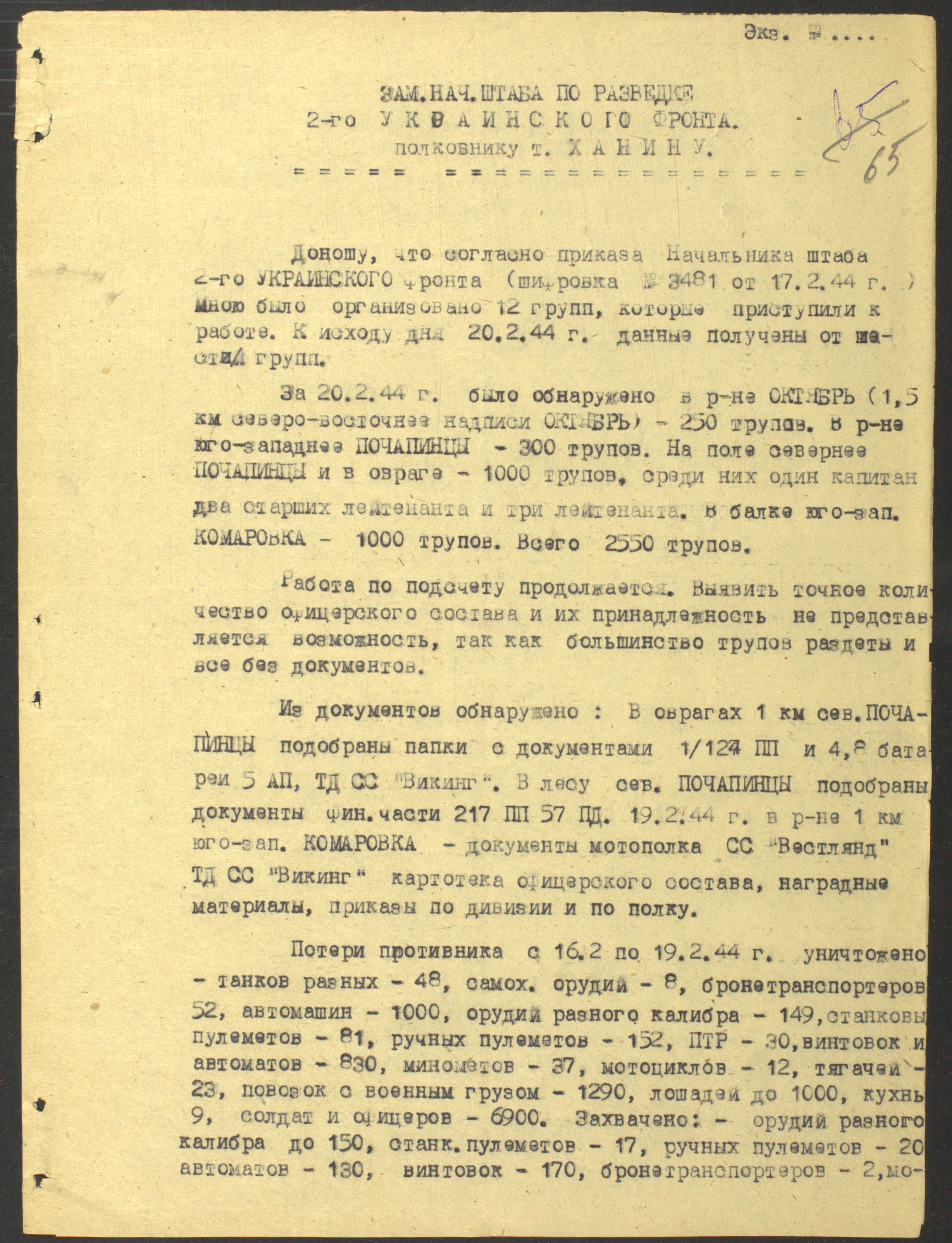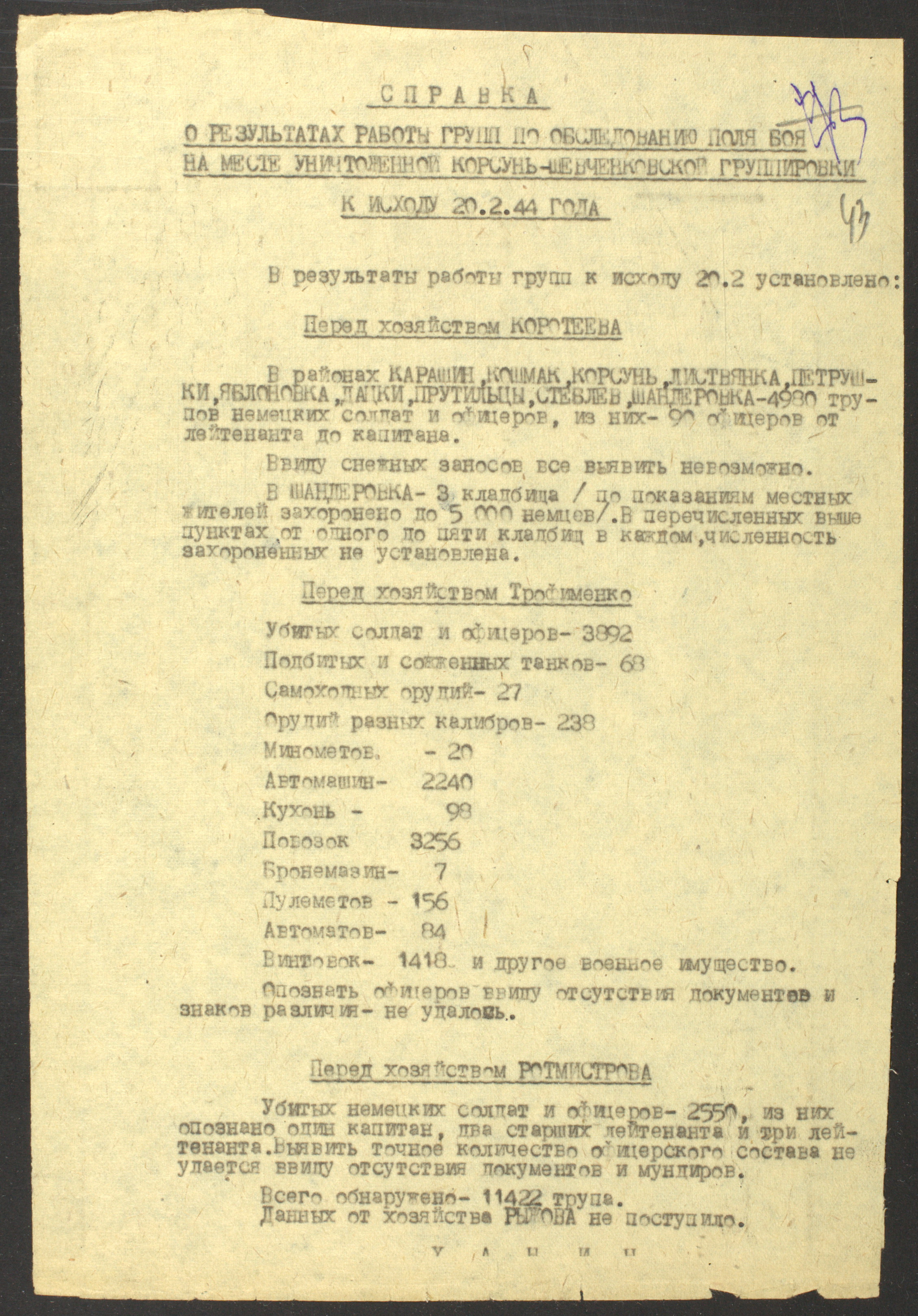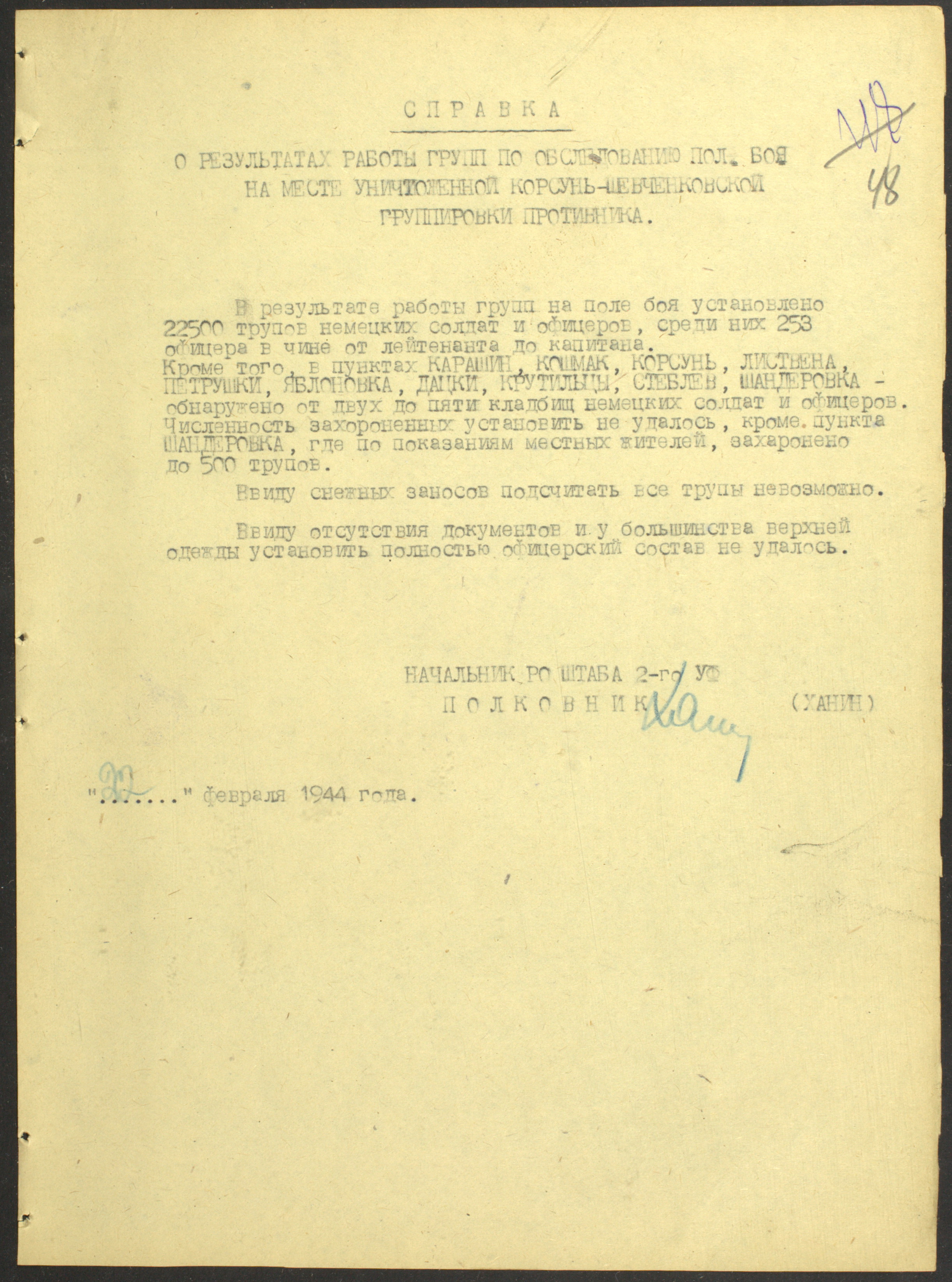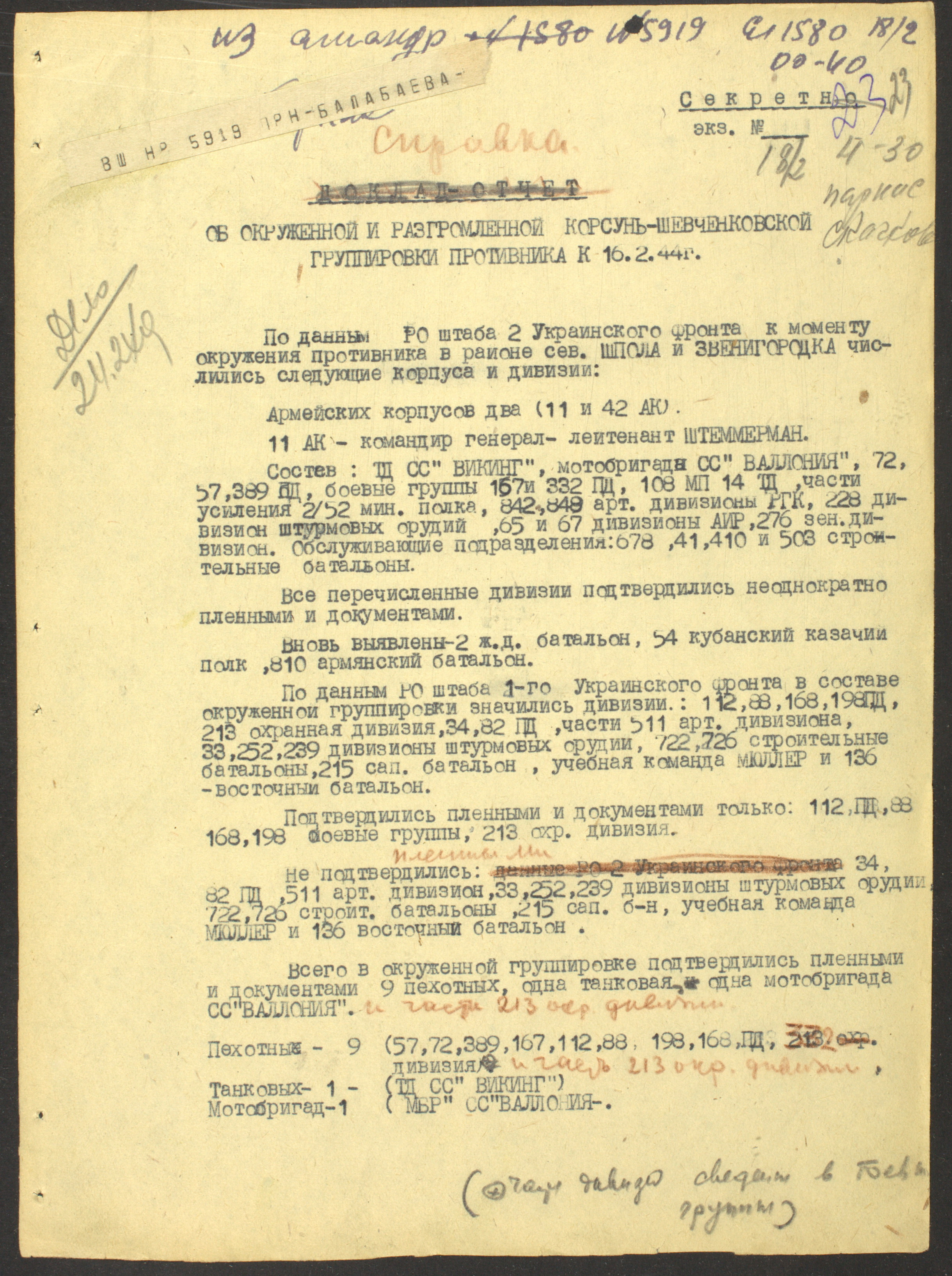 Документы Разведывательного отдела штаба 2-го Украинского фронта: итоговые данные о результатах уничтожения немецких войск в Корсунь-Шевченковском районе, данные о количестве военнопленных и трофеях, данные об обнаружении трупа генерал-лейтенанта Штеммермана, сведения о количестве убитых с немецкой стороны