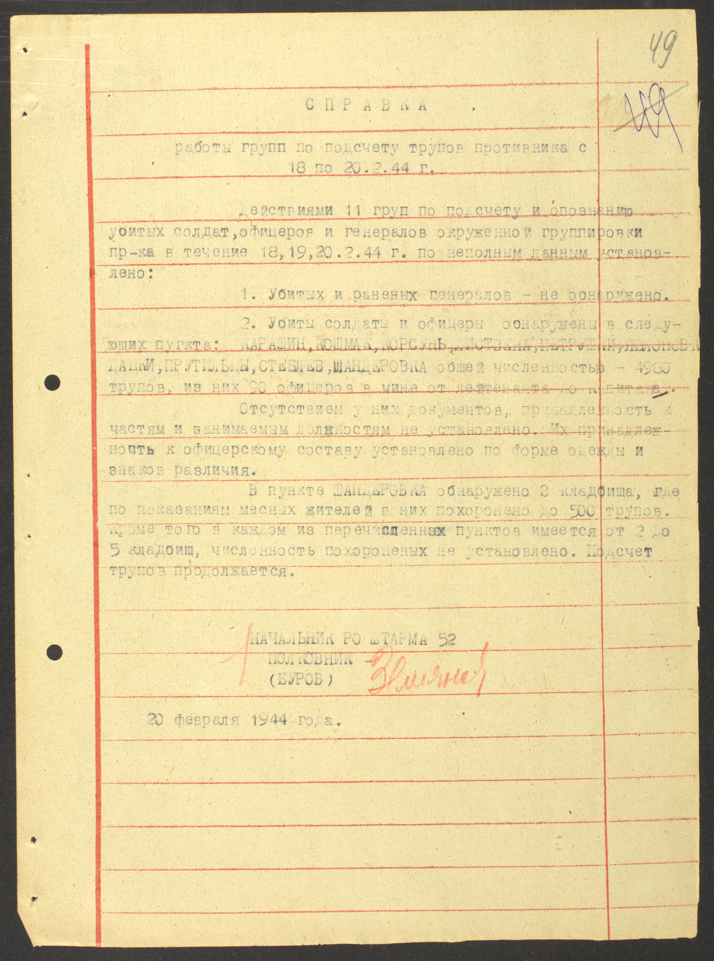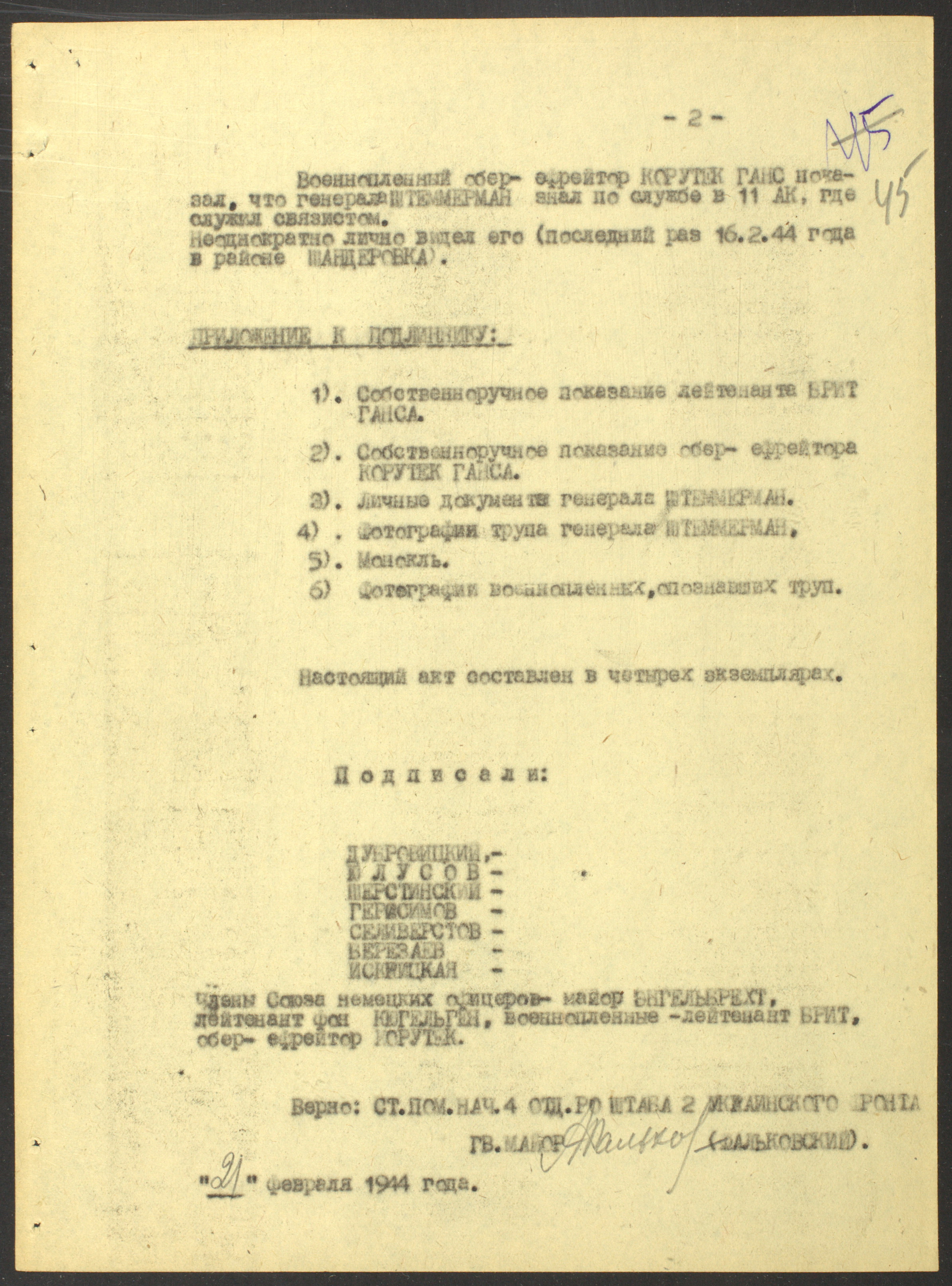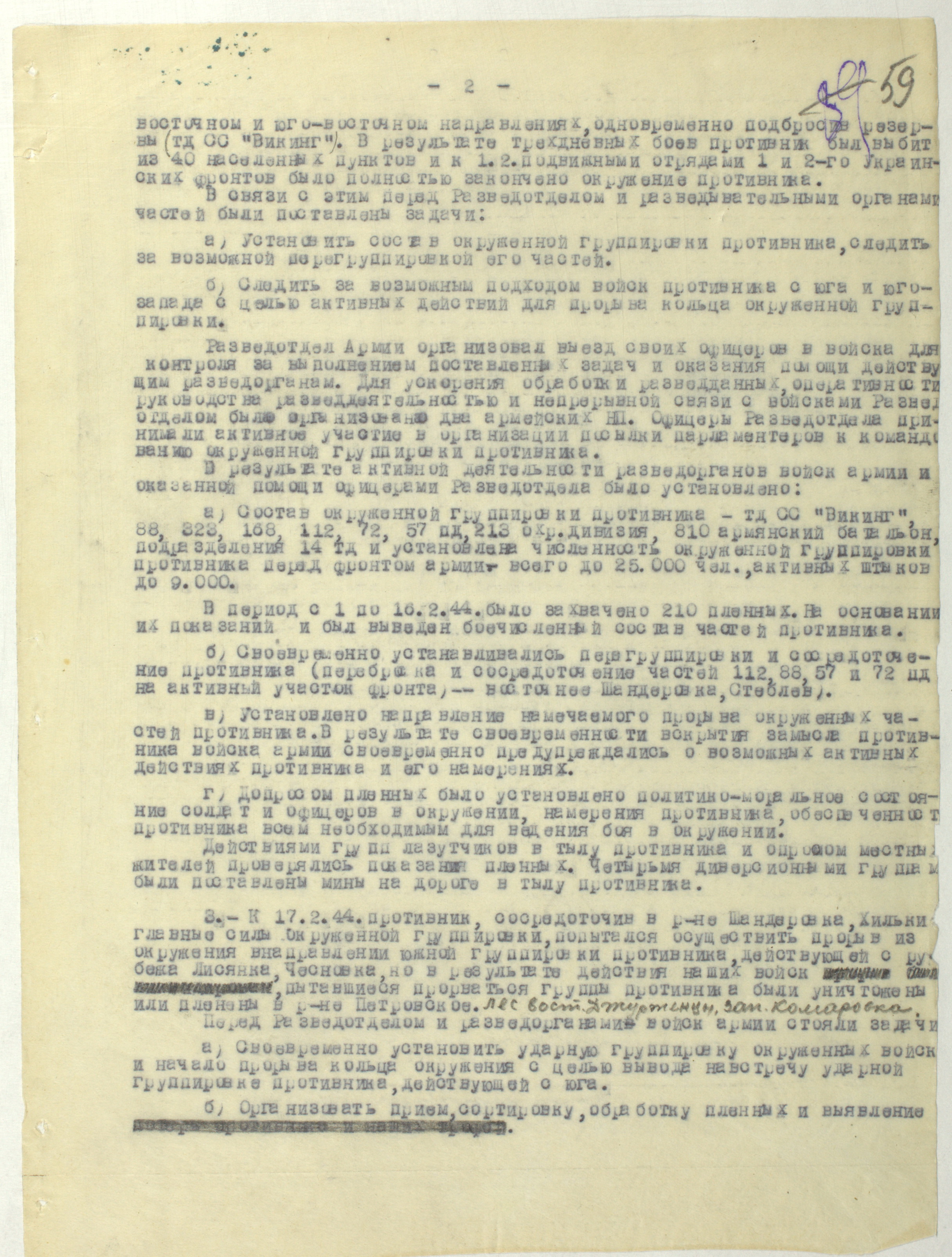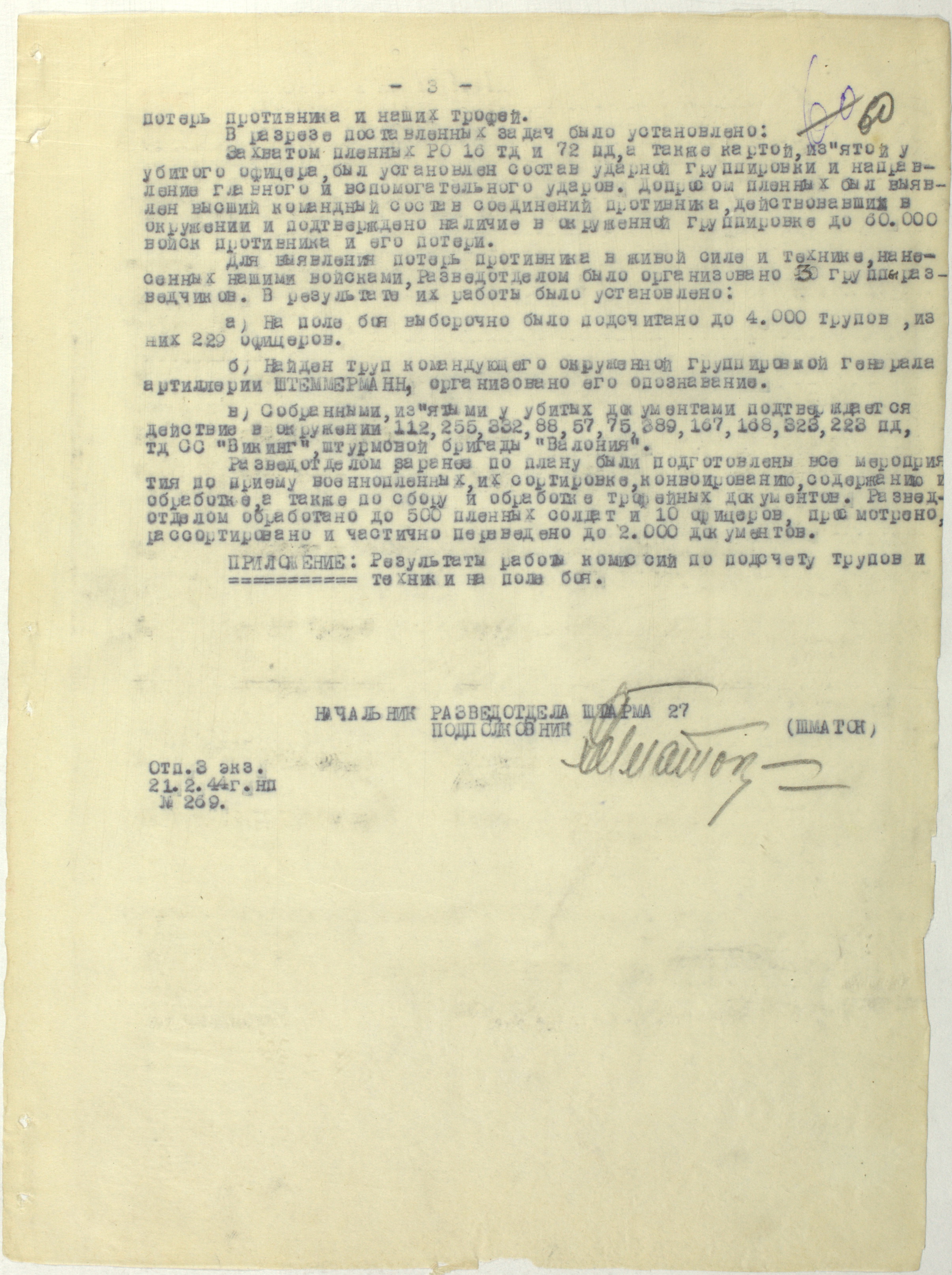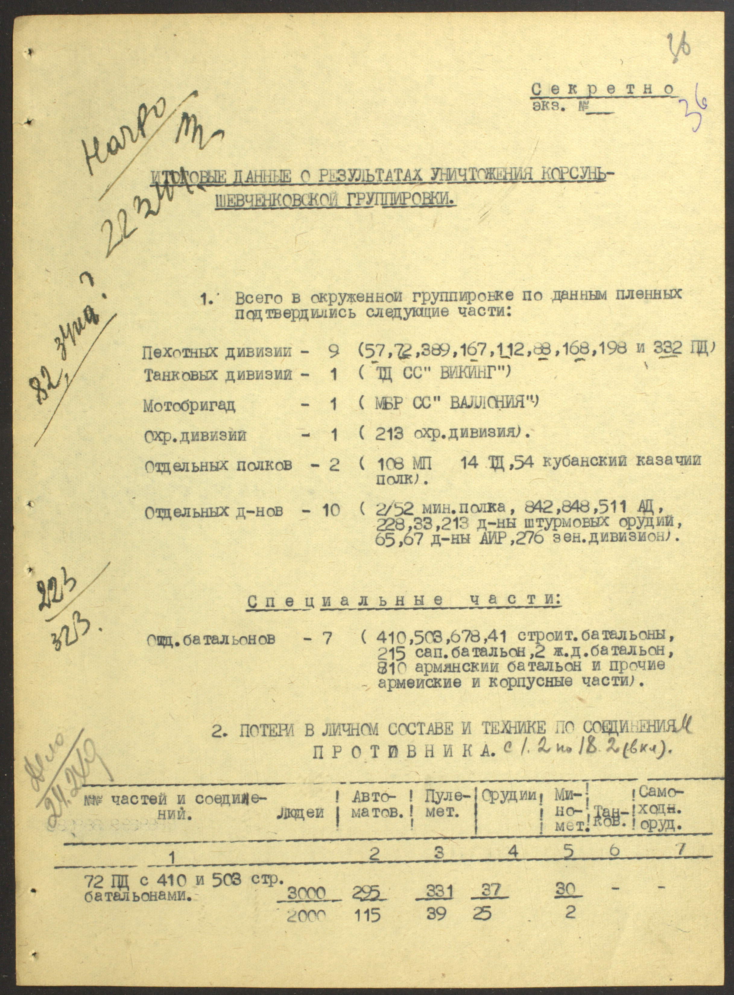Документы Разведывательного отдела штаба 2-го Украинского фронта: итоговые данные о результатах уничтожения немецких войск в Корсунь-Шевченковском районе, данные о количестве военнопленных и трофеях, данные об обнаружении трупа генерал-лейтенанта Штеммермана, сведения о количестве убитых с немецкой стороны