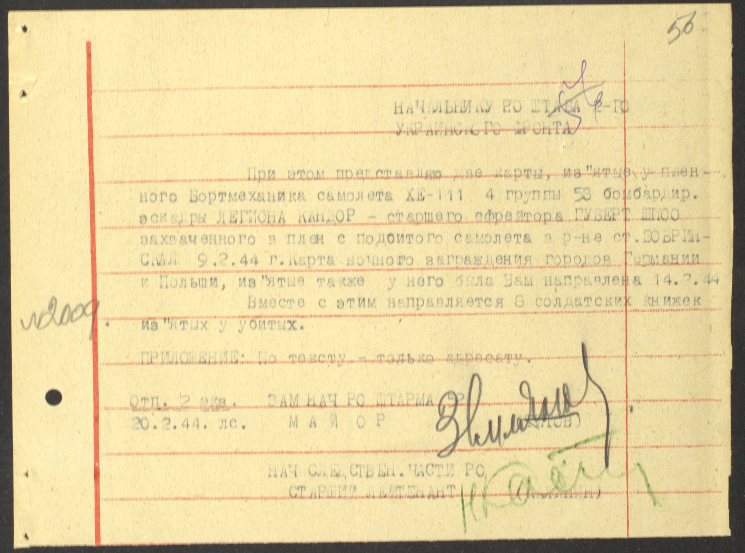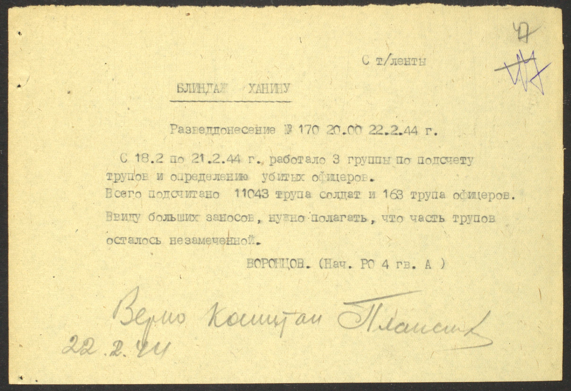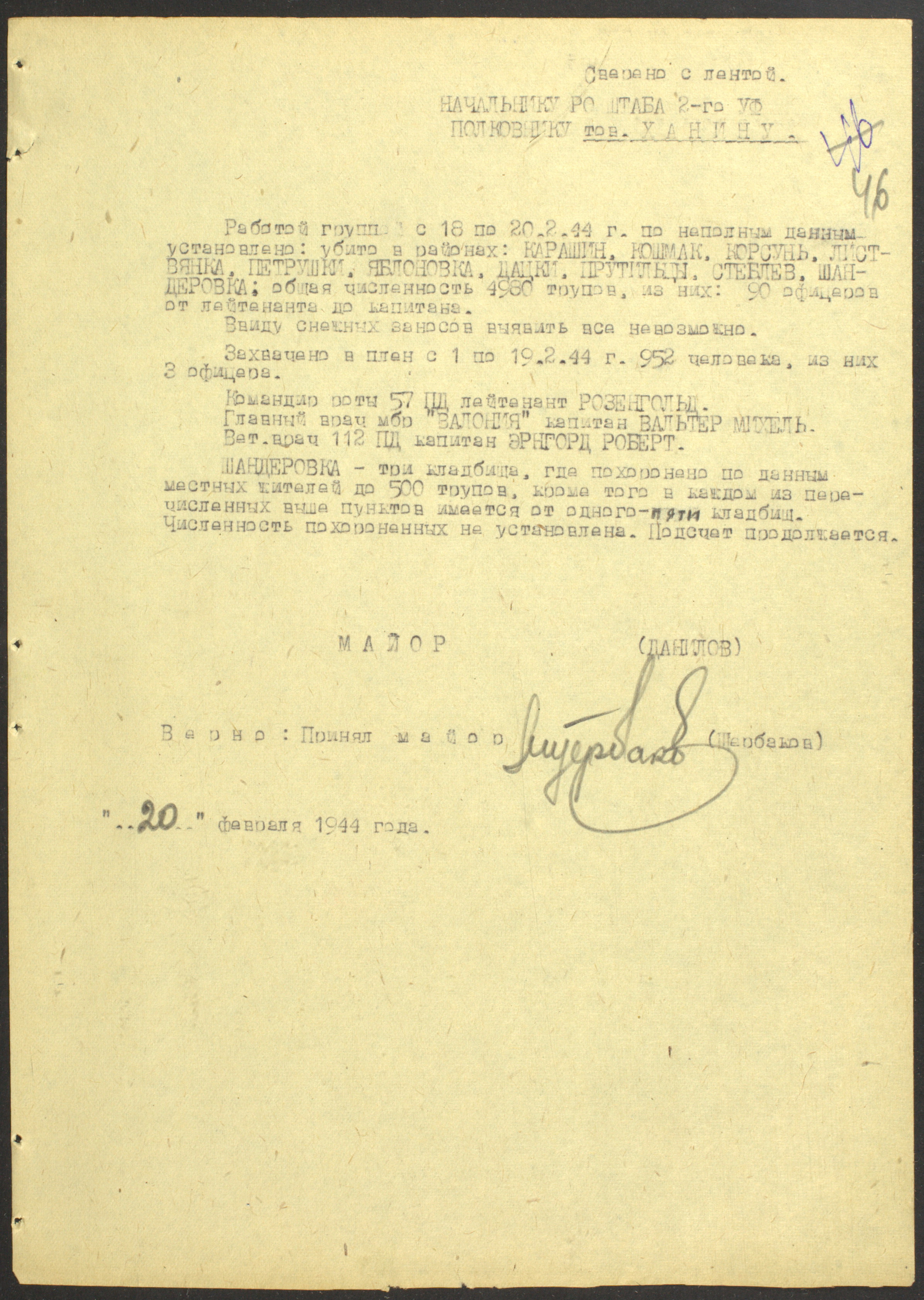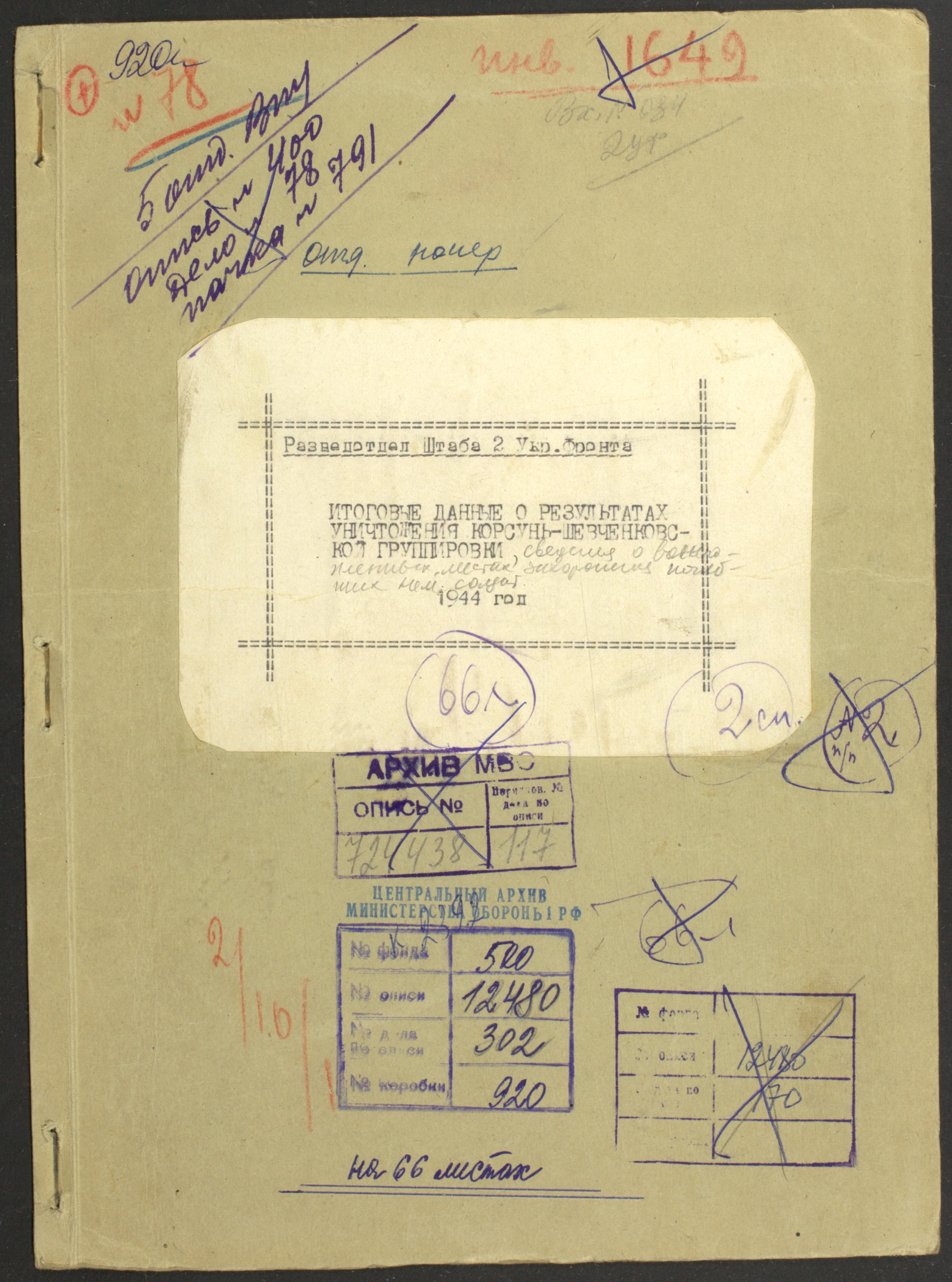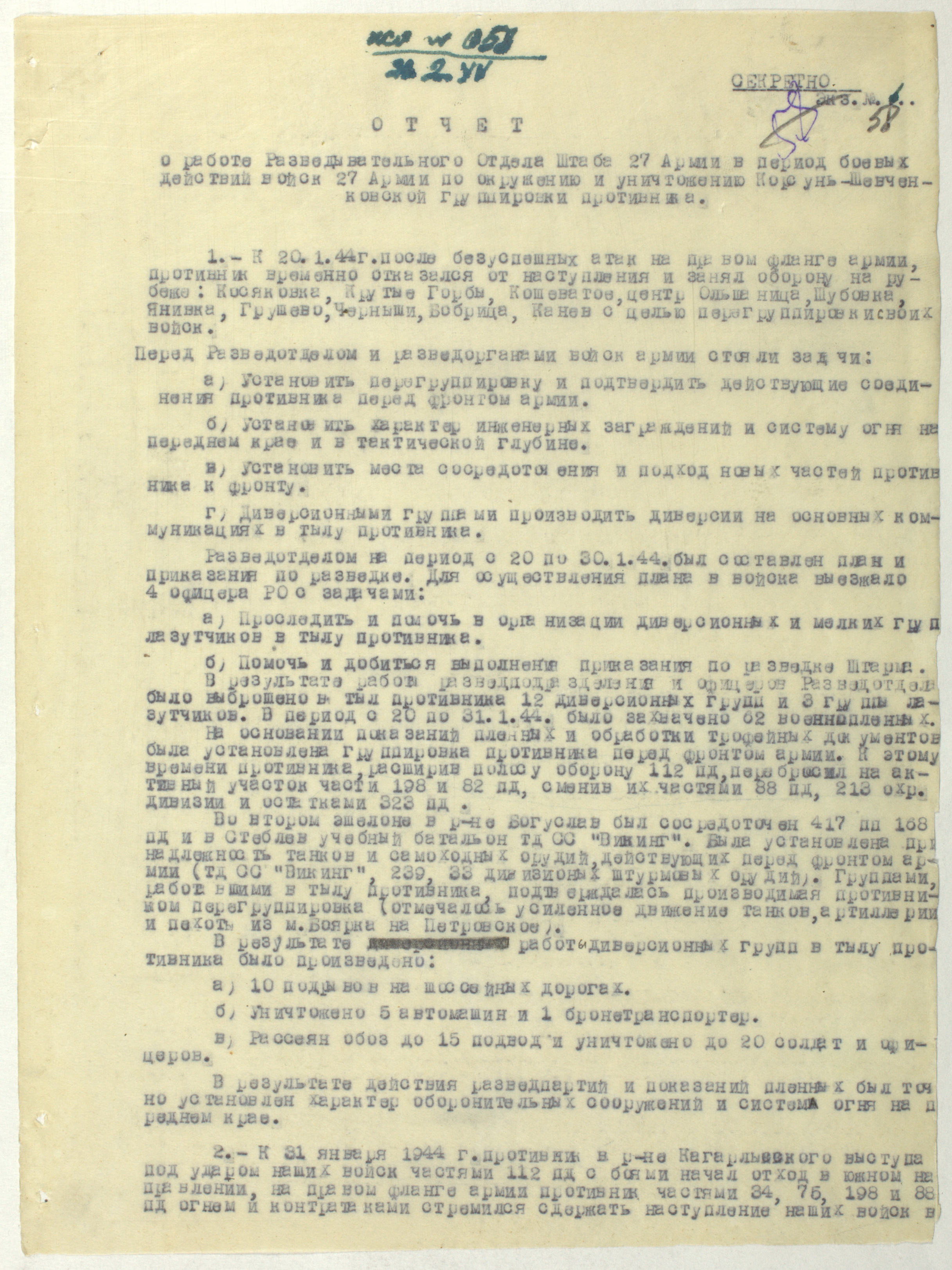 Документы Разведывательного отдела штаба 2-го Украинского фронта: итоговые данные о результатах уничтожения немецких войск в Корсунь-Шевченковском районе, данные о количестве военнопленных и трофеях, данные об обнаружении трупа генерал-лейтенанта Штеммермана, сведения о количестве убитых с немецкой стороны