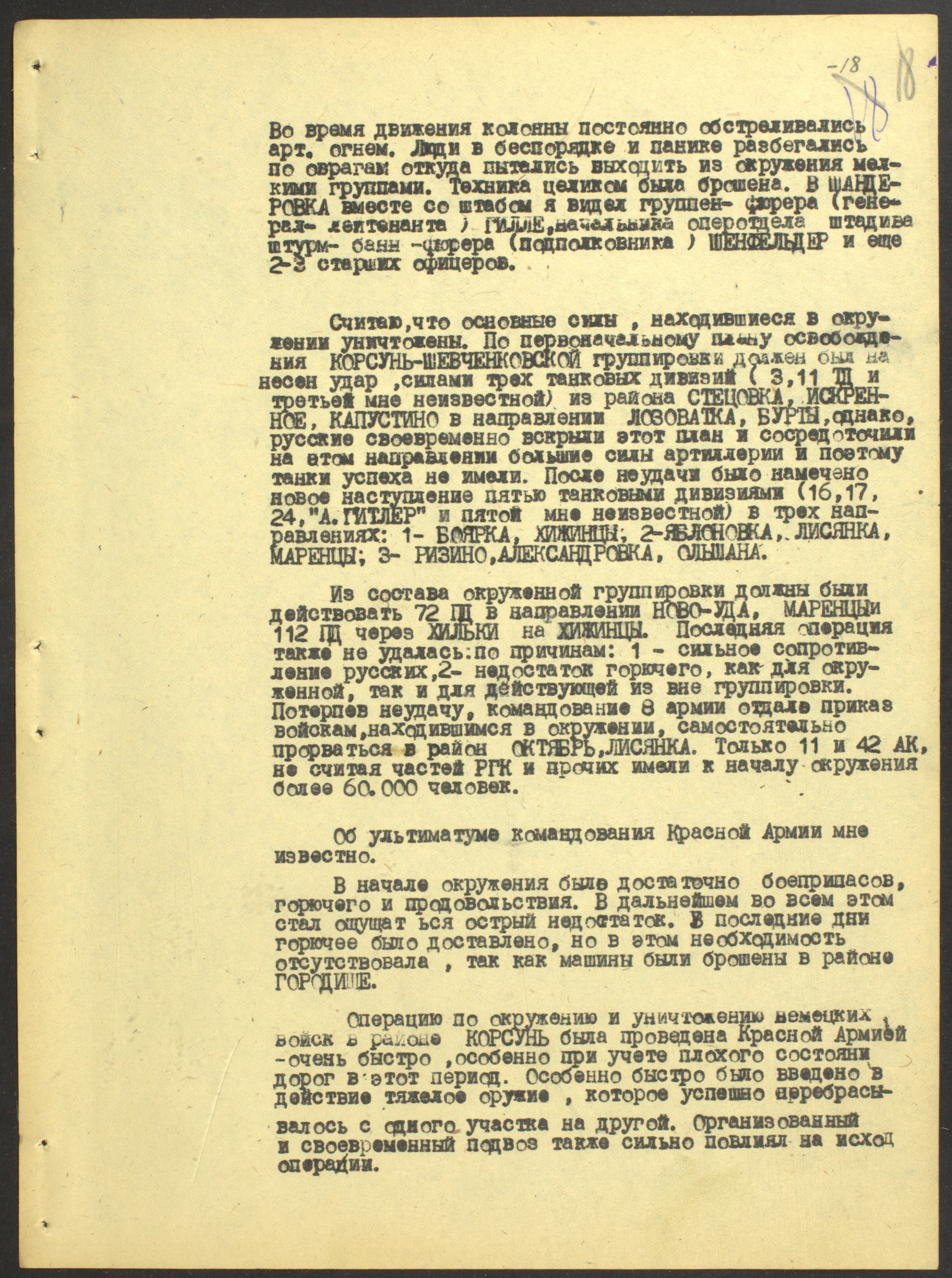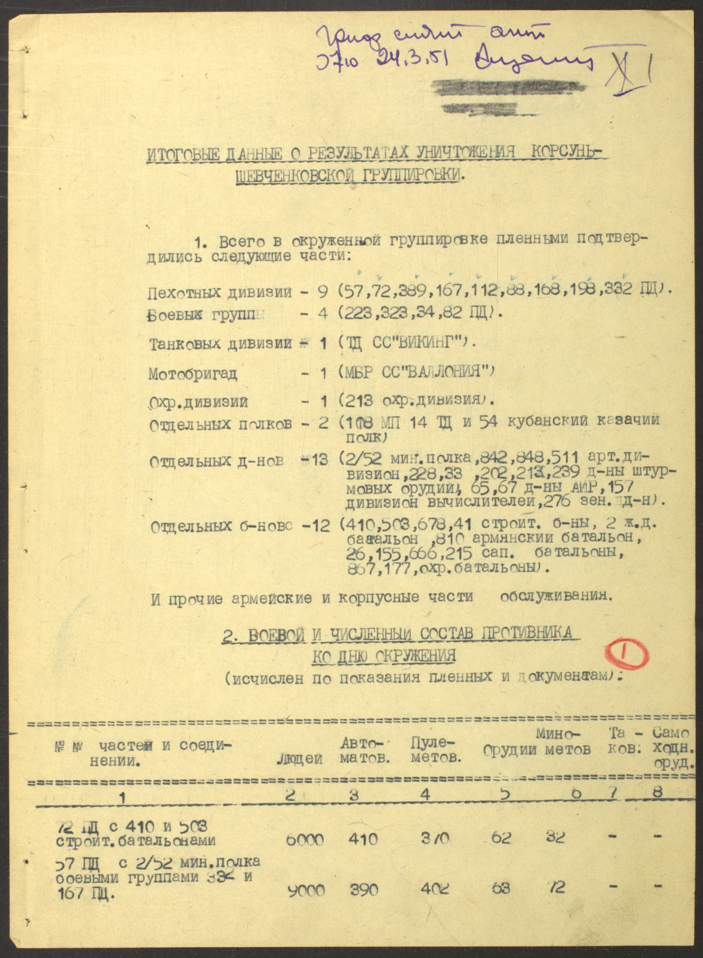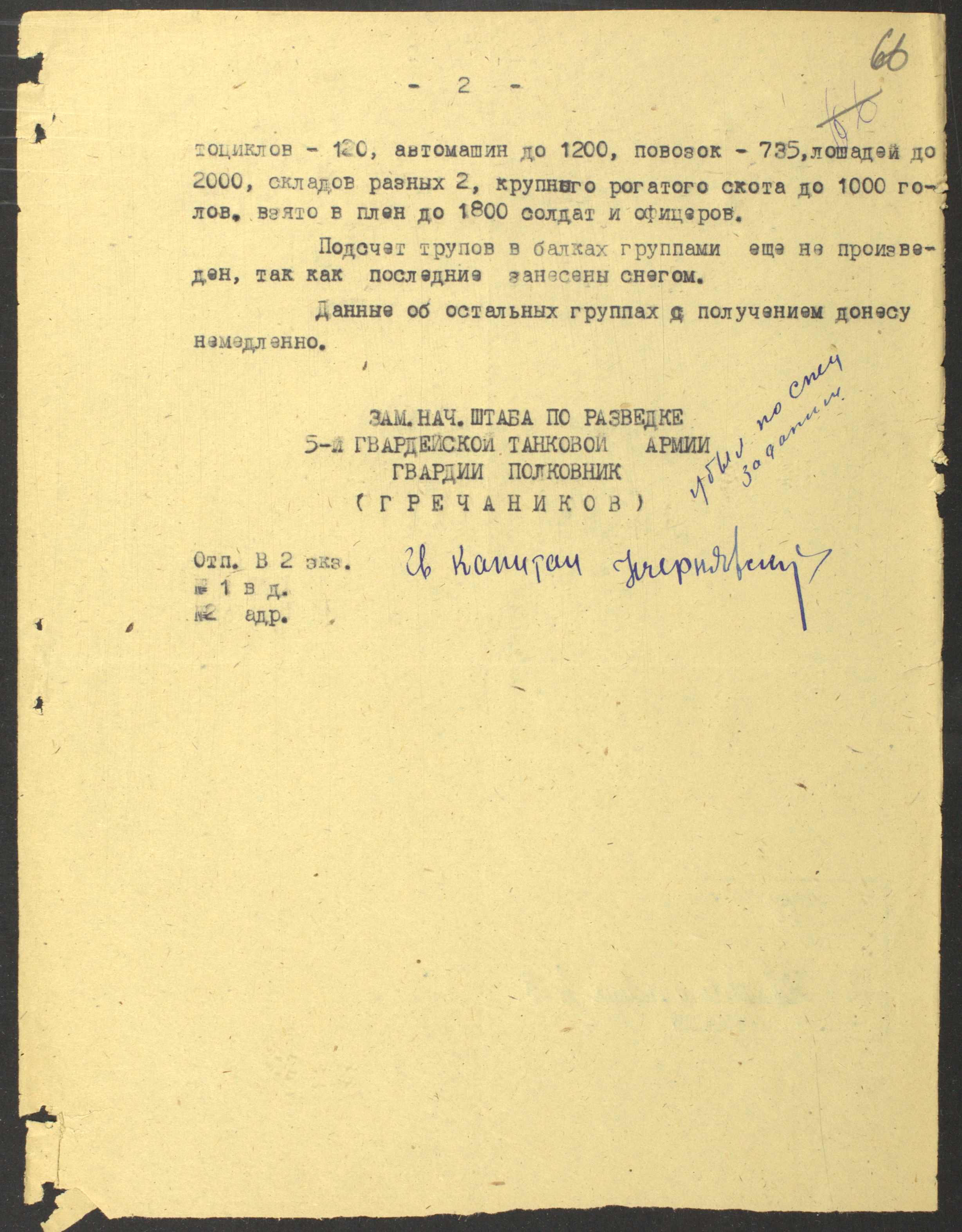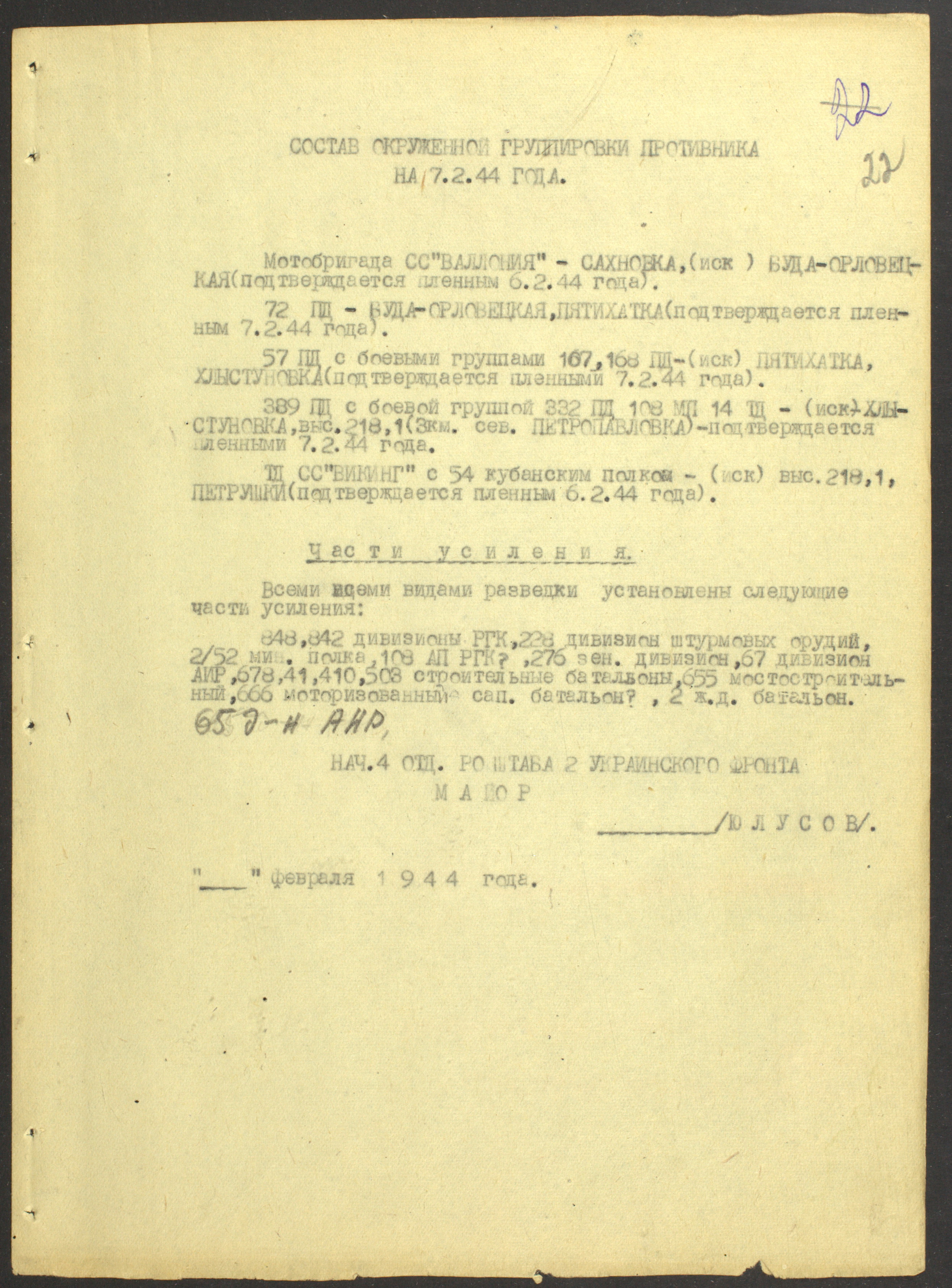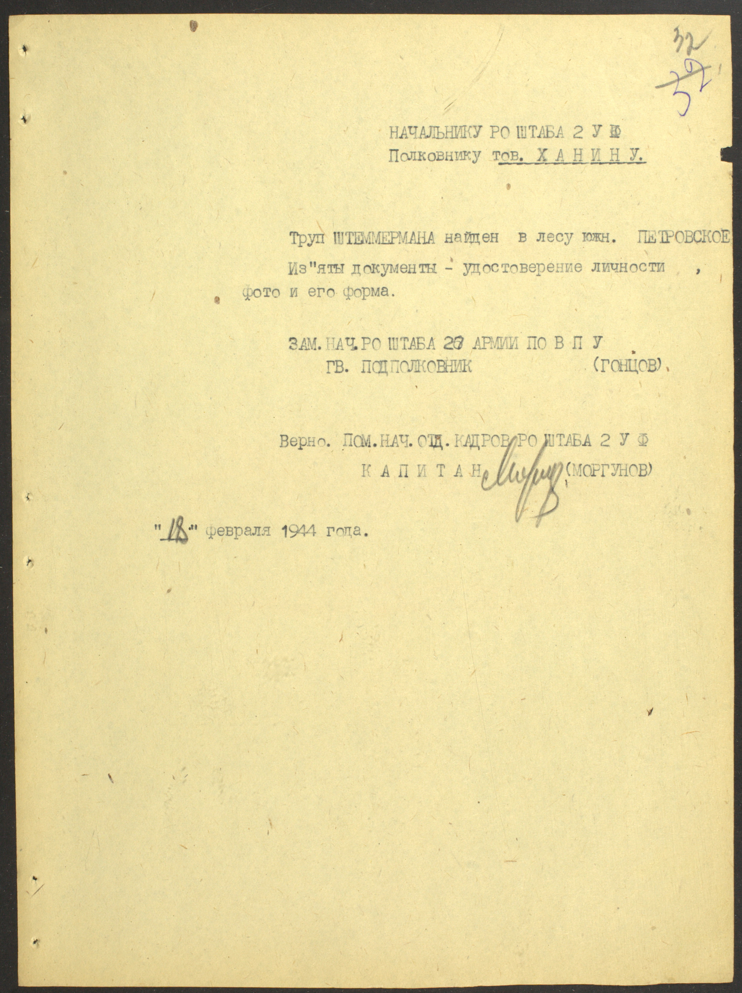 Документы Разведывательного отдела штаба 2-го Украинского фронта: итоговые данные о результатах уничтожения немецких войск в Корсунь-Шевченковском районе, данные о количестве военнопленных и трофеях, данные об обнаружении трупа генерал-лейтенанта Штеммермана, сведения о количестве убитых с немецкой стороны