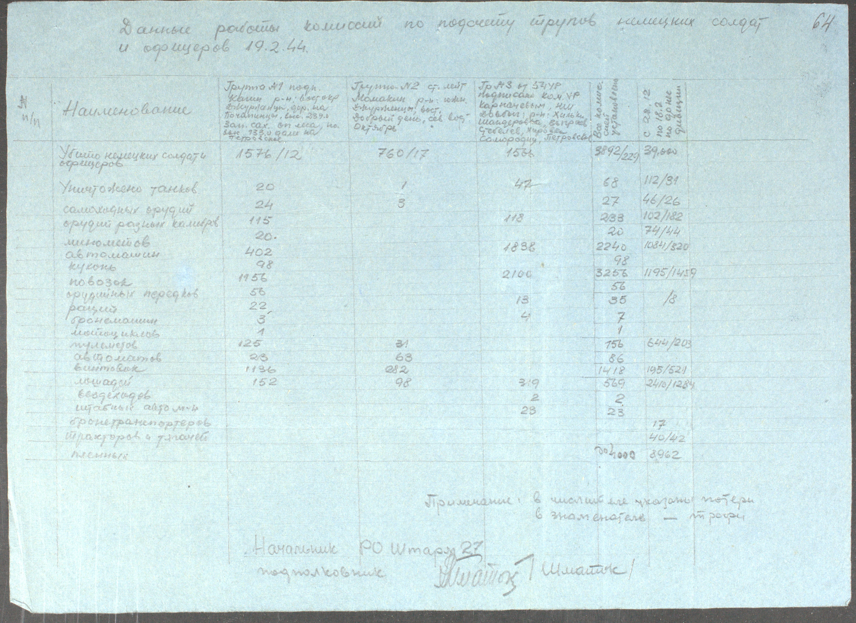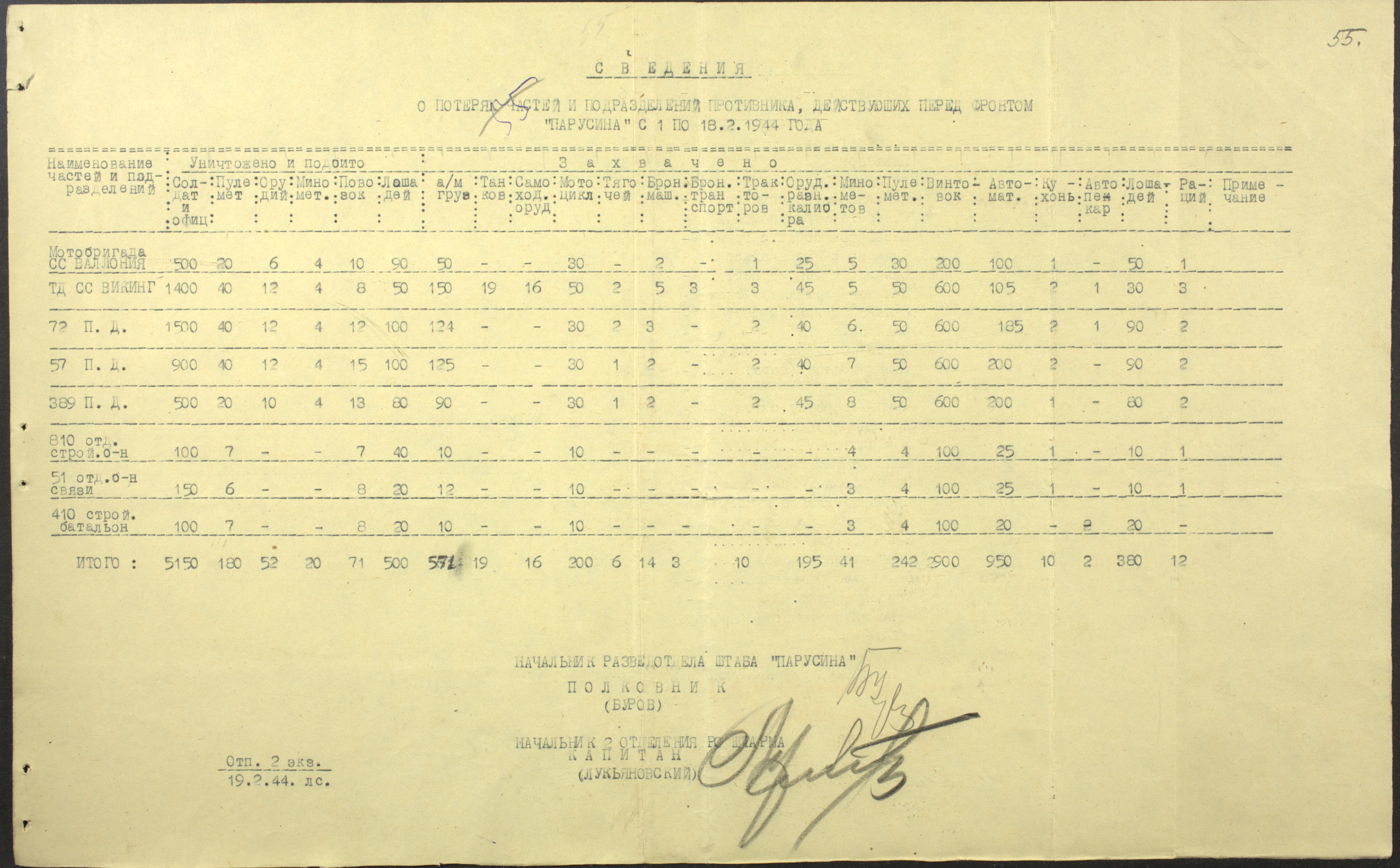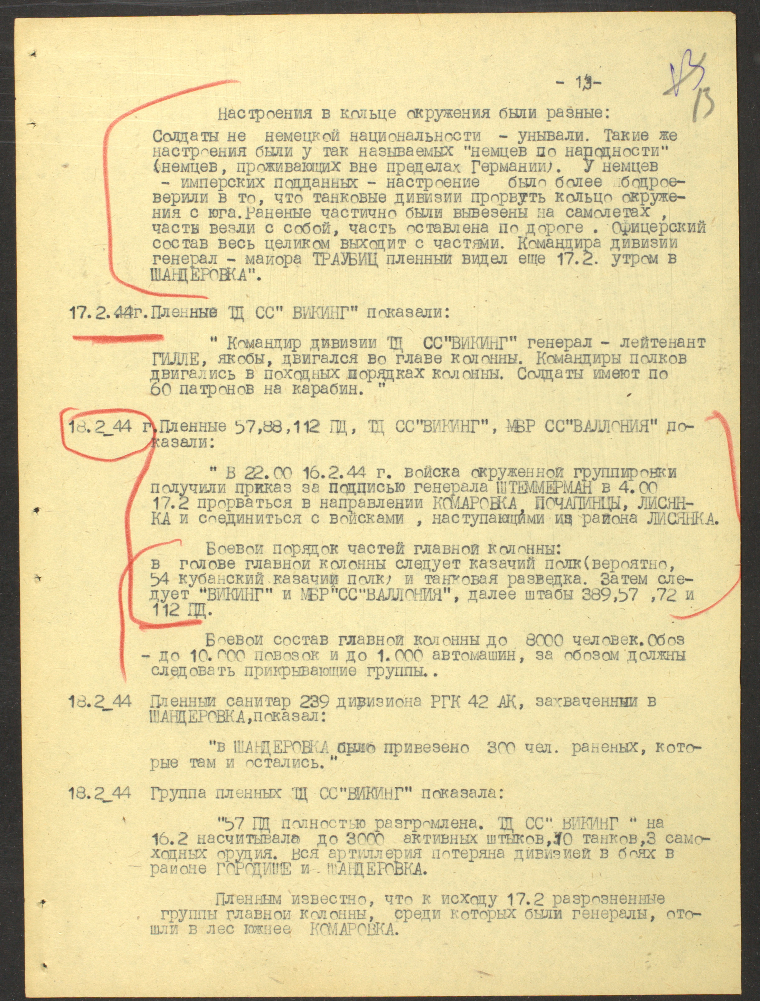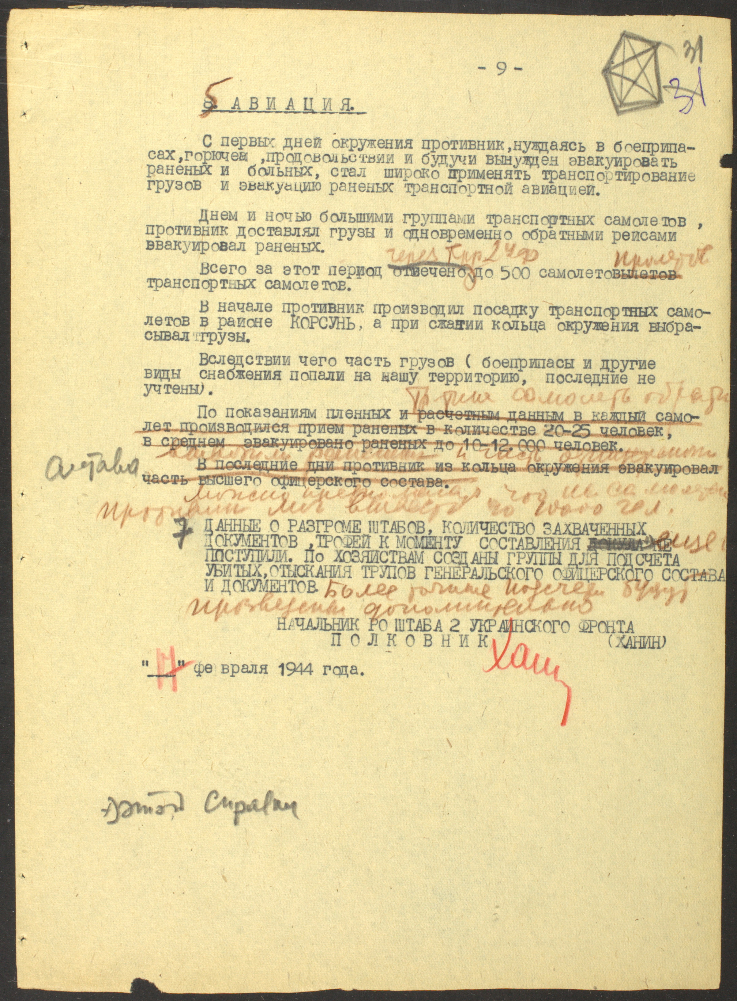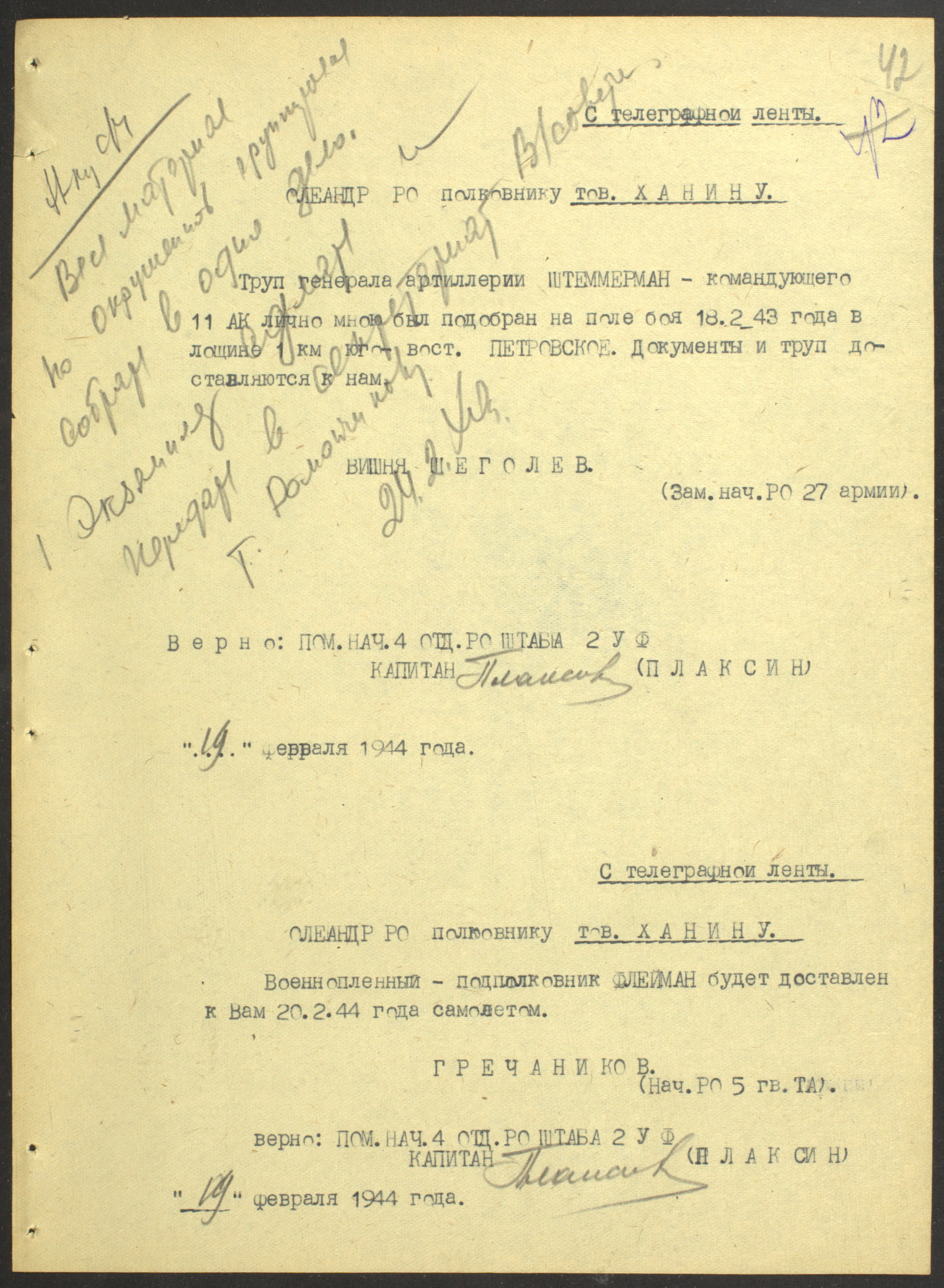 Документы Разведывательного отдела штаба 2-го Украинского фронта: итоговые данные о результатах уничтожения немецких войск в Корсунь-Шевченковском районе, данные о количестве военнопленных и трофеях, данные об обнаружении трупа генерал-лейтенанта Штеммермана, сведения о количестве убитых с немецкой стороны