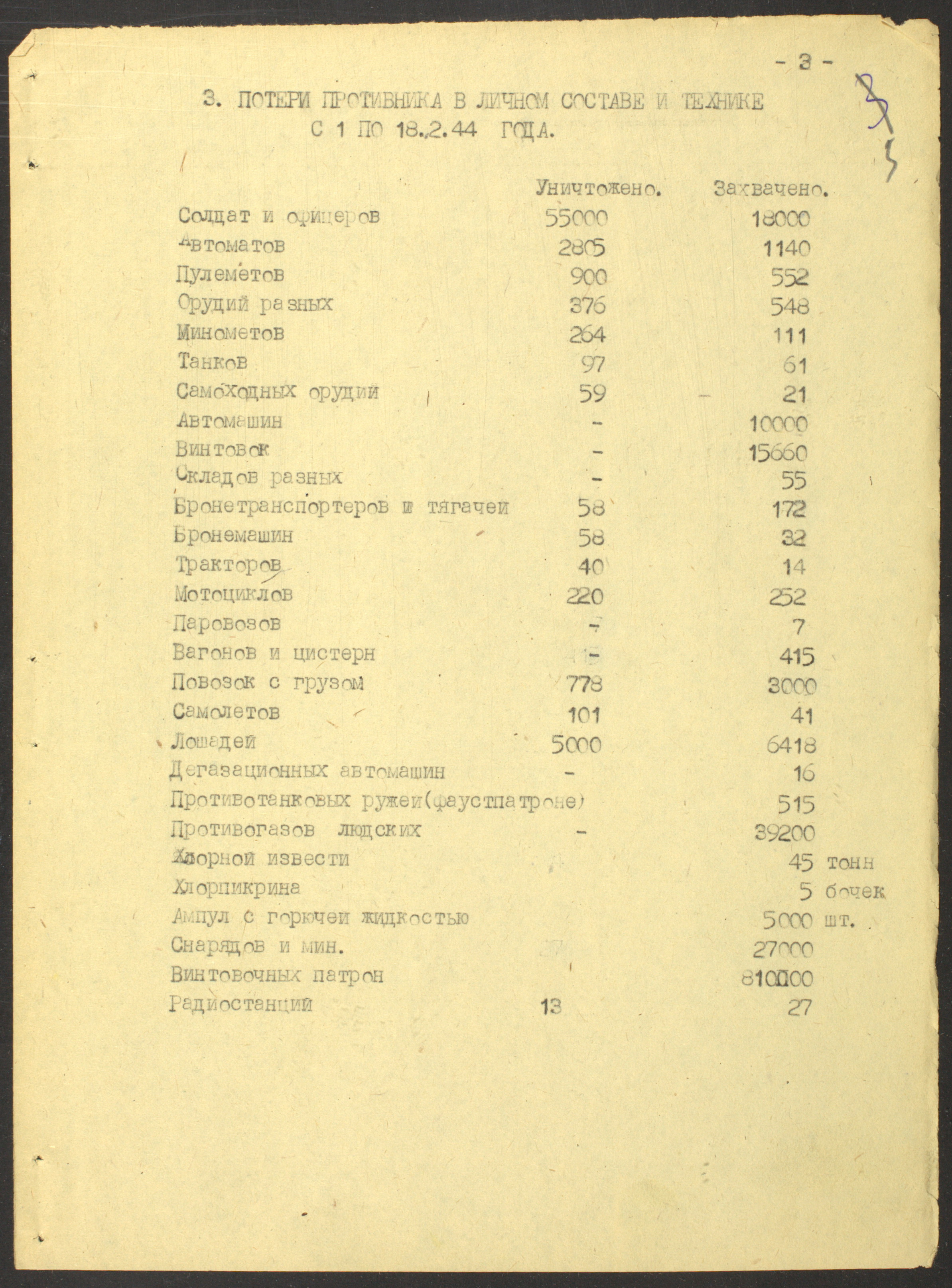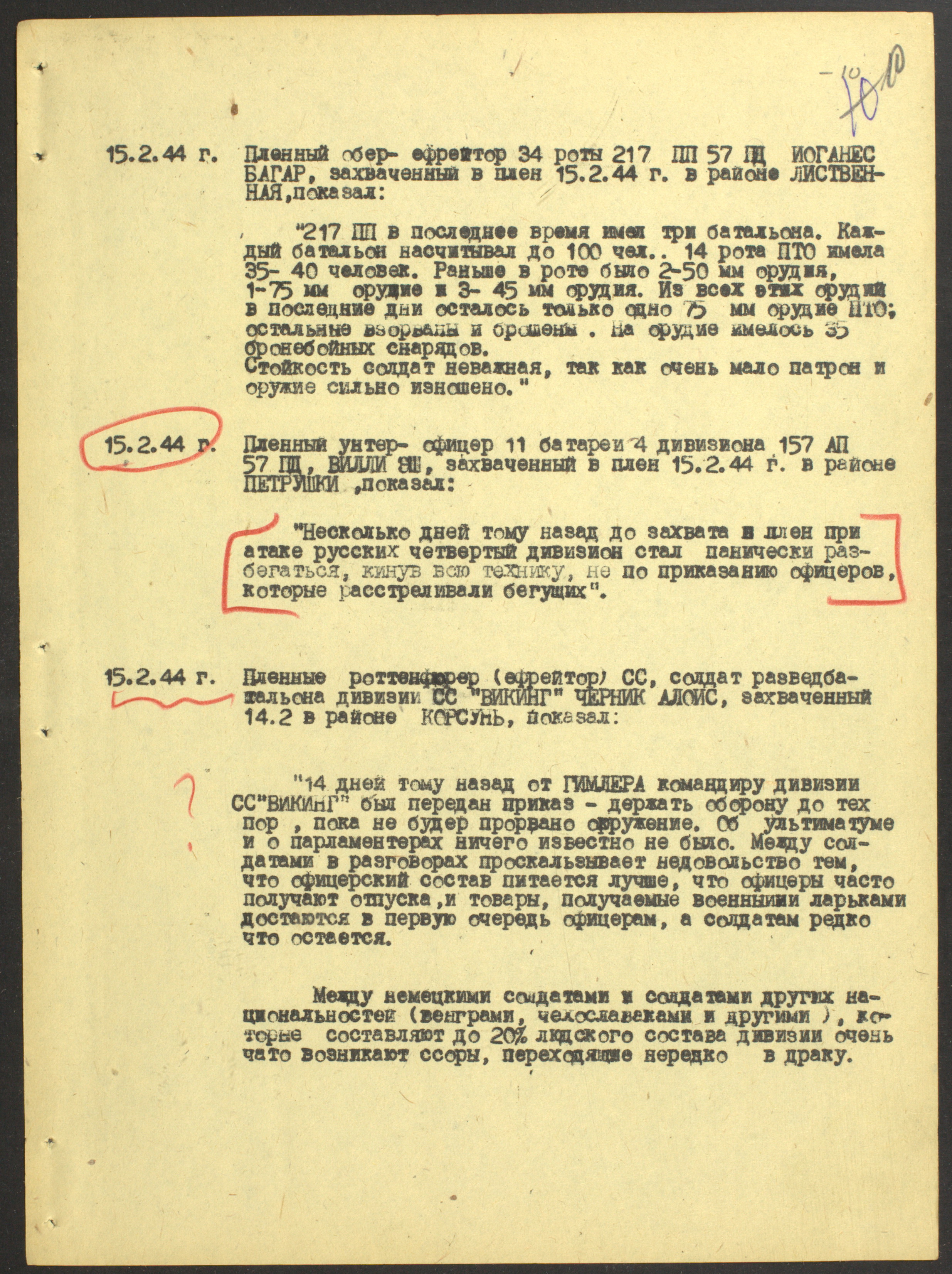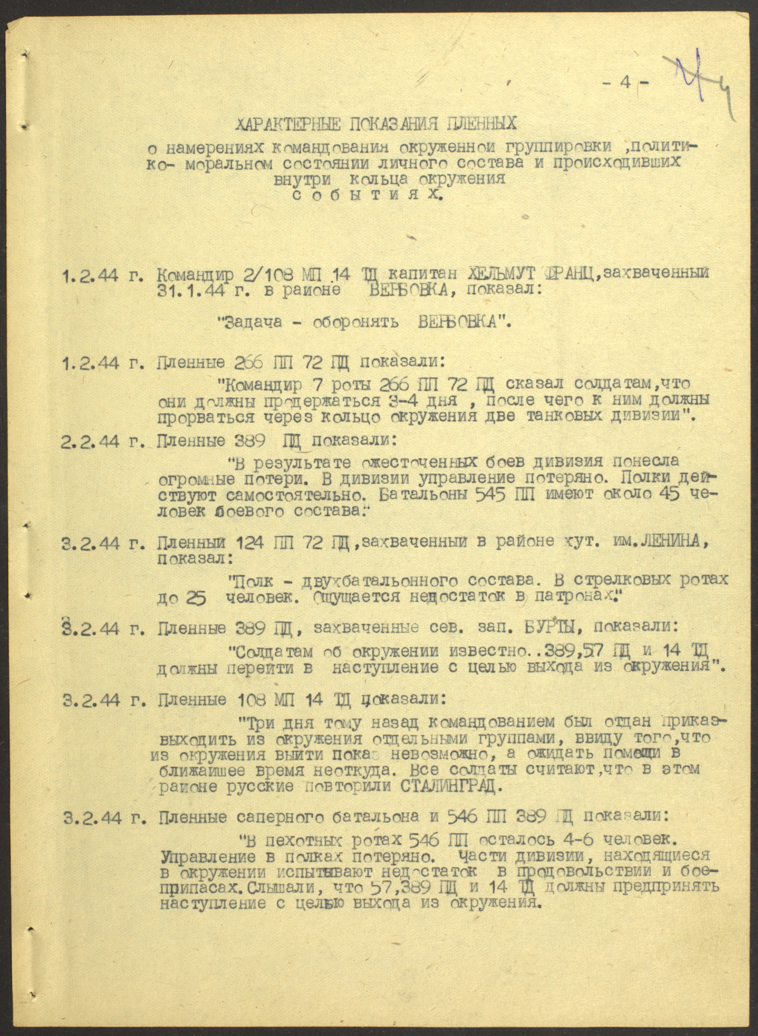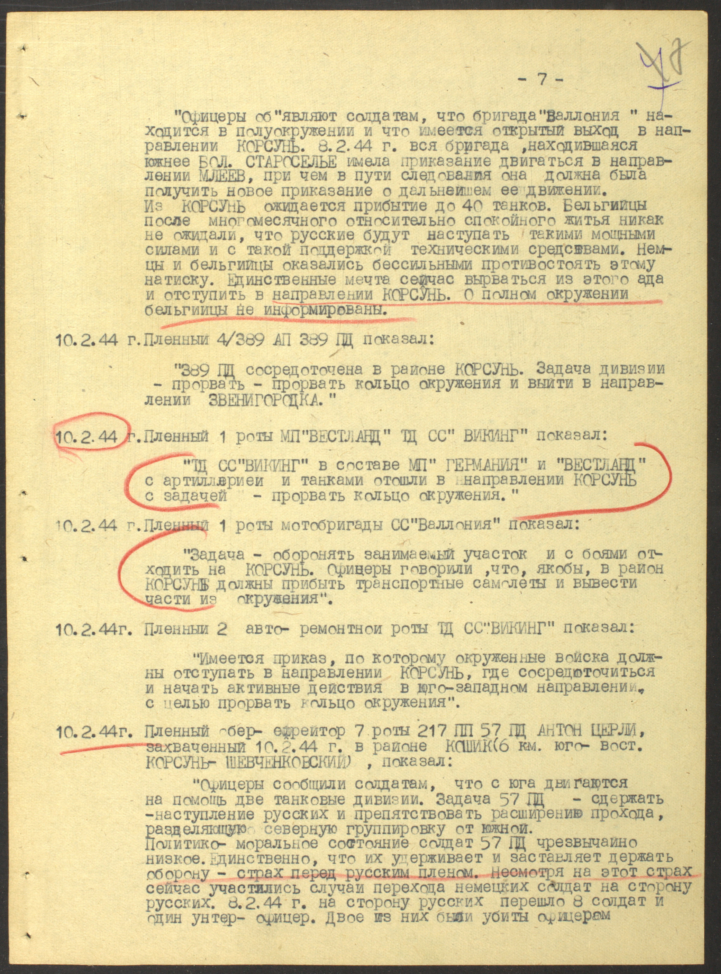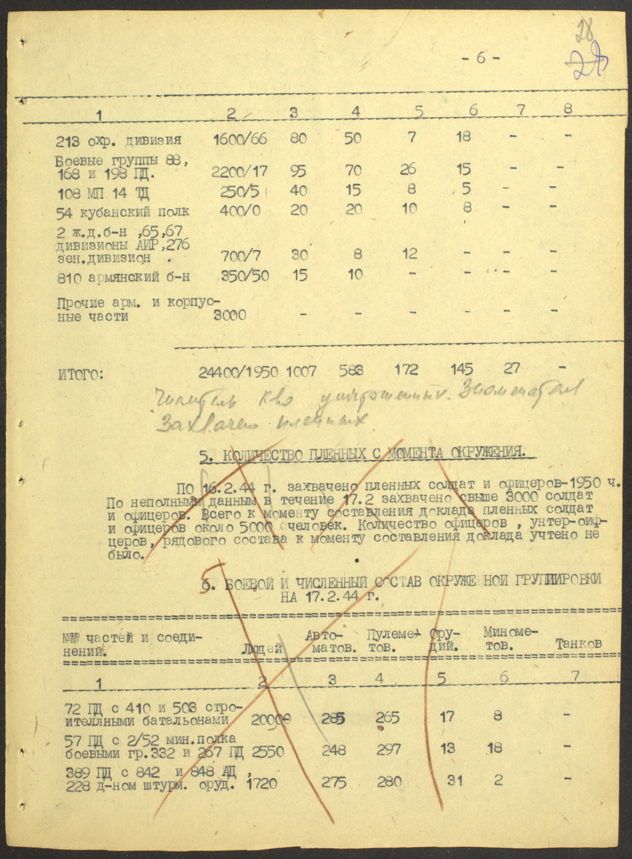 Документы Разведывательного отдела штаба 2-го Украинского фронта: итоговые данные о результатах уничтожения немецких войск в Корсунь-Шевченковском районе, данные о количестве военнопленных и трофеях, данные об обнаружении трупа генерал-лейтенанта Штеммермана, сведения о количестве убитых с немецкой стороны