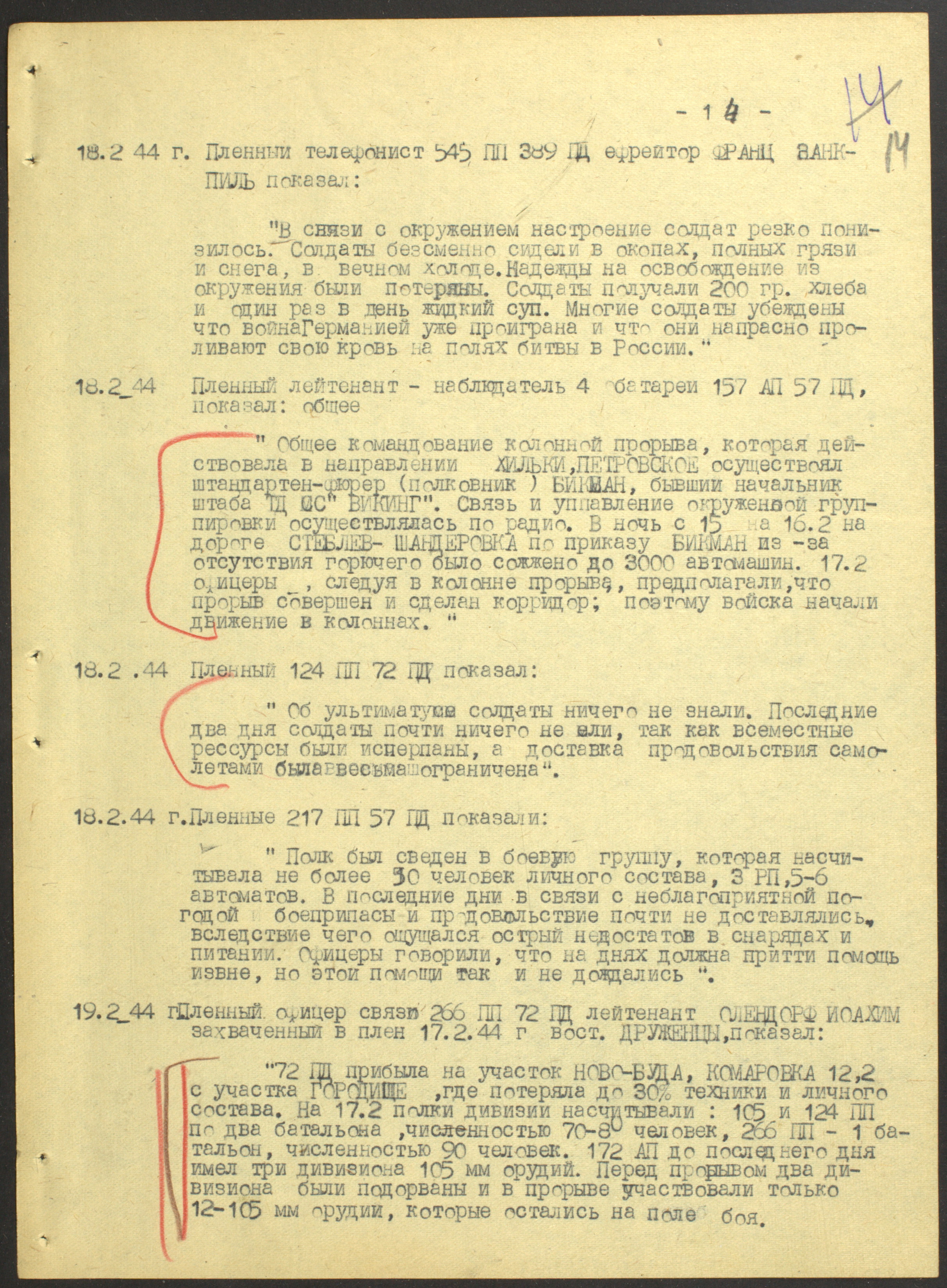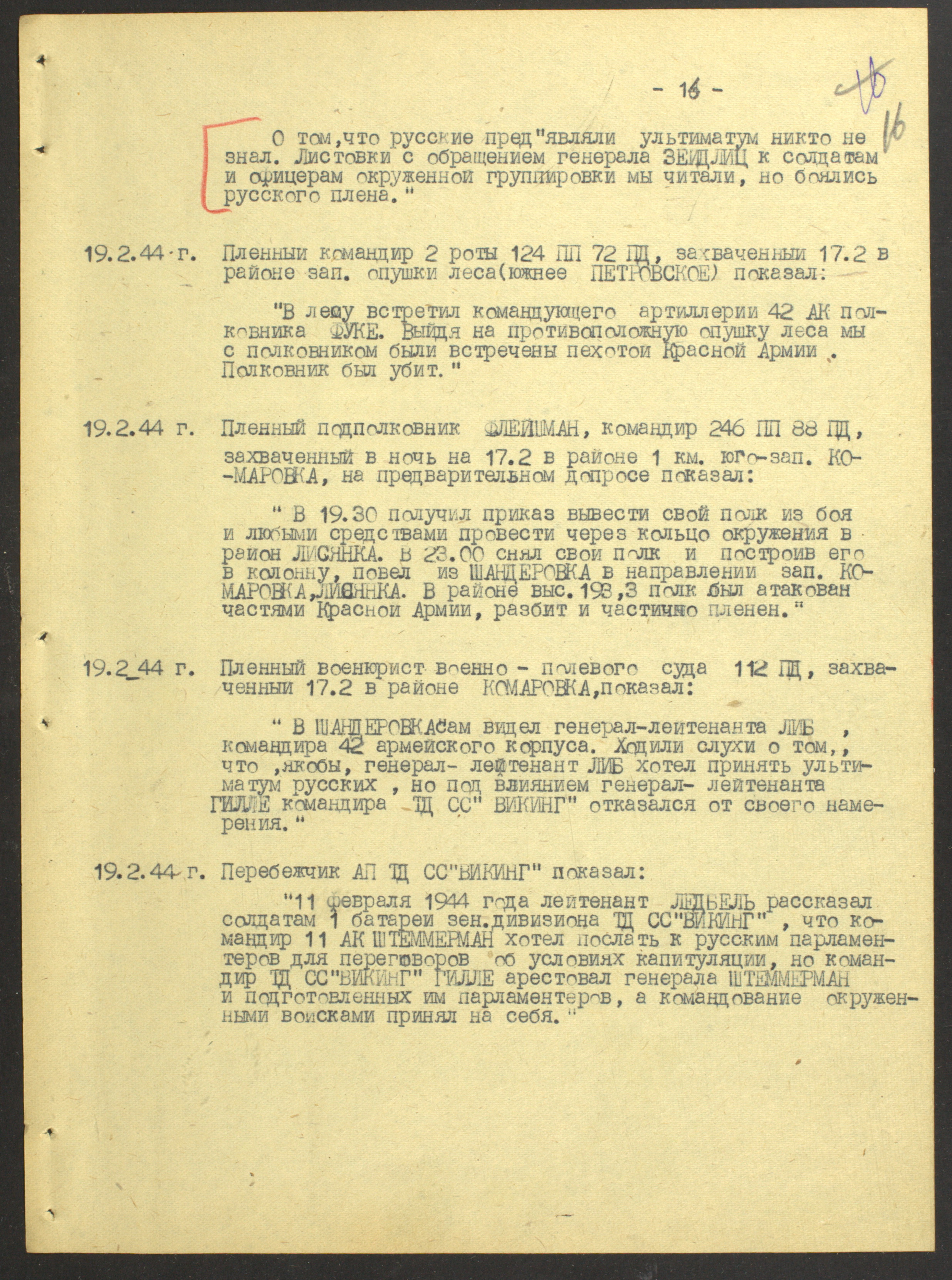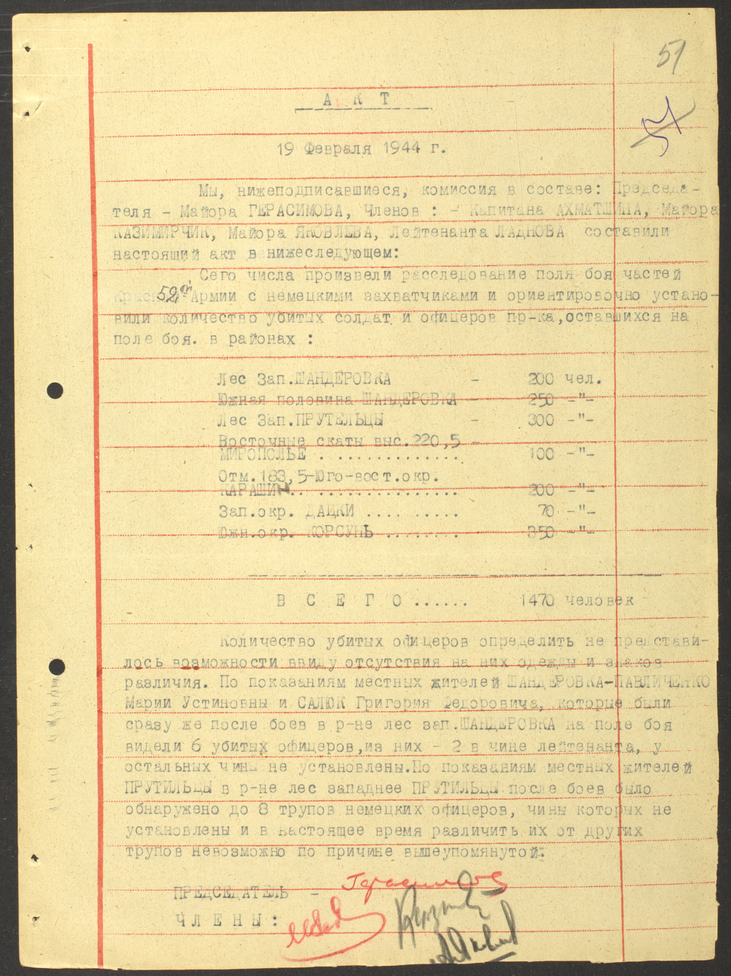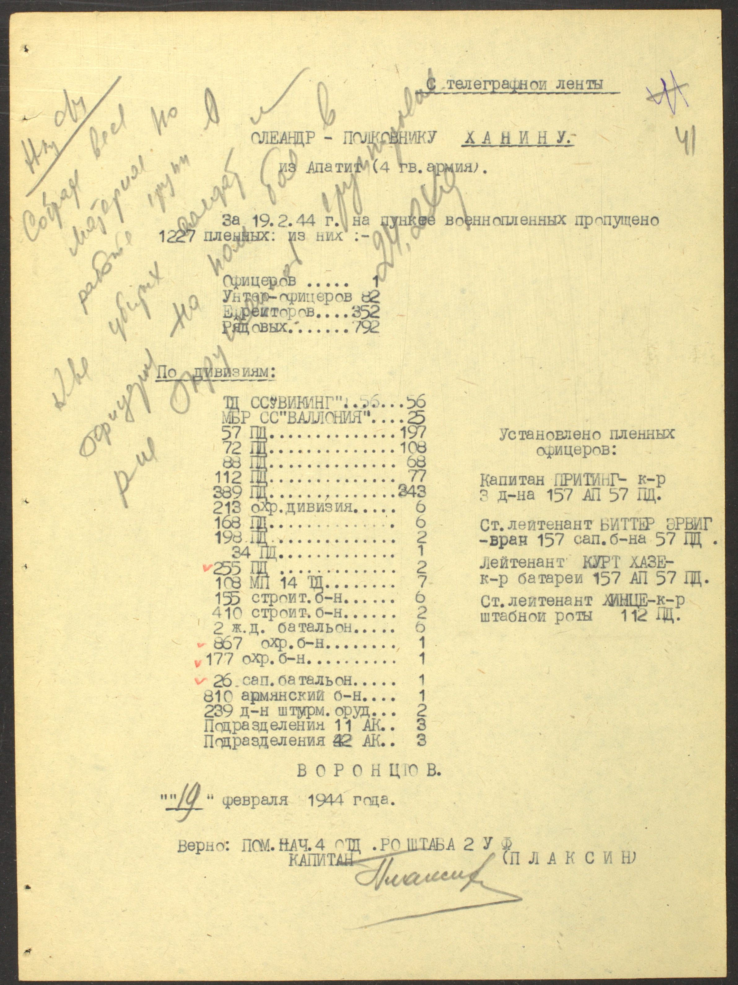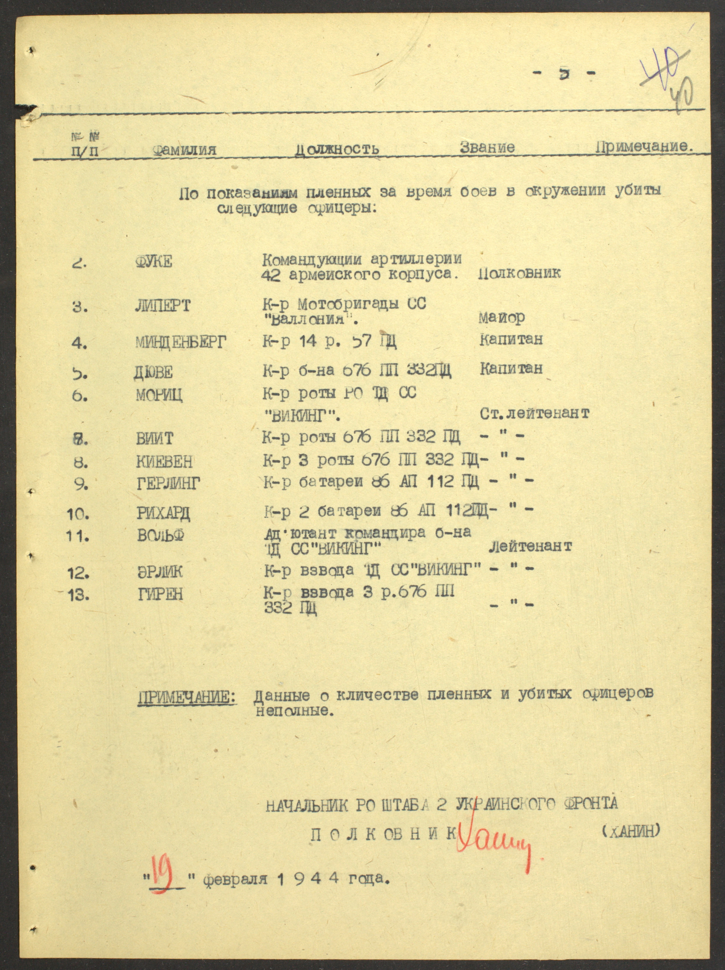 Документы Разведывательного отдела штаба 2-го Украинского фронта: итоговые данные о результатах уничтожения немецких войск в Корсунь-Шевченковском районе, данные о количестве военнопленных и трофеях, данные об обнаружении трупа генерал-лейтенанта Штеммермана, сведения о количестве убитых с немецкой стороны