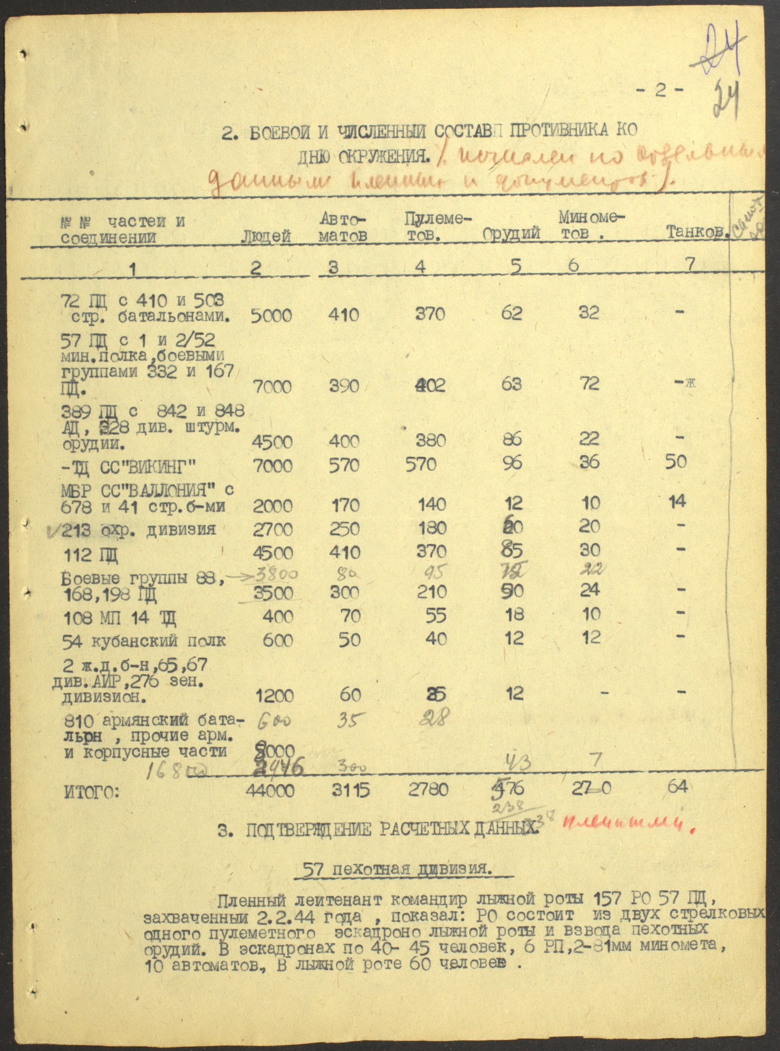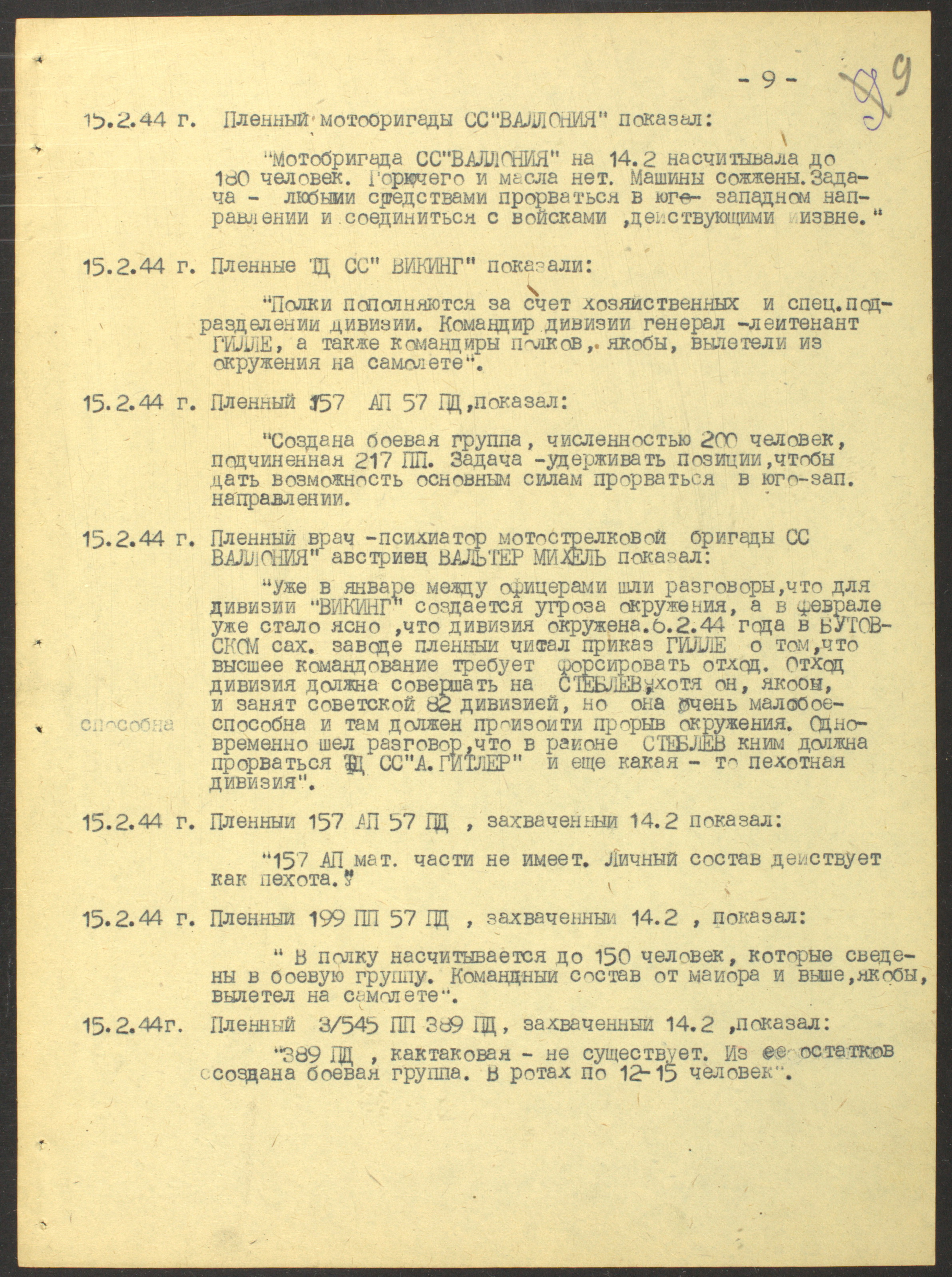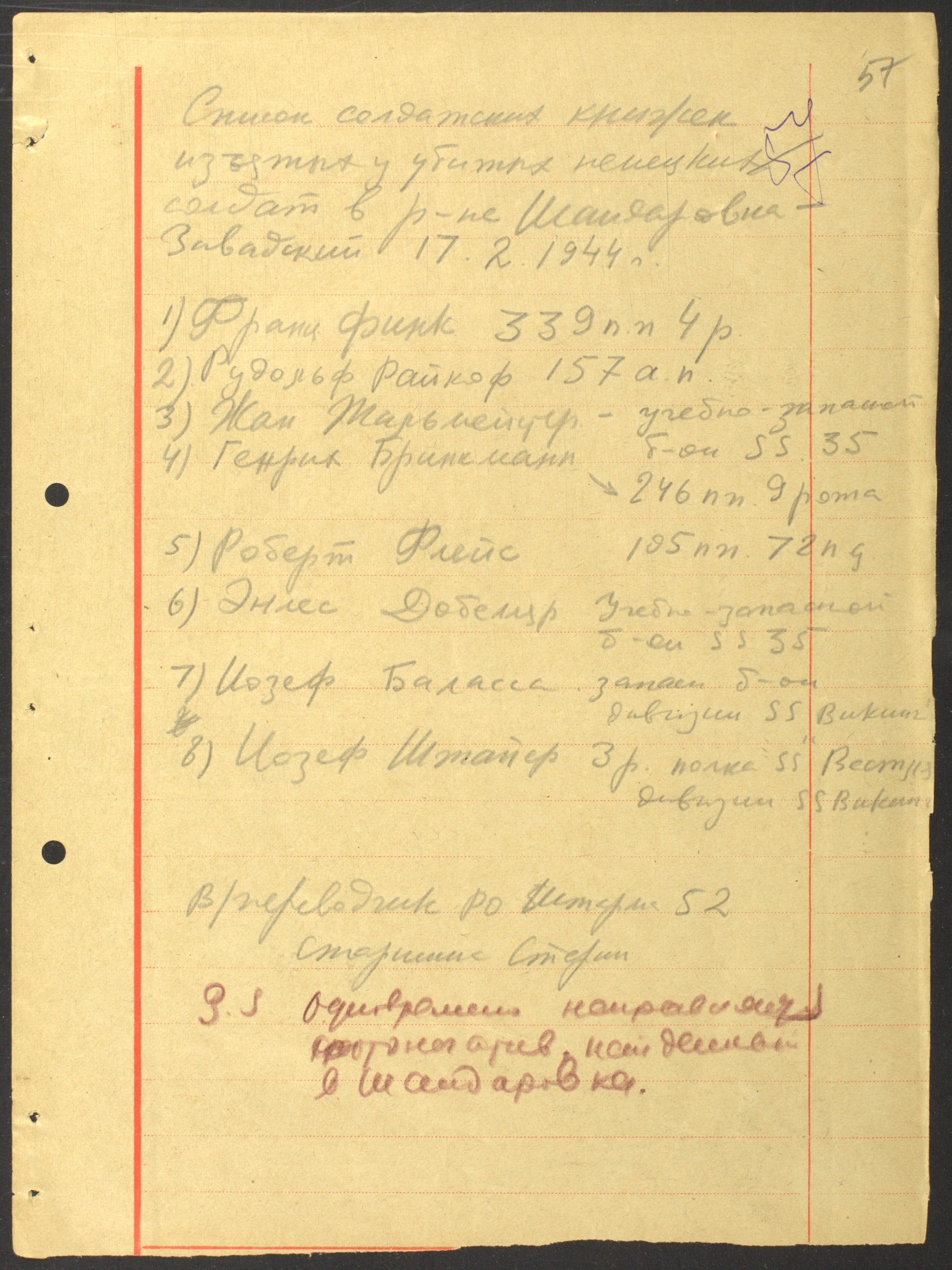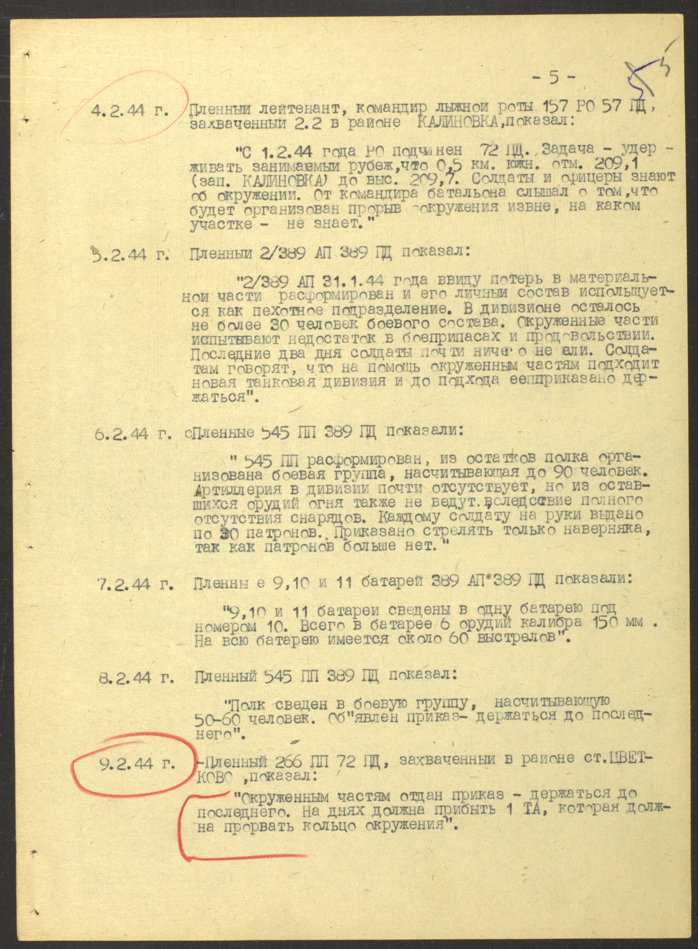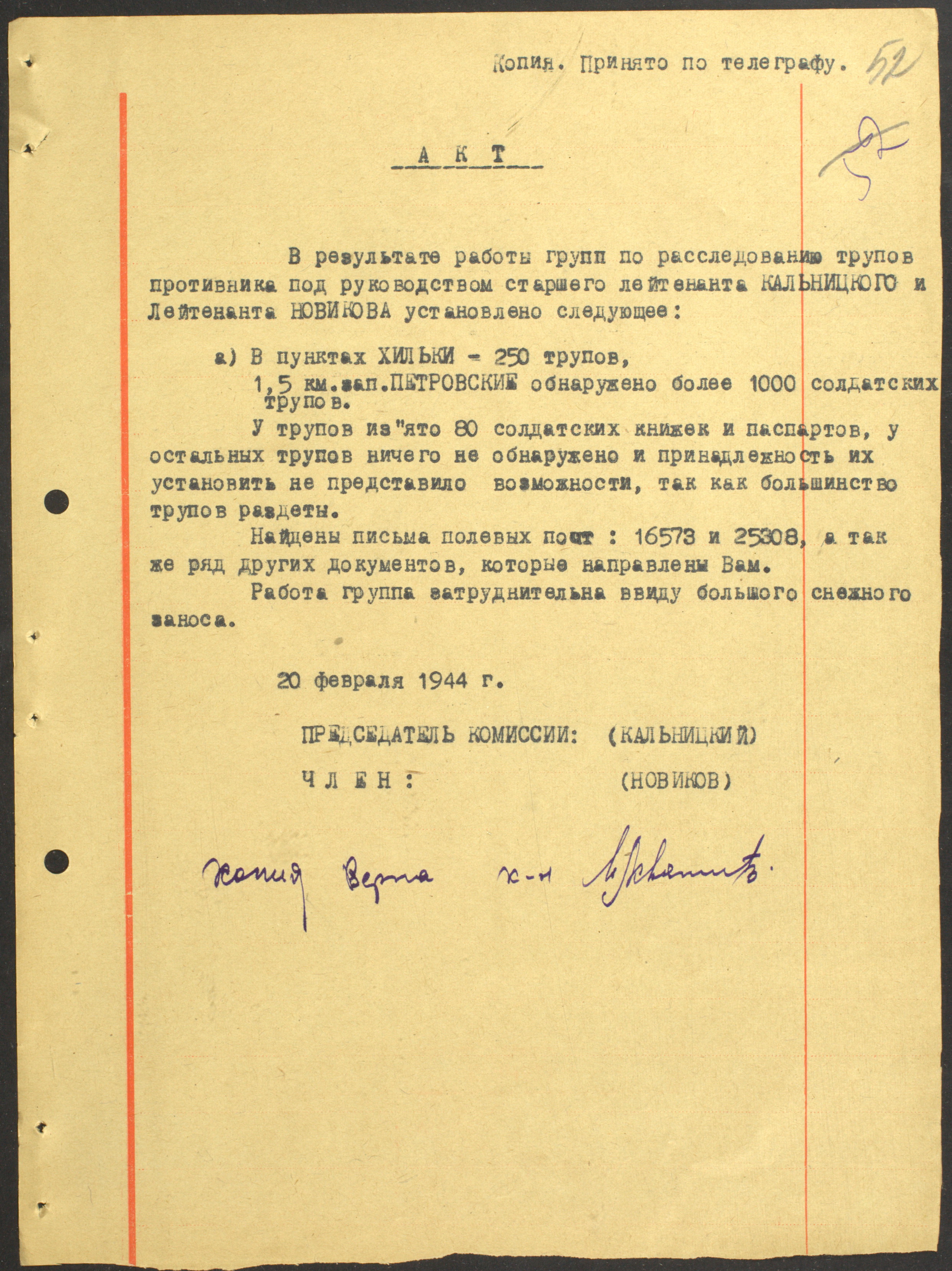 Документы Разведывательного отдела штаба 2-го Украинского фронта: итоговые данные о результатах уничтожения немецких войск в Корсунь-Шевченковском районе, данные о количестве военнопленных и трофеях, данные об обнаружении трупа генерал-лейтенанта Штеммермана, сведения о количестве убитых с немецкой стороны