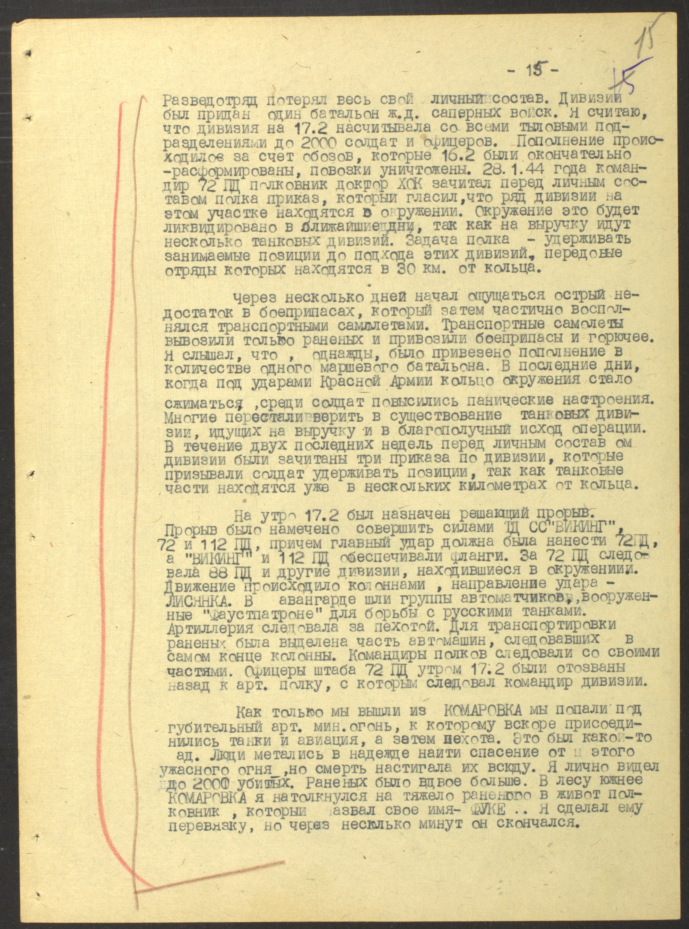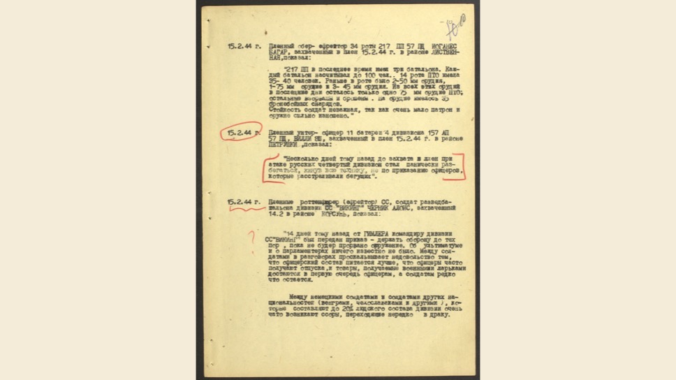 Маттиас Уль: Этот набор документов показывает большие потери немецких дивизий, причем на довольно спокойном участке фронта. Я думаю, это говорит об особой жестокости войны на Восточном фронте — все бьются до последнего, никто не хочет в плен. Также мы видим, что Красная Армия в 1944 была уже прекрасно обученной, дисциплинированной, была в состоянии делать такие сложные операции, как окружение.