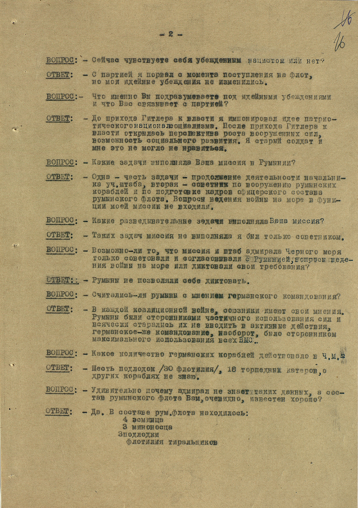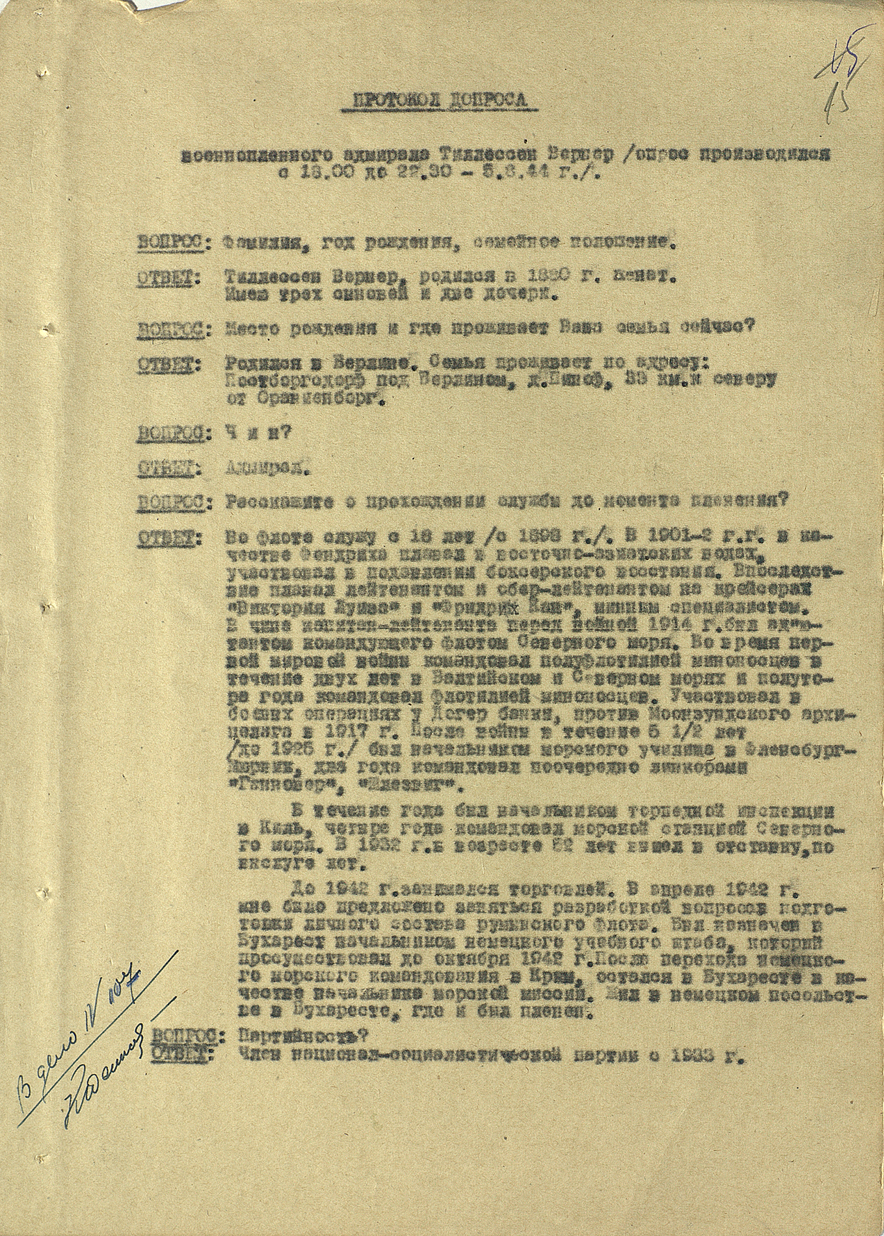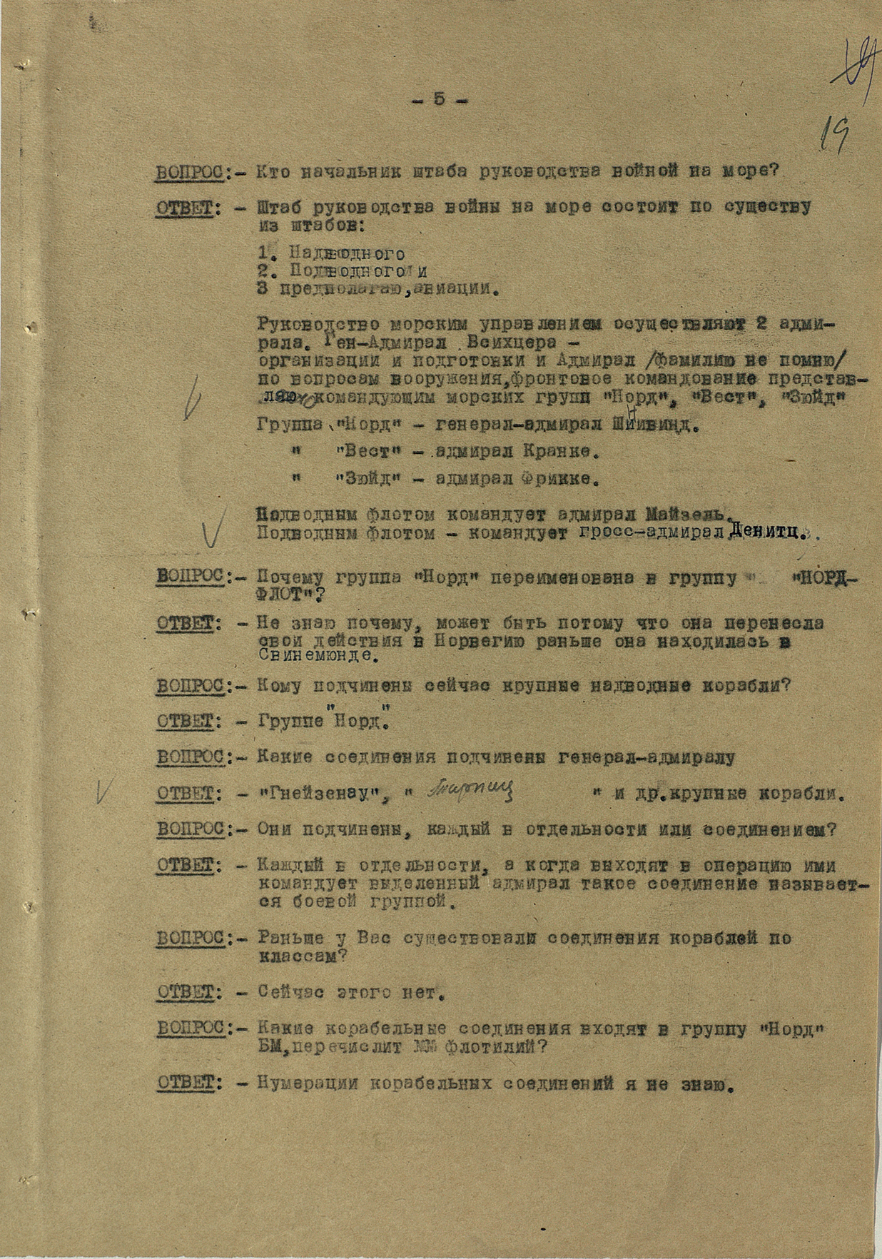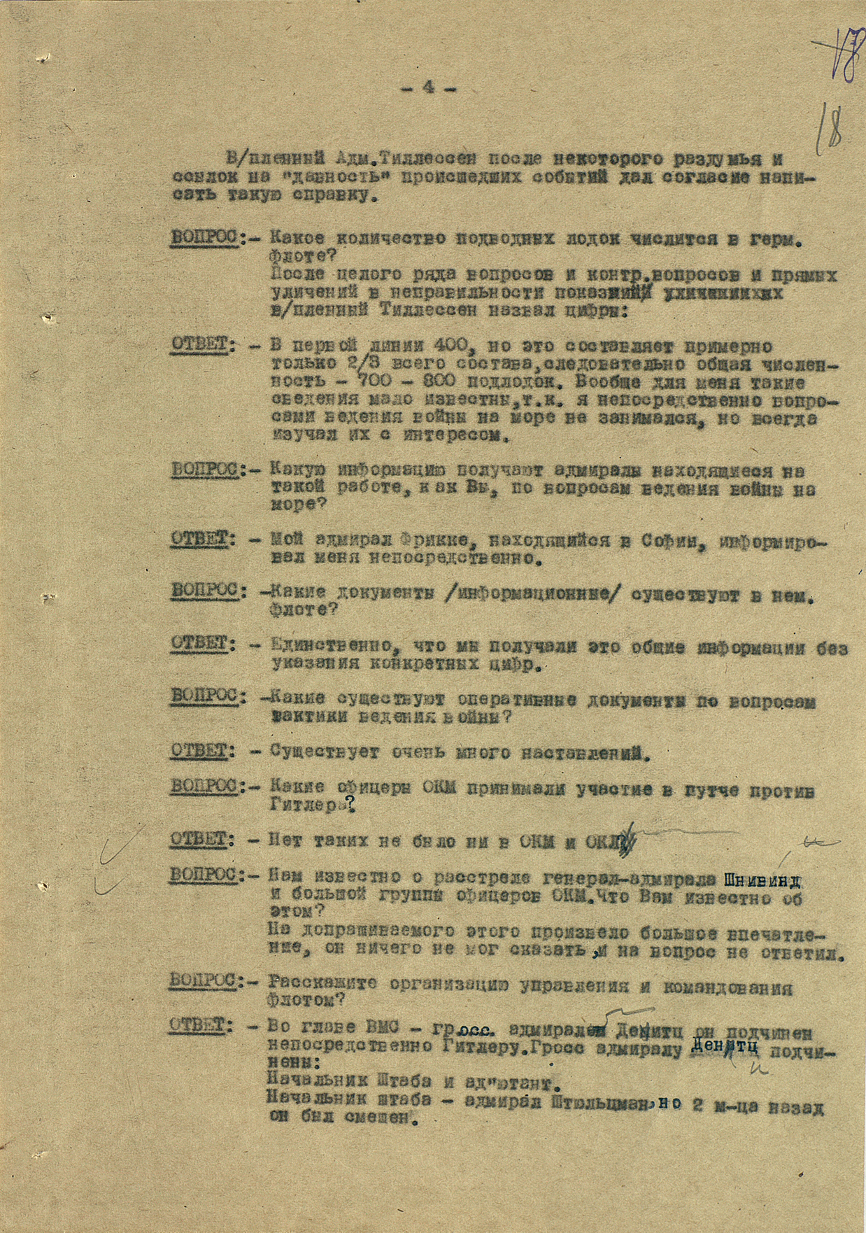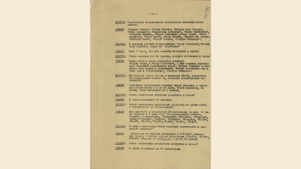 Мы видим из этого документа, что он подробно описал состав немецкого флота. Такое поведение характерно для офицеров высшего звена — обычно они держались два-три дня, но потом понимали, что уже не уйти. Они подробно описывали либо структуры армии, либо ход военных действий. Я еще не встречал ни одного протокола, где допрашиваемый назвал бы только имя и должность.