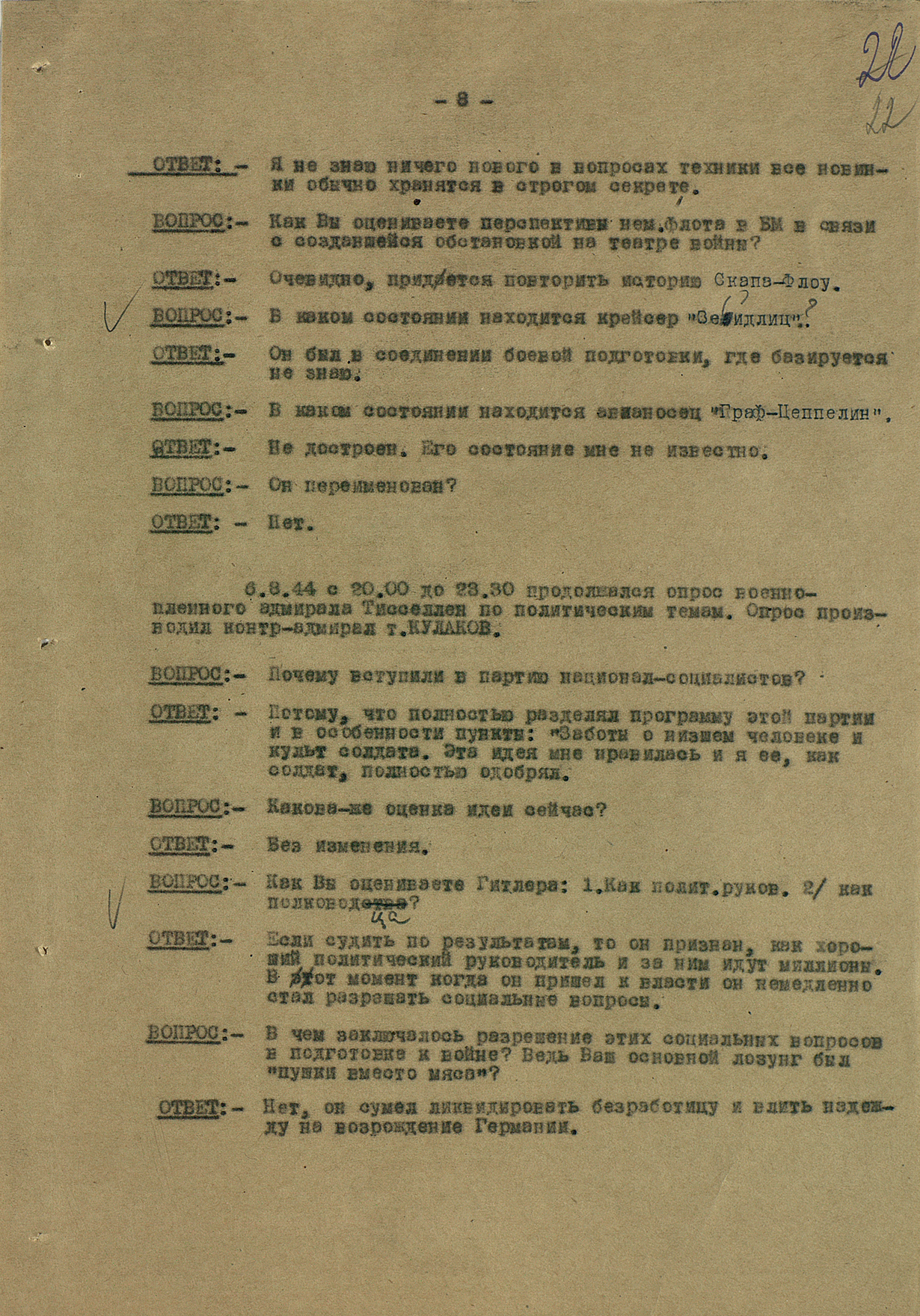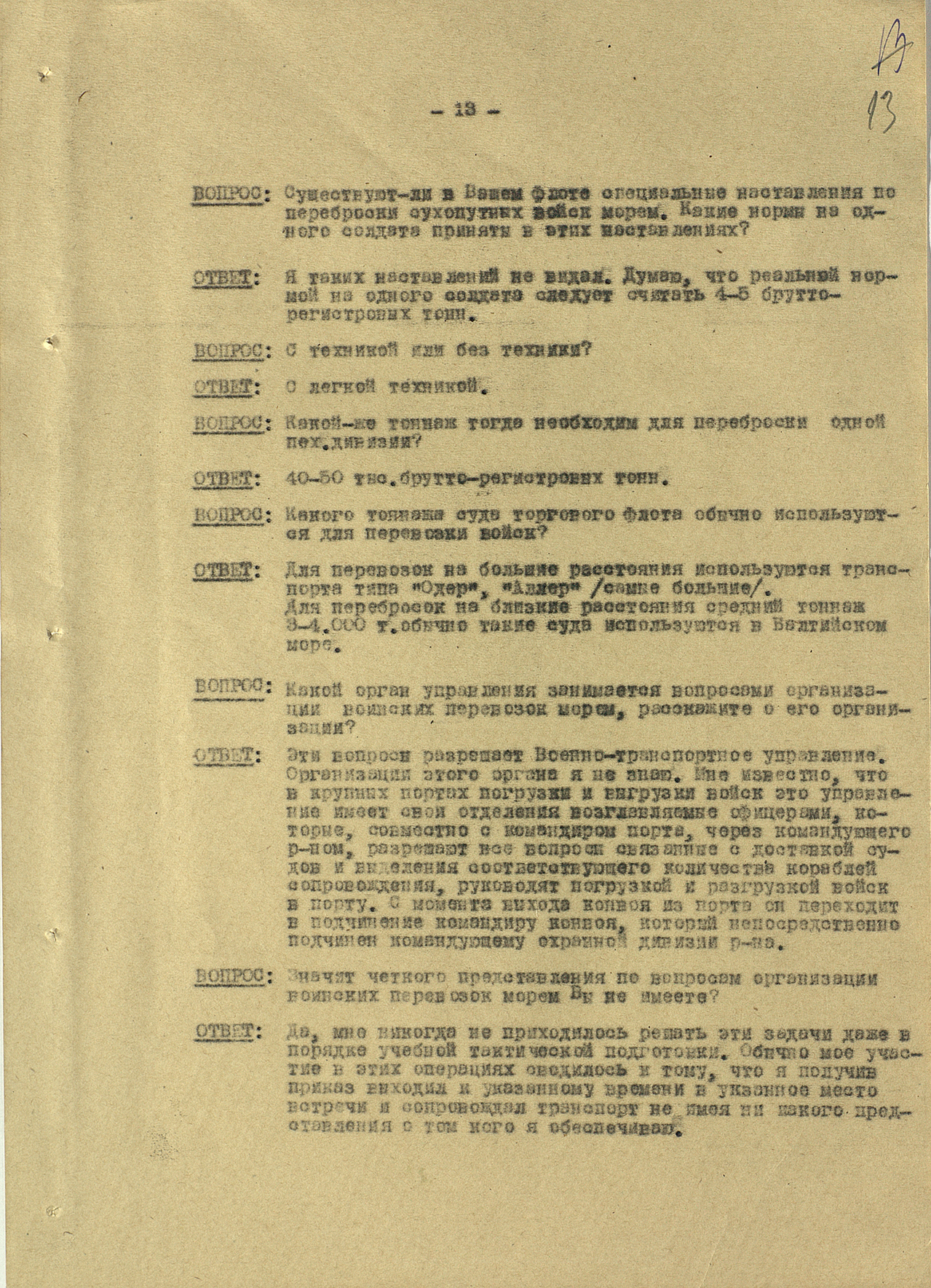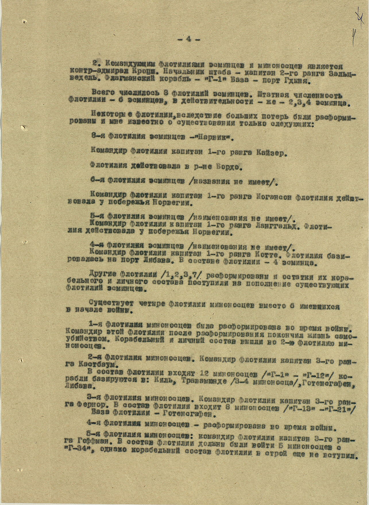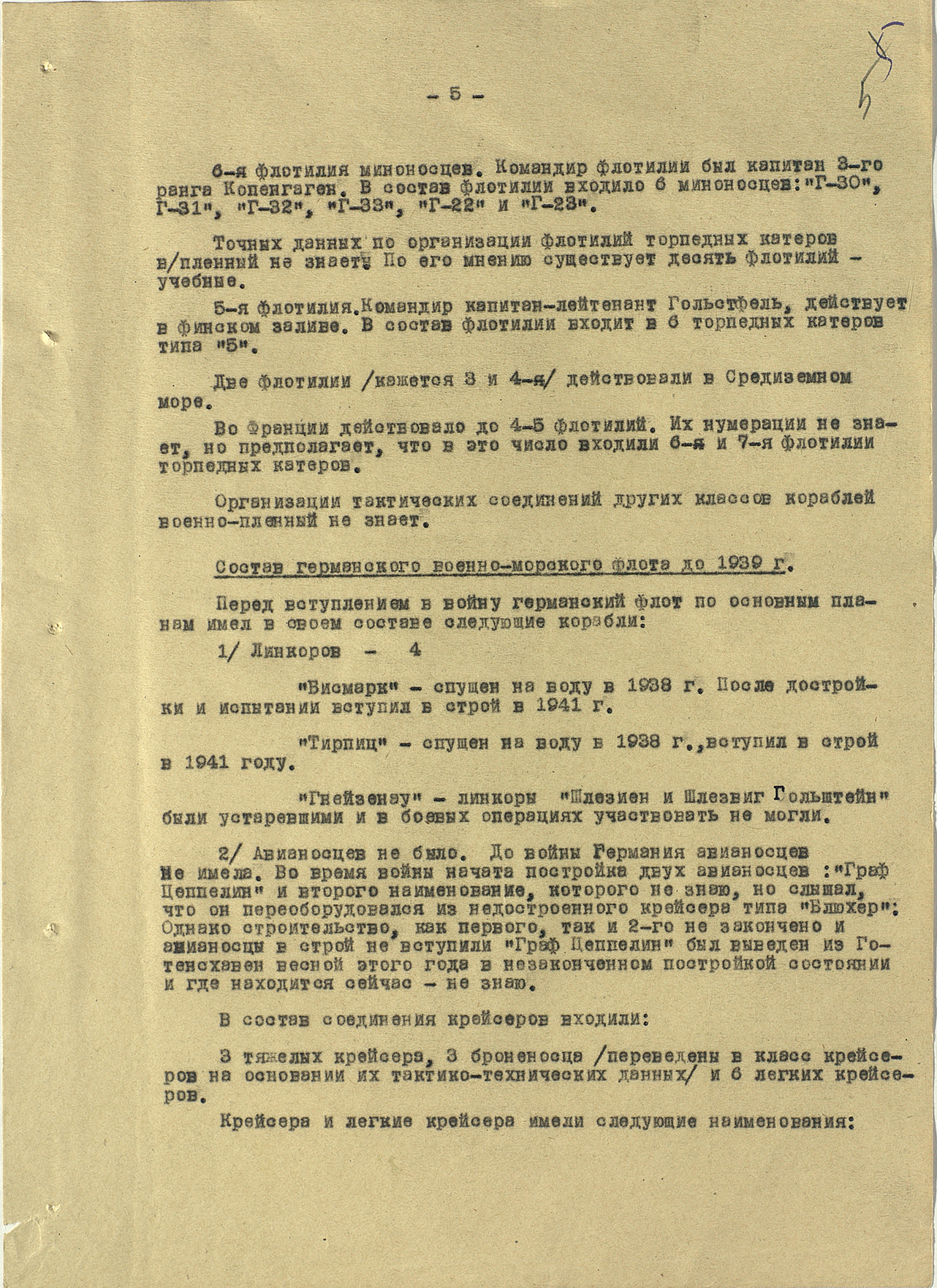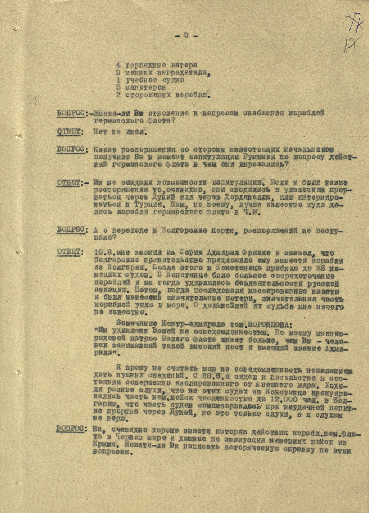 Мы видим из этого документа, что он подробно описал состав немецкого флота. Такое поведение характерно для офицеров высшего звена — обычно они держались два-три дня, но потом понимали, что уже не уйти. Они подробно описывали либо структуры армии, либо ход военных действий. Я еще не встречал ни одного протокола, где допрашиваемый назвал бы только имя и должность.