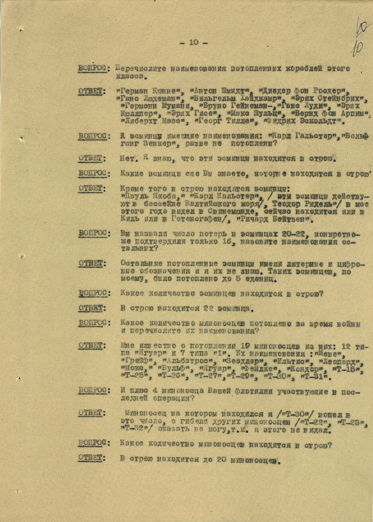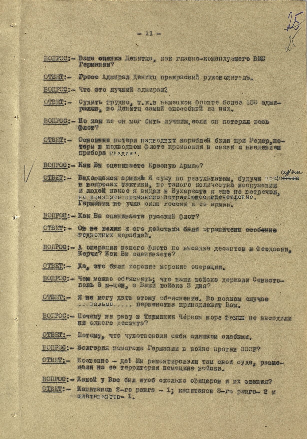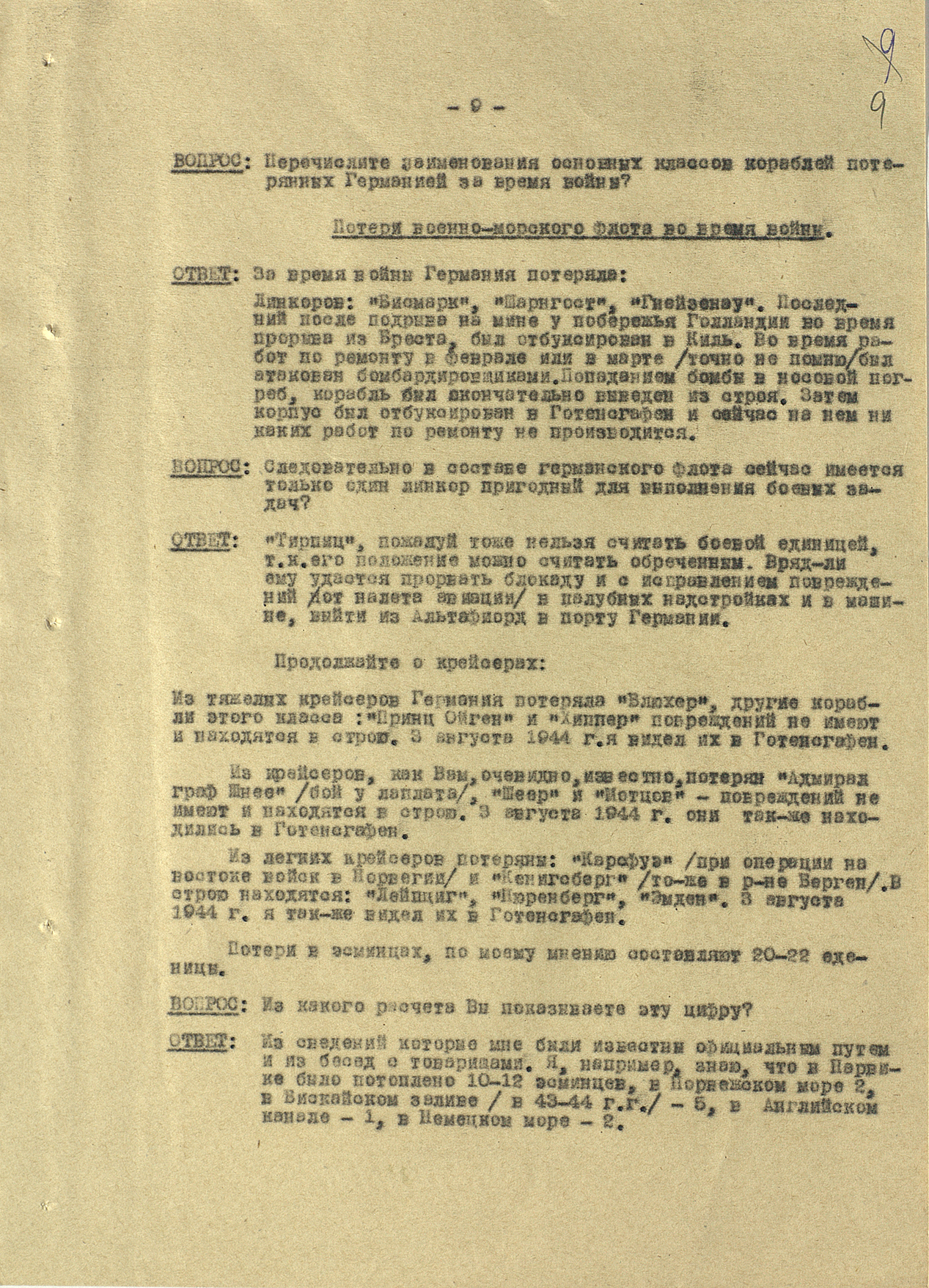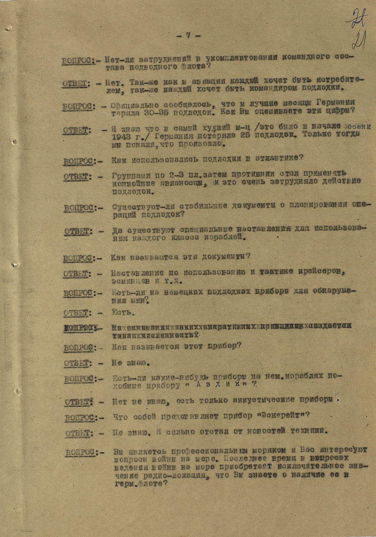 Мы видим из этого документа, что он подробно описал состав немецкого флота. Такое поведение характерно для офицеров высшего звена — обычно они держались два-три дня, но потом понимали, что уже не уйти. Они подробно описывали либо структуры армии, либо ход военных действий. Я еще не встречал ни одного протокола, где допрашиваемый назвал бы только имя и должность.