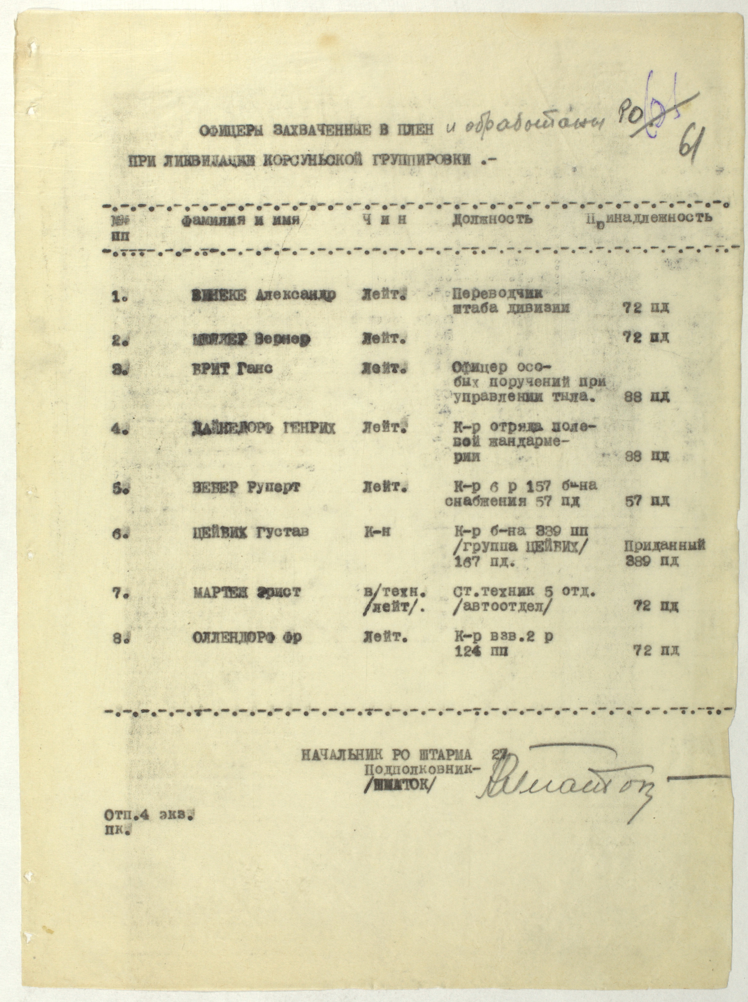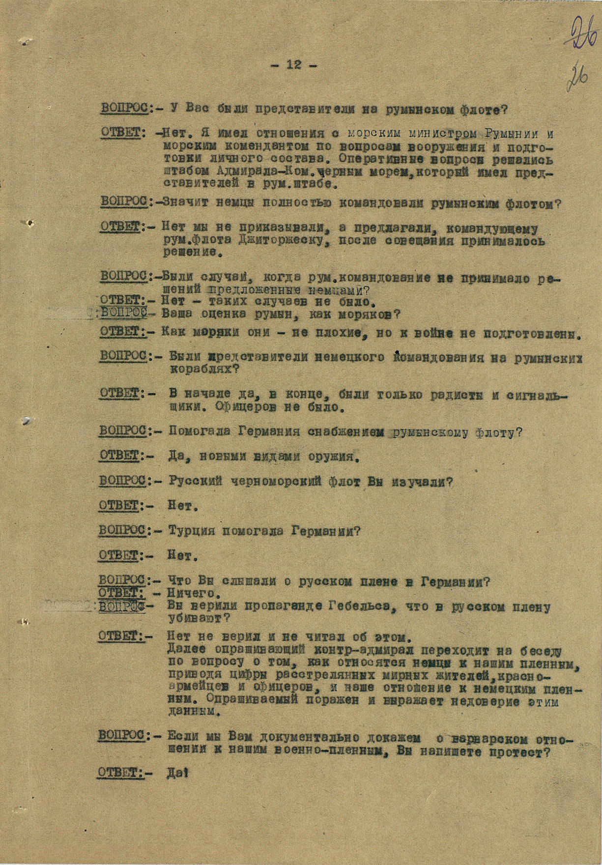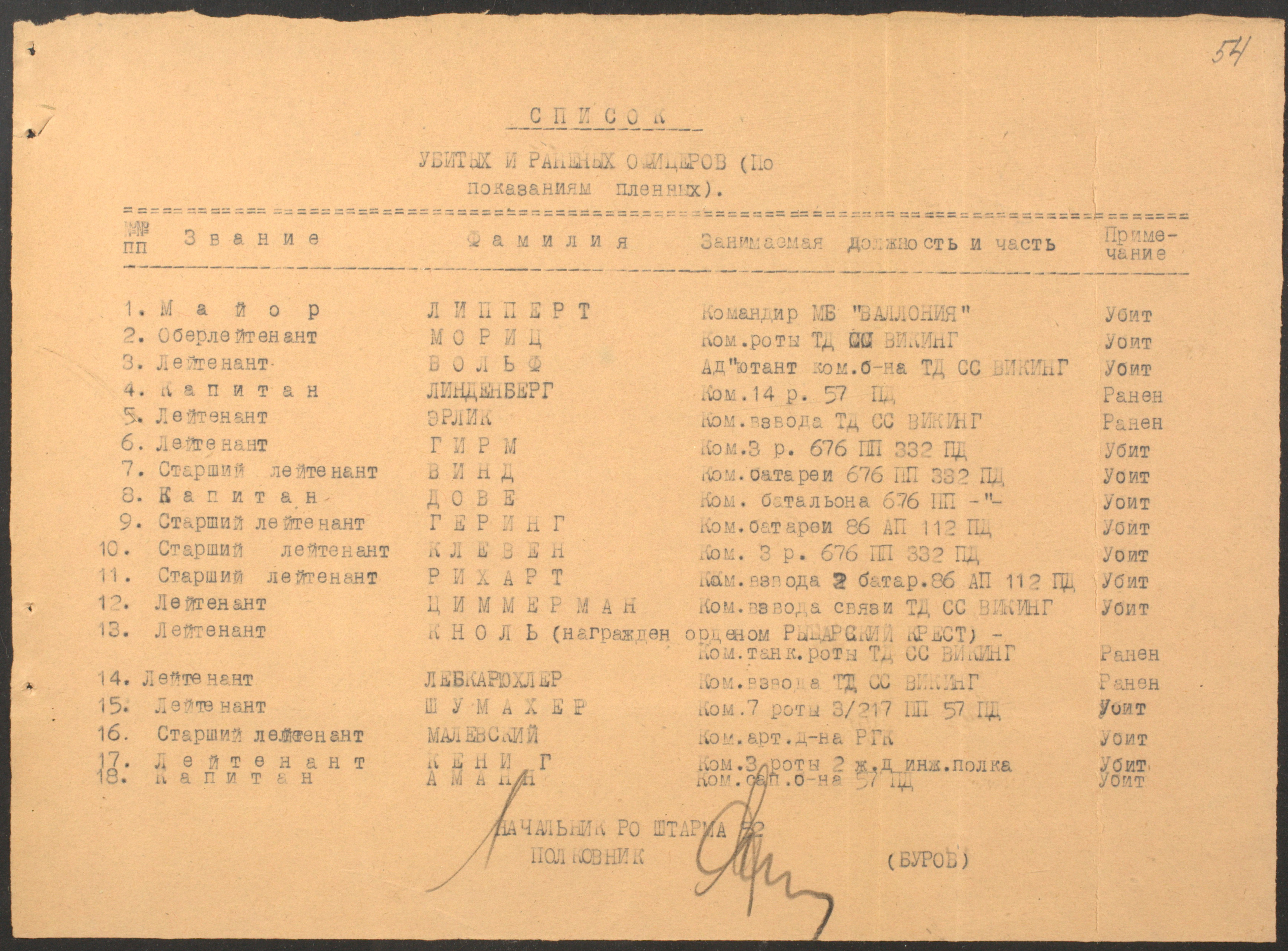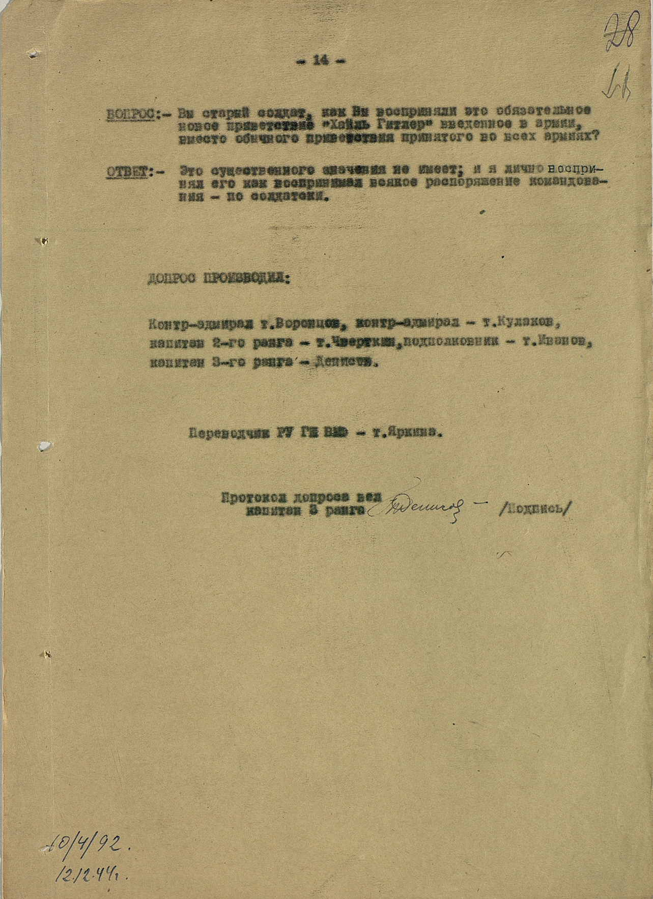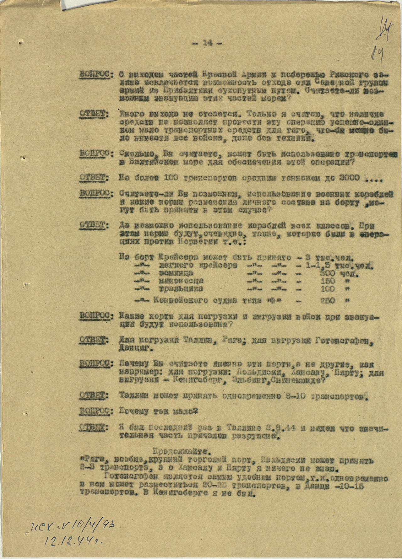 Мы видим из этого документа, что он подробно описал состав немецкого флота. Такое поведение характерно для офицеров высшего звена — обычно они держались два-три дня, но потом понимали, что уже не уйти. Они подробно описывали либо структуры армии, либо ход военных действий. Я еще не встречал ни одного протокола, где допрашиваемый назвал бы только имя и должность.