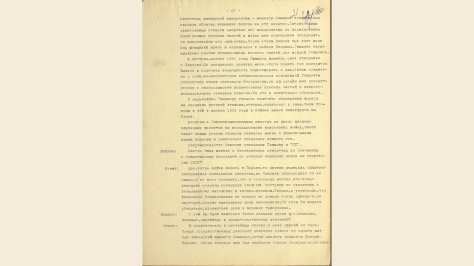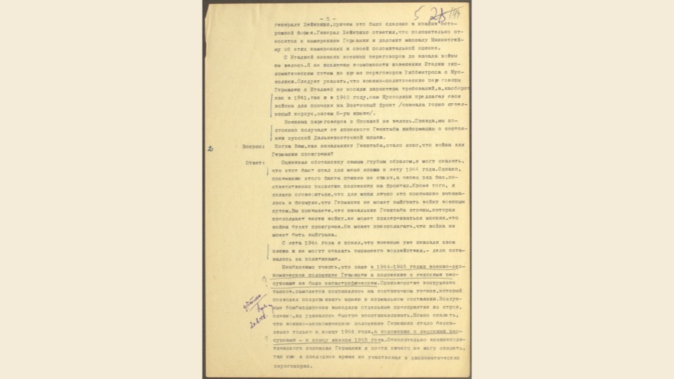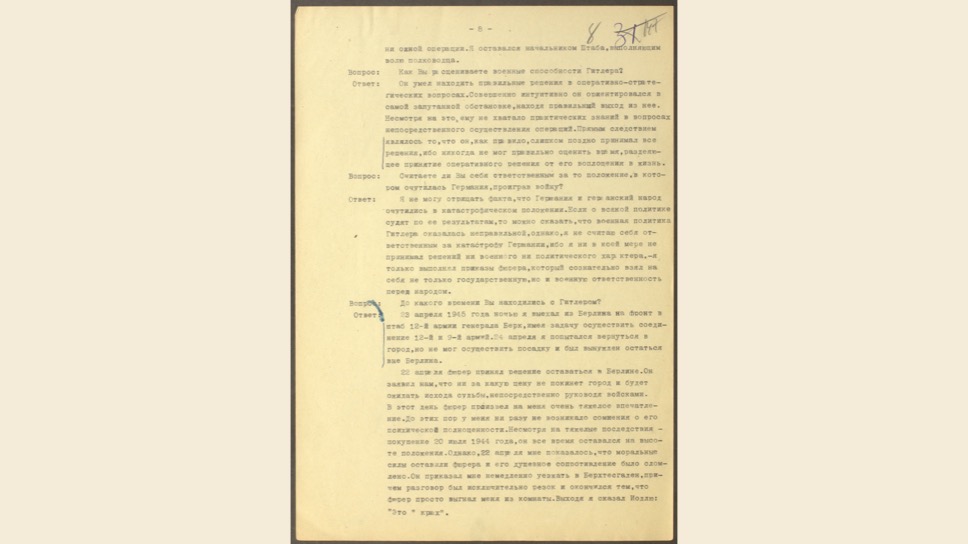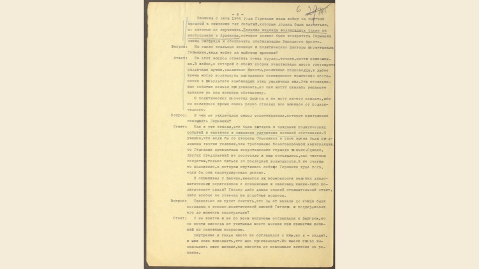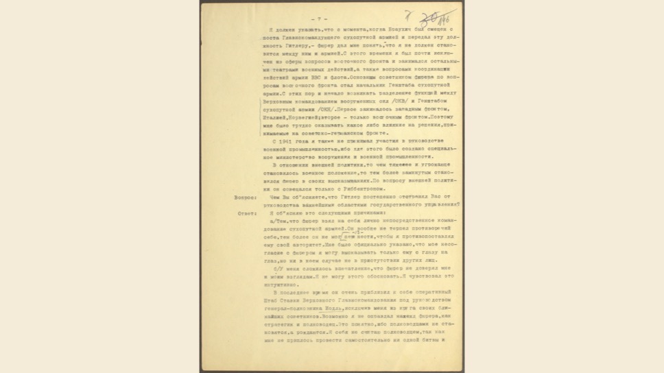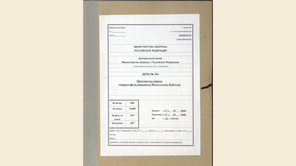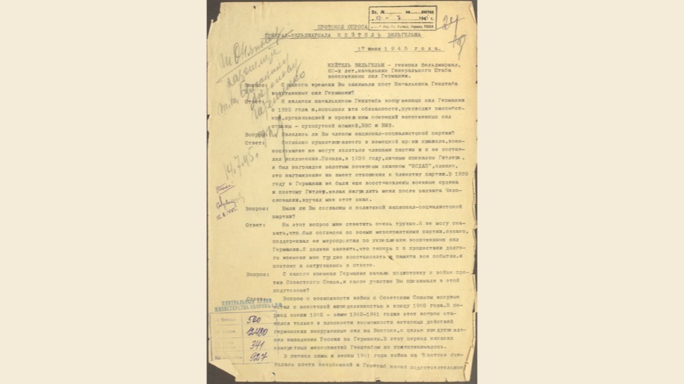 Маттиас Уль: Это очень интересный, уникальный документ. Вильгельм Кейтель был в плену у американцев, но между Жуковым и Эйзенхауэром был заключен договор о том, что советские специалисты могут допросить верхушку Третьего Рейха. Позже Кейтель был казнен, как один из главных военных преступников.