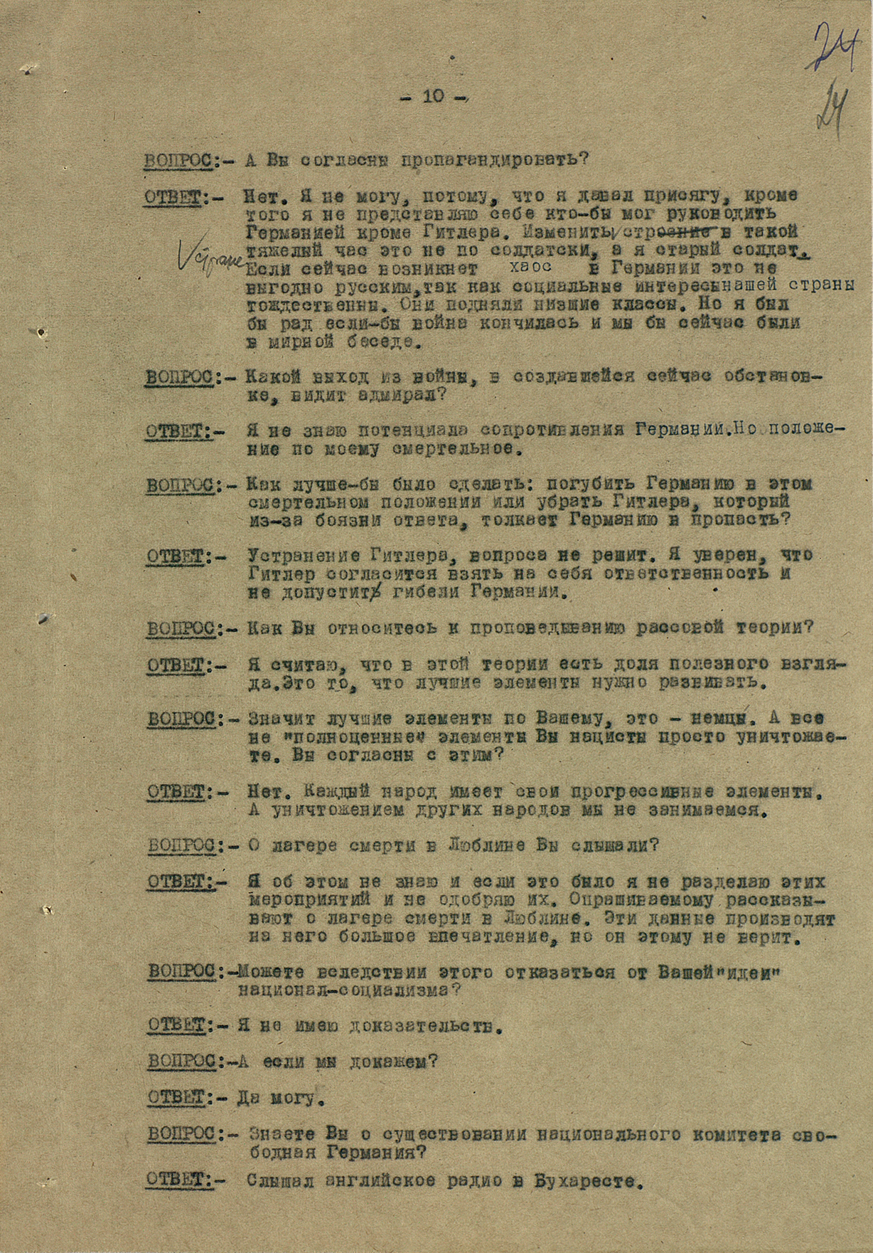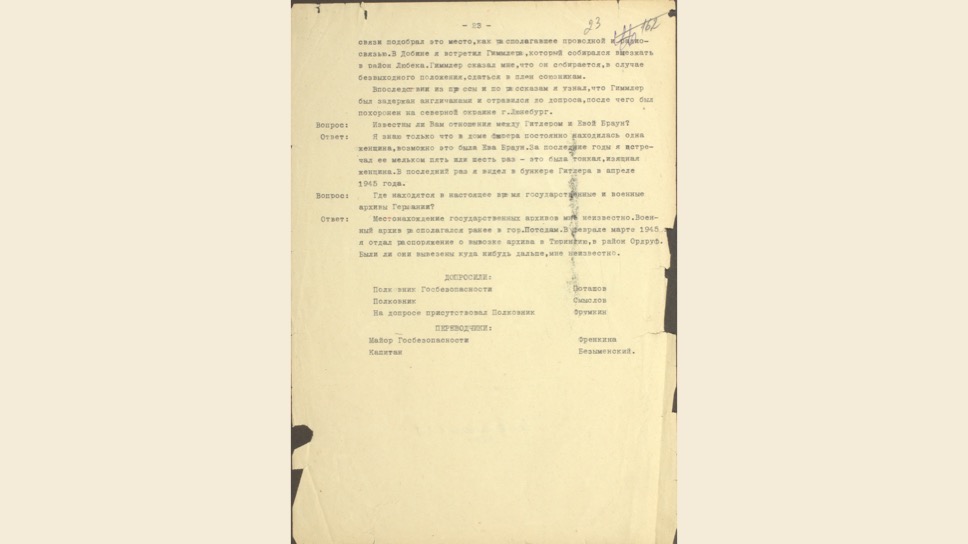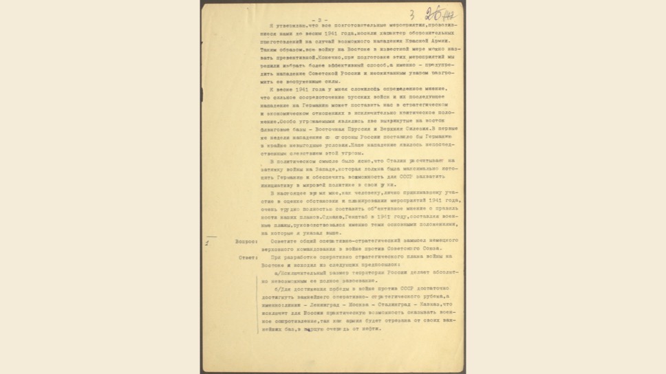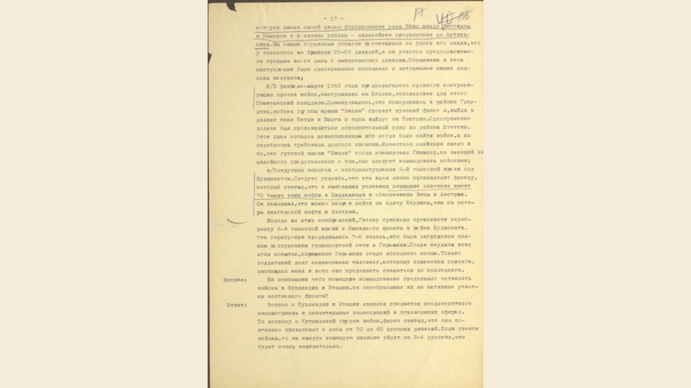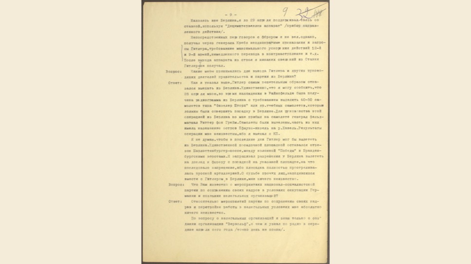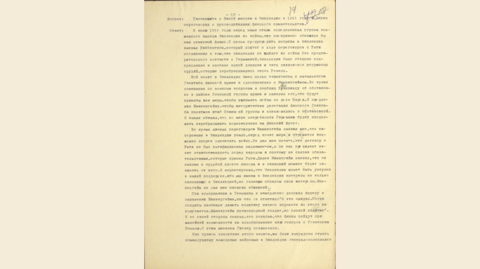 Маттиас Уль: Это очень интересный, уникальный документ. Вильгельм Кейтель был в плену у американцев, но между Жуковым и Эйзенхауэром был заключен договор о том, что советские специалисты могут допросить верхушку Третьего Рейха. Позже Кейтель был казнен, как один из главных военных преступников.