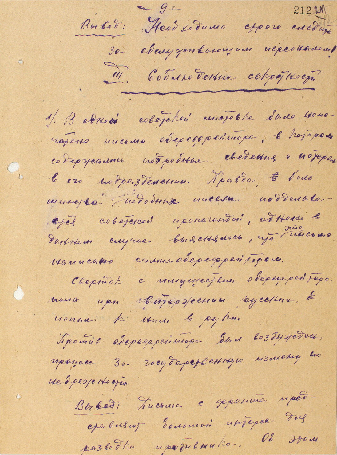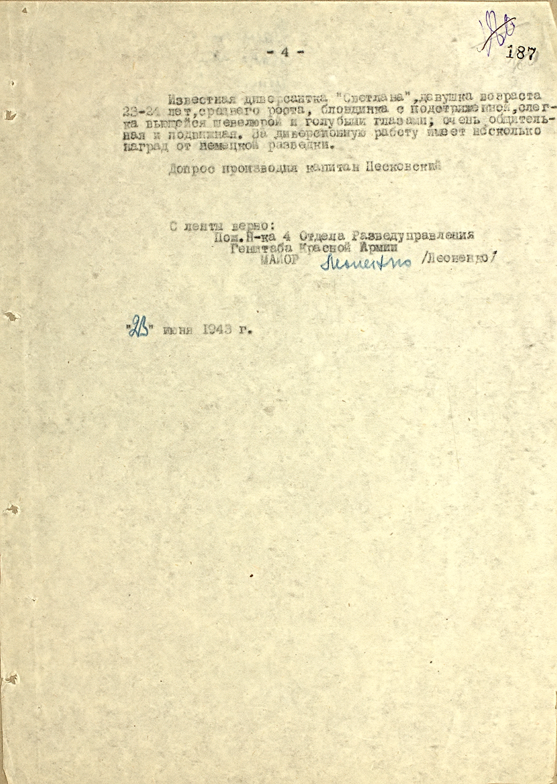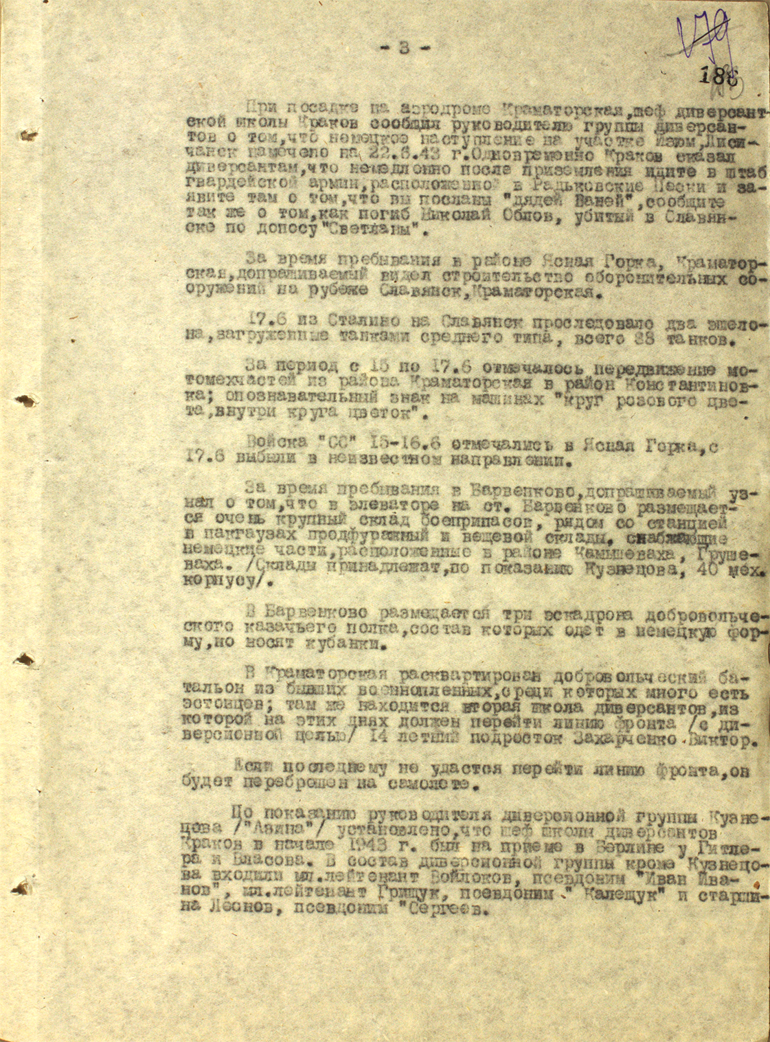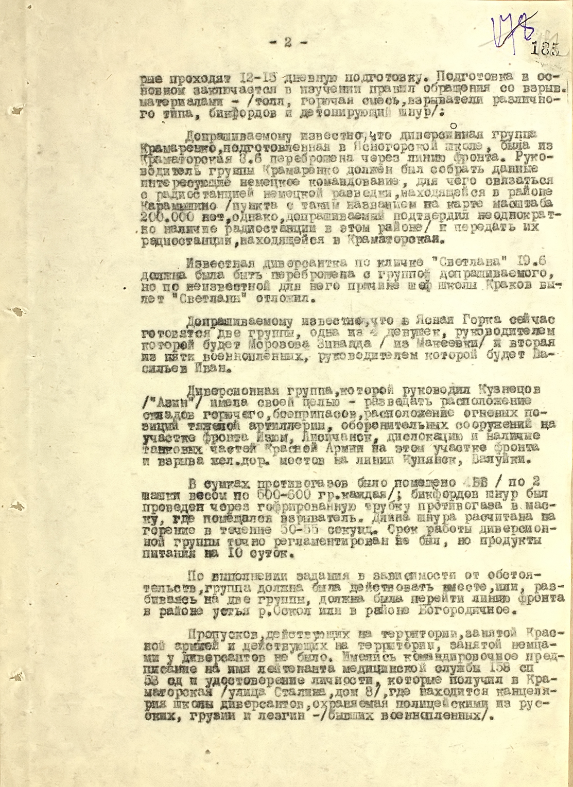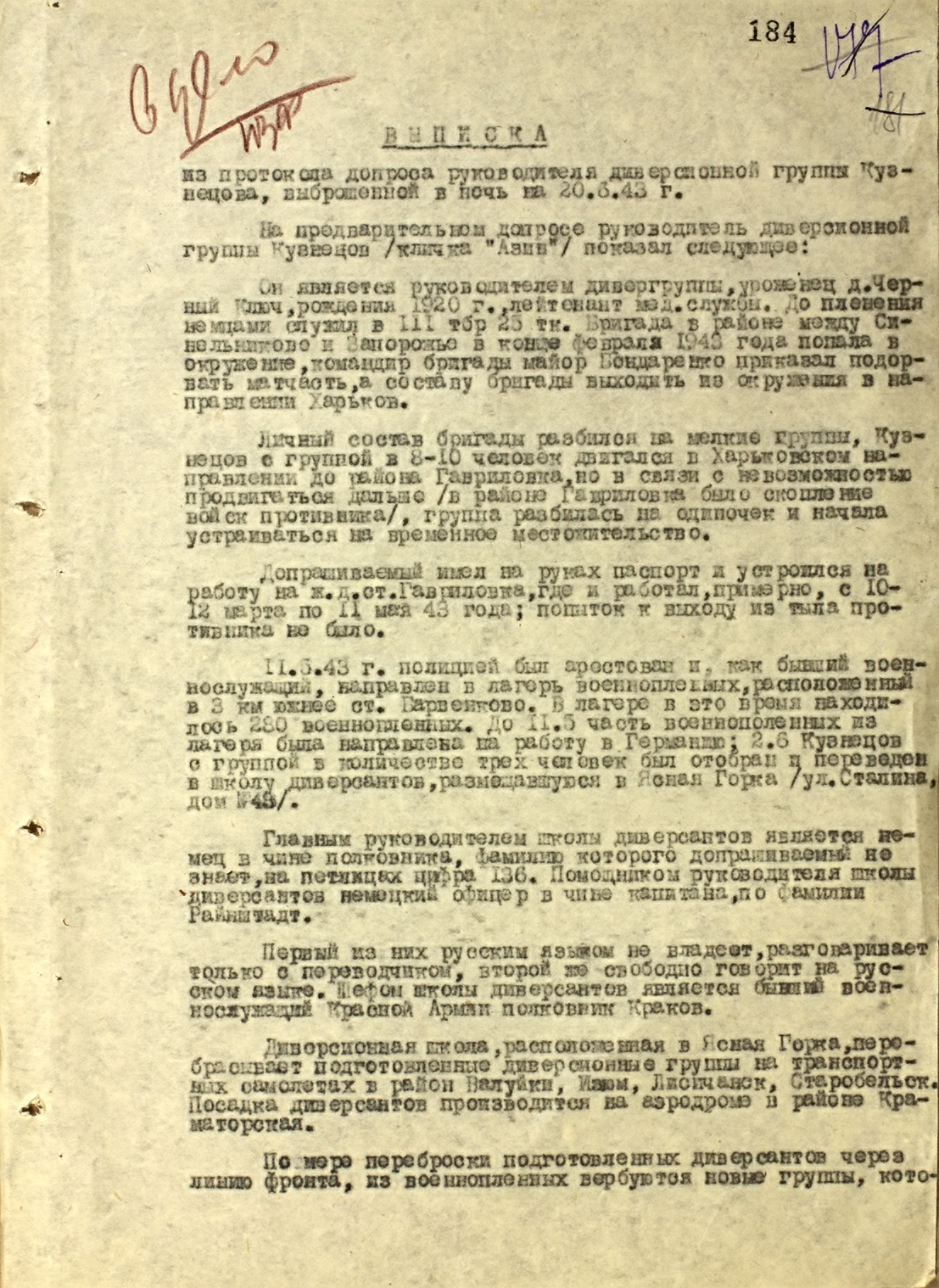 Выписка из протокола допроса советского руководителя диверсионной группы, действовавшей по заданию германской разведки за линией советского фронта — 1943 г.