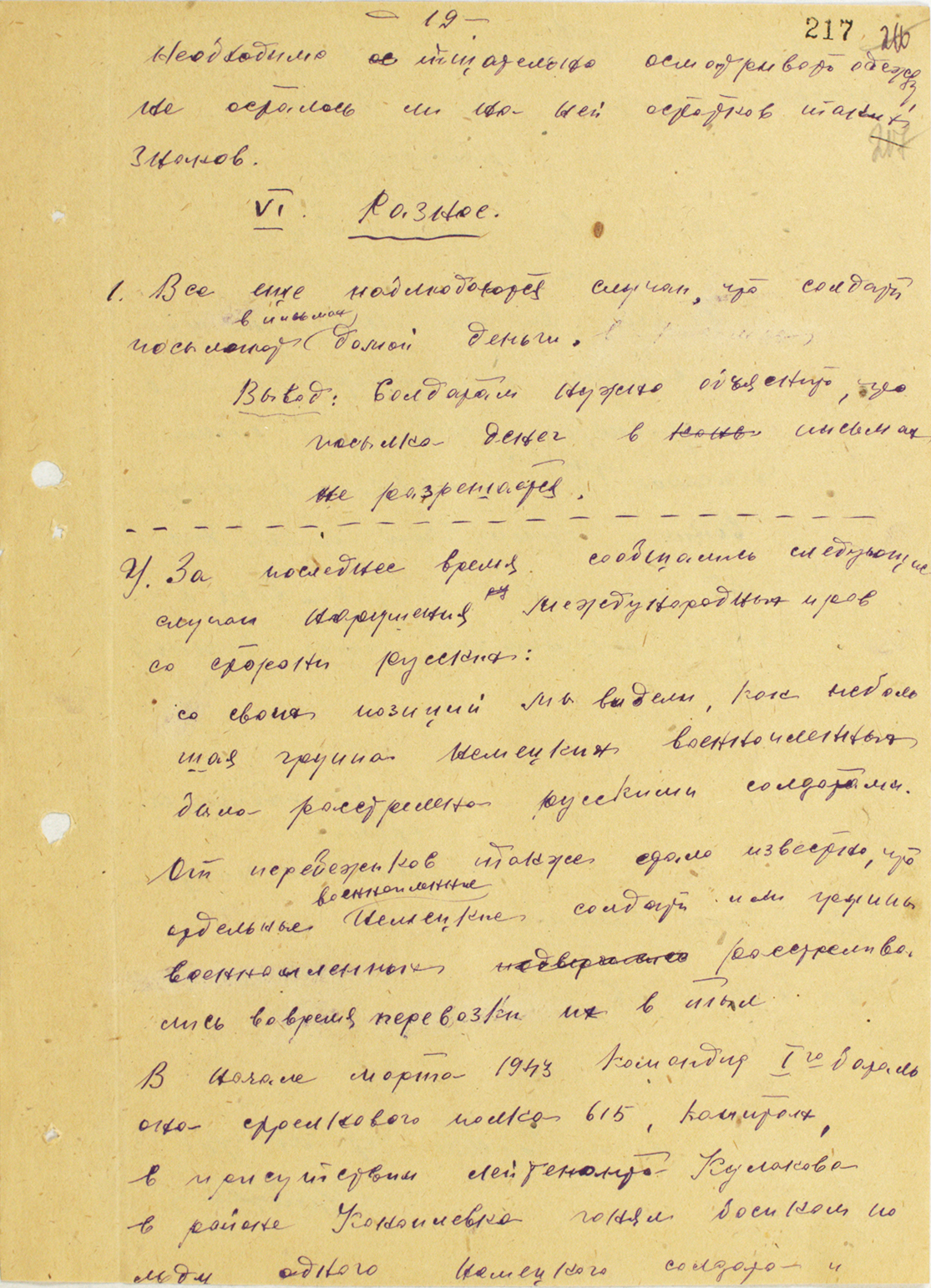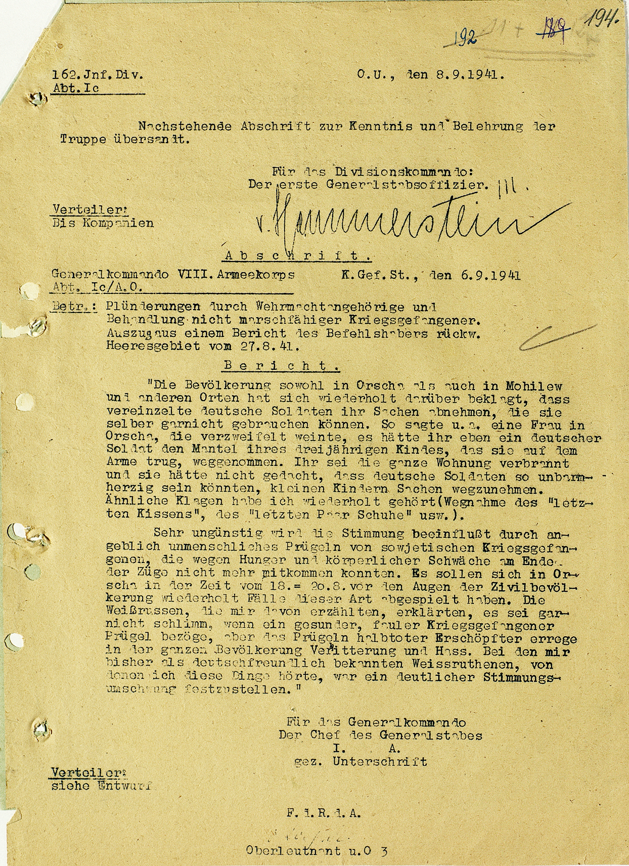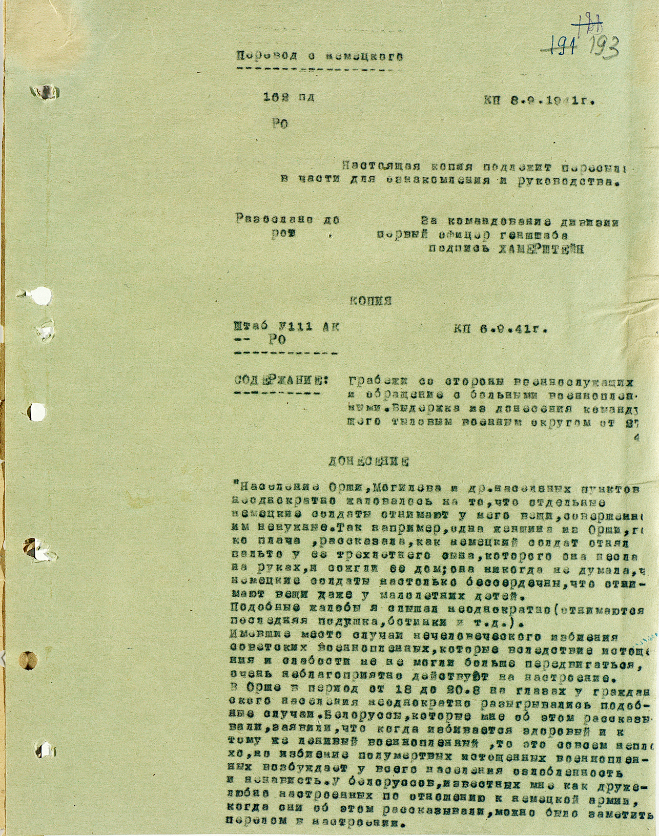 Донесение о случаях грабежей со стороны немецких военнослужащих и жестокого обращения с советскими военнопленными — 1941 г.