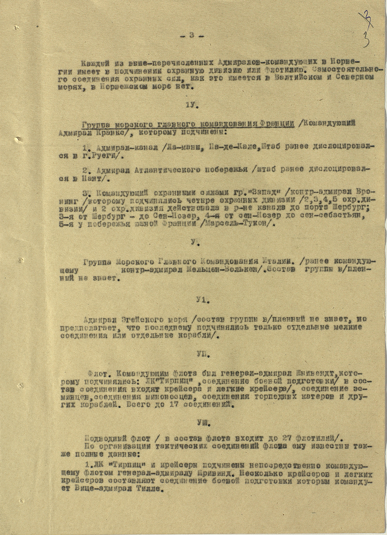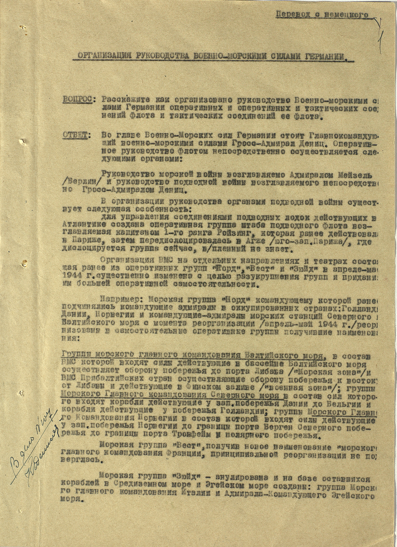 Протокол допроса адмирала Вернера Тиллессена об организационной структуре военно-морского флота Германии — 1944 г.