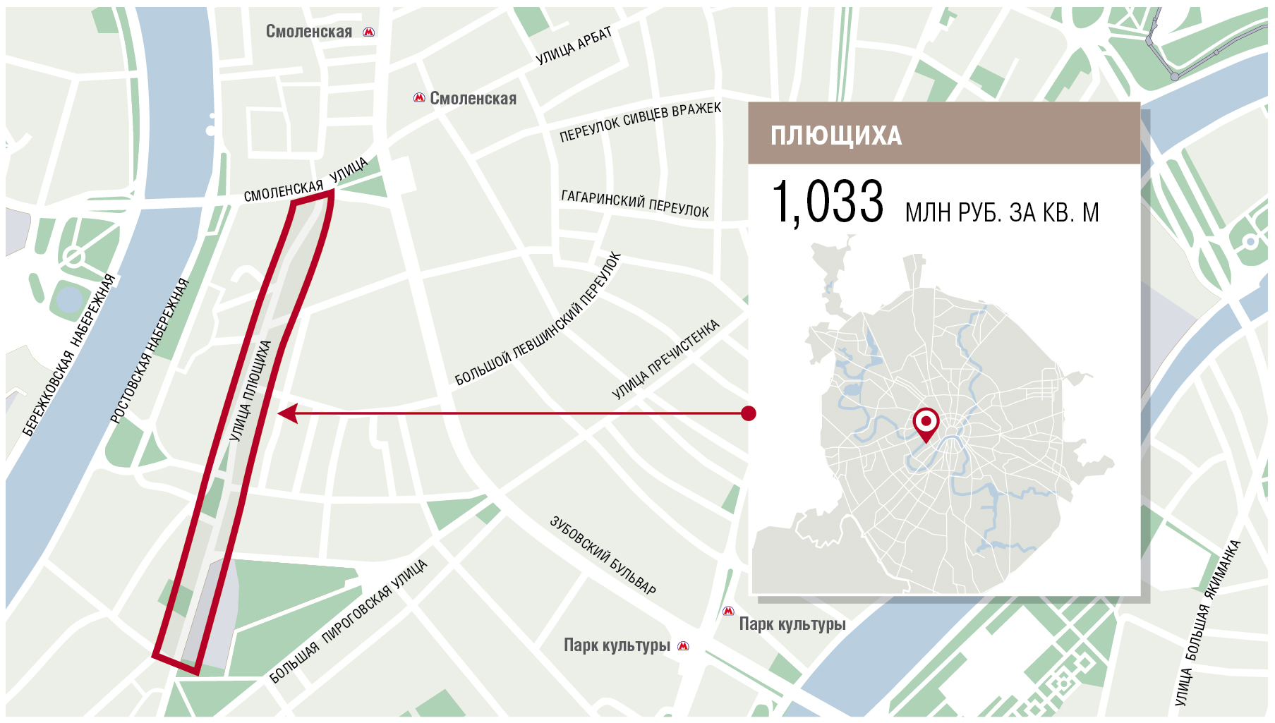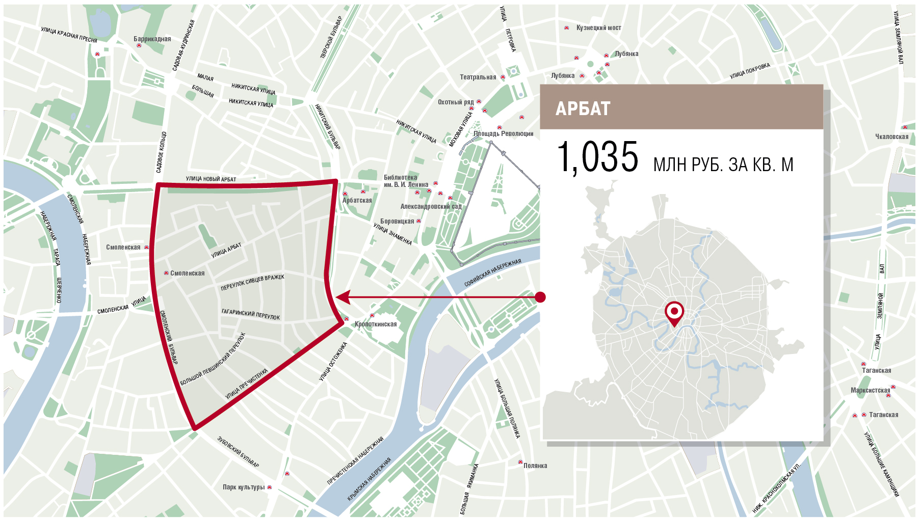 Месторасположение: Центральный административный округ, граница района проходит от Арбатских ворот до Смоленской площади, далее от Пречистенки до Нового Арбата.