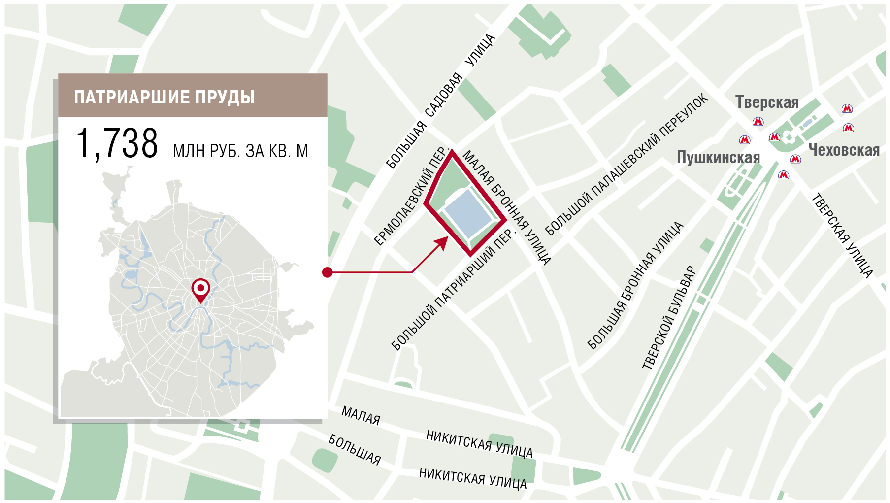 Месторасположение: Центральный административный округ, район ограничен Малой Бронной улицей, Большим Патриаршим переулком, Малым Патриаршим переулком и Ермолаевским переулком.