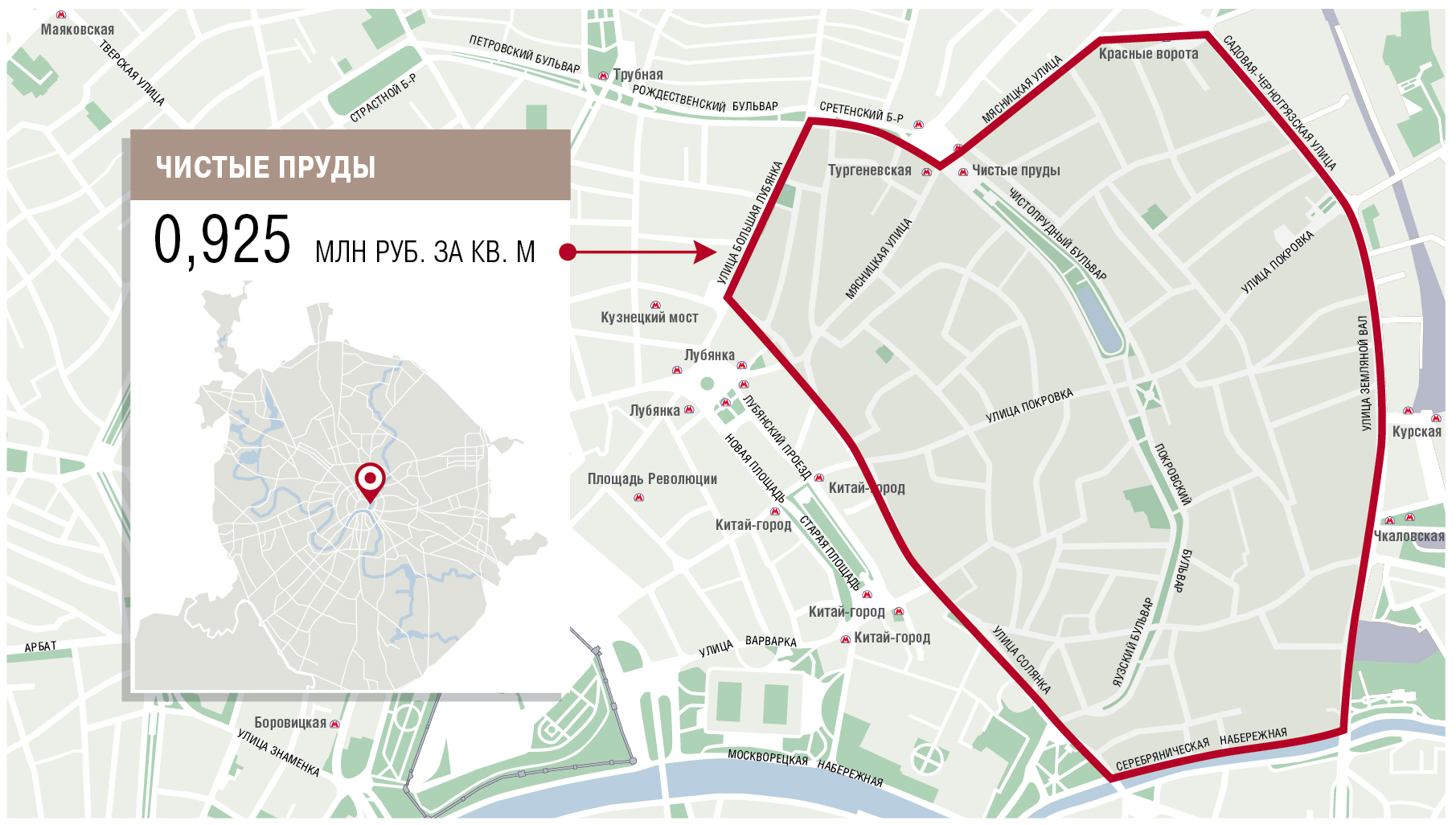 Месторасположение: Центральный административный округ, на севере граничит с Мясницкой улицей и проспектом Академика Сахарова, на востоке — с Садовой-Черногрязской улицей, на юге — до Серебрянической набережной вдоль реки Яузы, на западе — с Новой площадью и Большой Лубянкой.