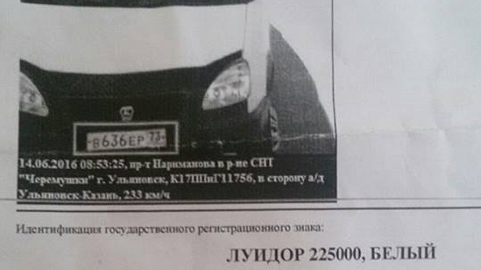 В квитанции о нарушении ПДД сообщается, что 14 июня 2016 года на проспекте Нариманова в Ульяновске водитель микроавтобуса «ГАЗель Луидор 225000» двигался со скоростью 233 км/ч. При этом на фотографии, где зафиксирован автомобиль, водитель даже не держит руками руль.
