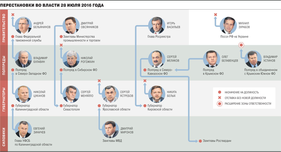 Президент России провел одну из самых крупных кадровых перестановок во власти. Он сменил глав четырех федеральных округов и четырех регионов, уволил главу Федеральной таможенной службы Андрея Бельянинова, губернатора Кировской области Никиту Белыха и губернатора Ярославской области Сергея Ястребова, объединил Крымский федеральный округ с Южным. Тогда же был подписан указ об увольнении посла России на Украине Михаила Зурабова. Чем объясняется такая масштабная рокировка, и как она выглядит — в материалах «Ъ».