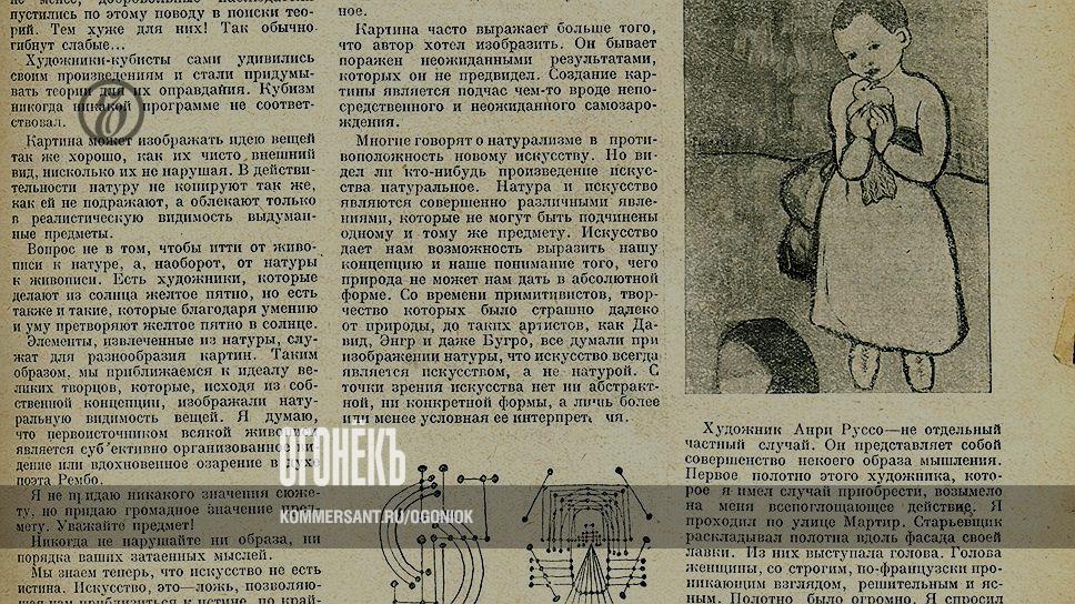90 лет назад "Огонек" опубликовал письмо Пабло Пикассо. "Ценнейший мастер нашего времени, угадавший зрительное настроение эпохи", по просьбе редакции объяснил читателям, что такое кубизм, и сопроводил свои соображения иллюстрациями. "Меня обычно представляют искателем. Но я не ищу, я нахожу,— так начиналось письмо Пикассо в "Огонек".— Я пытаюсь изображать то, что нашел... В искусстве намерения не имеют значения. Испанская пословица утверждает: "Любовь доказывается делами, а не словесами"". Пикассо рассказывает в письме краткую историю кубизма: "В 1906 году влияние Сезанна все собой покрыло. Понимание искусства композиции, противоположение форм и ритма красок сделались достоянием всех... Я понял, что живопись имеет самодовлеющую ценность, независимую от реального изображения предметов. Я спрашивал себя, не нужно ли скорее изображать вещи такими, как их знают, чем такими, как их видят... Математику Прэнсэ, присутствовавшему на наших эстетических диспутах, пришла мысль придумать специальную геометрию для художников... Глупцы захотели сейчас же из этого вывести какие-то законы и общие правила, чтобы объяснить мне, как нужно писать, в то время как каждая картина является для меня не концом, не достижением, а счастливым случаем или опытом". "Я был поражен привлекательным видом карт небесного свода,— рассказывал художник читателям "Огонька".— Я нарисовал однажды массу таких точек, соединенных линиями, линий, объединенных между собой, и пятен, будто повисших в небе. Я думал как-нибудь ими воспользоваться и ввести их, как чисто графический элемент, в одну из своих композиций. Но посмотрите, как эти сюрреалисты умны! Они нашли, что эта графика больше всего отвечает их абстрактным идеям... Что за мания вечно вдохновляться творчеством современников! Я испытываю какую-то телесную, физическую неловкость всякий раз, когда вижу, что мне подражают". "Кубизм объяснили математикой, геометрией, психоанализом — все это только литература! — завершал Пикассо письмо в "Огонек".— Кубизм никогда никакой программе не соответствовал".