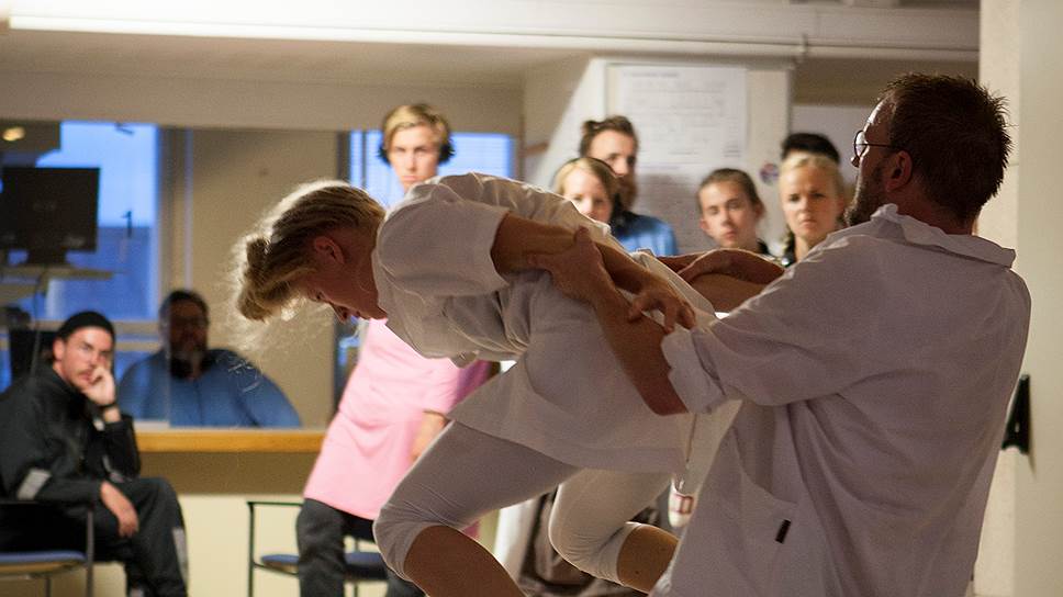 Следуя за ней, ваш корреспондент оказалась в предбаннике, где ее облачили в защитный комбинезон и направили в бассейн, воду в котором заменяли пластиковые шарики. Художник "Нейромана" Айно Коски почти повторил инсталляцию "Термальная ванна", представленную группой "France Distraction" на недавнем Венском фестивале. Но там "купание" было веселым, а здесь тонуть в шариках пришлось в темноте, а рядом, как клешни, шевелились чьи-то конечности. После ванной мы оказались в соседней палате — там на экране телевизора врач читал лекцию на финском. Бегущая строка английских титров сводилась к вопросу: как быть с тем фактом, что мы и продукт эволюции, и мыслящие личности? Вообще, английский перевод в "Нейромане", основанном на одноименном, неизвестном в России романе Яакко Юли-Йуоникаса, был очень скуп, впрочем, слов в действе, которое равно возможно назвать тотальной инсталляцией, отнести к жанру сайт-специфик и к физическому театру, было мало. Слова требовались только в тесном кабинете, где пациент, оказавшись за столом у врача, получал под нос микрофон. Врач что-то спрашивал — тоже в микрофон — и направлял лампу в глаза пациенту. От допроса можно было ускользнуть, зайдя в бывший рентгеновский кабинет, где на широком столе и под ним извивалась таинственная медсестра. В узкой темной лаборатории по соседству ее коллега просто беззвучно двигалась, не обращая внимания на зрителей — от монитора к столу с пробирками. Но присутствовать при этом было так же "уютно", как если оказаться внутри фильма Тарковского "Сталкер", персонажей которого каждую секунду ждала какая-нибудь шутка Зоны.