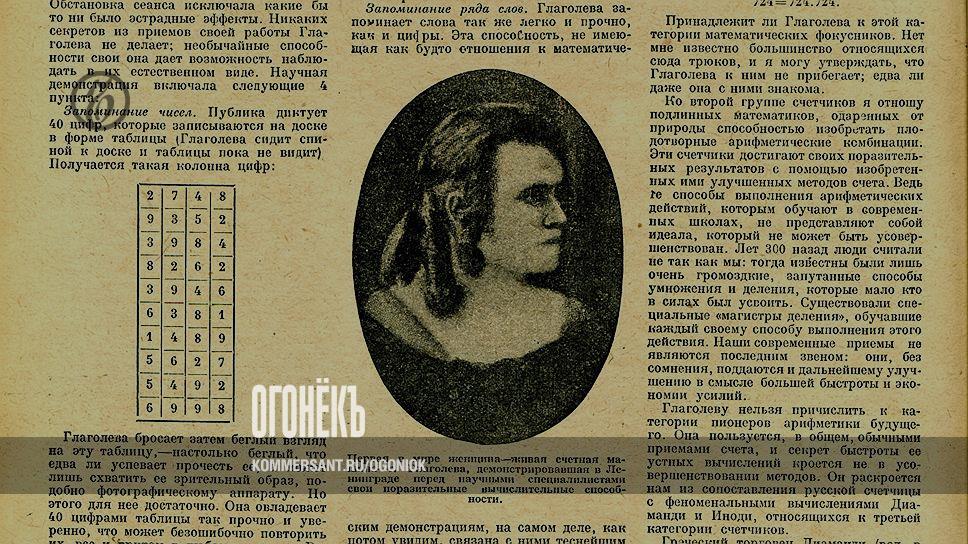 90 лет назад "Огонек" писал о диковинном явлении — "живых счетных машинах". Речь шла о "выдающихся вычислителях, выполняющих в уме поразительно быстро самые сложные счетные операции". "В мире их очень немного, и к ним мы вправе присоединить теперь еще одно имя — русской счетчицы Глаголевой,— сообщал журнал.— Эта 19-летняя девушка — первая, кто заслуживает стать рядом со всемирно известными счетчиками Диаманди и Иноди". "Огонек" знакомил читатетелей с гениями счета: "Греческий торговец Диаманди (род. в 1868 году) запоминал группу из 50 цифр в 7 минут, из 100 цифр — в 25 минут, из 200 цифр — в 2 часа 15 минут. Благодаря этой способности он быстро (в 4,5 минуты) перемножал в уме 5-значное число на 5-значное... Его ровесник, французский крестьянин Иноди, выполнял подобные операции еще быстрее: два 5-значных числа он перемножал в 40 секунд". "Мне пришлось наблюдать Глаголеву, когда она демонстрировала свои феноменальные способности перед научными специалистами в Ленинграде,— делился впечатлениями с "Огоньком" Яков Перельман, знаменитый математик и популяризатор точных наук.— Обстановка сеанса исключала какие бы то ни было эстрадные эффекты. Научная демонстрация включала в себя запоминание чисел, вычисление в уме, вычисление календарных дат. Глаголева бросила беглый взгляд на таблицу с 40 цифрами и потом смогла безошибочно повторить их. Трехзначные числа она возвышает в квадрат и в куб почти так же быстро, как однозначные, извлекает кубический корень из 9-значного числа меньше чем за 40 секунд. Скорость выполнения этих вычислений недостижима для человека нормальных способностей". "Никаких секретов из своей работы Глаголева не делает,— объяснял журнал.— Она отличается необычайной зрительной памятью и силою воображения, как и ее иностранные визави. Диаманди и Иноди были обследованы в психической лаборатории профессора Бине, который установил: их тайна в исключительной точности и широте памяти, позволяющей им оперировать числами в уме легче, чем мы делаем это с пером в руке".