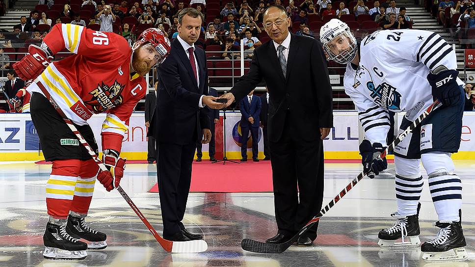 Перед матчем состоялись торжественное открытие и символическое вбрасывание, которые провели руководитель государственного управления по делам физической культуры и спорта КНР Лю Пэн (на фото второй справа) и заместитель председателя правительства России Аркадий Дворкович (второй слева), зачитавший приветственное послание президента России Владимира Путина.
