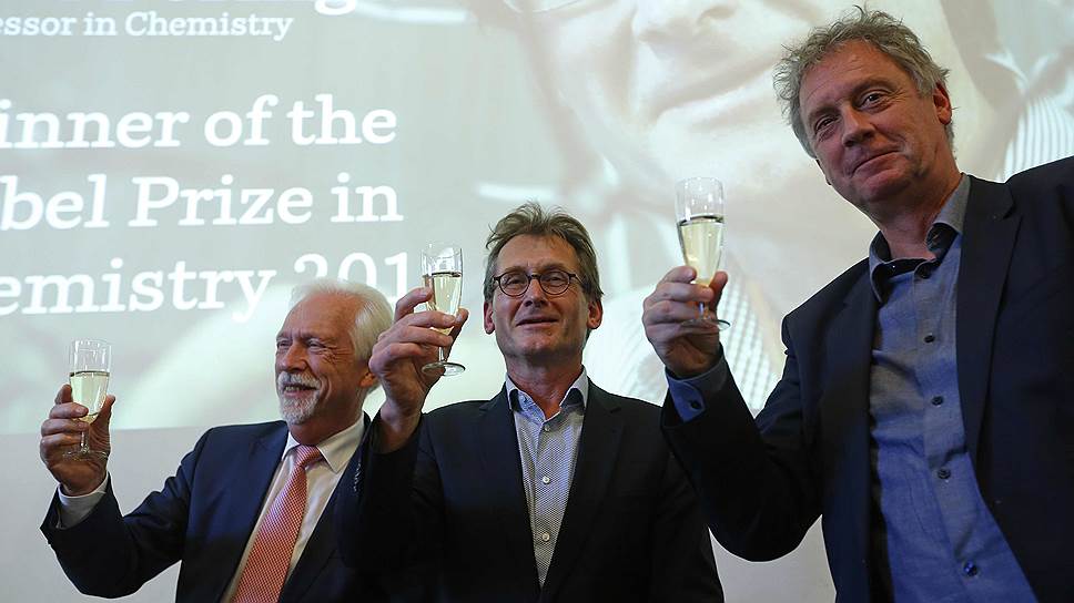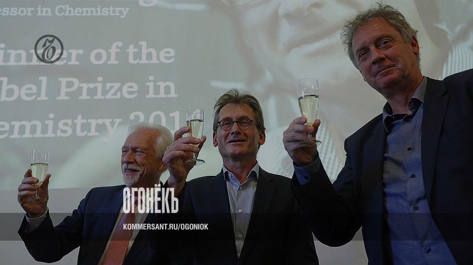 За Нобелевскую премию можно и шампанского выпить: на фото — один из лауреатов премии по химии Бернард Феринга (в центре), вместе с ректором Университета Гронингена, где он работает, Элмером Стеркеном (справа) и президентом того же университета Сибрандом Поппемой
