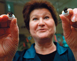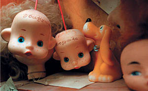 Безликие кукольные головы из конфетных ящиков обретают подобие индивидуальности после того, как на страшноватых агрегатах, напоминающих вдвое увеличенные швейные машинки, им вшивают волосы. Одна и та же голова относится к целому семейству, или, как говорят здесь, образу, кукол. К примеру, снабдили голову русыми волосами — получилась Маша, голубыми — вот вам и Мальвина. "Почему-то никто, кроме нас, не делает Мальвину с голубыми волосами,— кипятится Юрий Дмитриев.— С какими угодно делают, а с голубыми — только мы!"