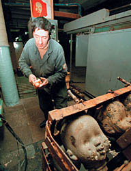 На участке сборки жутковато. В коробках, которыми уставлен пол,— груды маленьких розовых ручек, ножек, головок и прочих частей тела. "Это — ноги к Буратино, это — уши к зайцу",— бодро объясняет заместитель директора фабрики Юрий Дмитриев. Мой взгляд падает на коробку, в которой не меньше сотни голов. У голов закатились глаза. На коробке надпись: "Волшебная сказка".